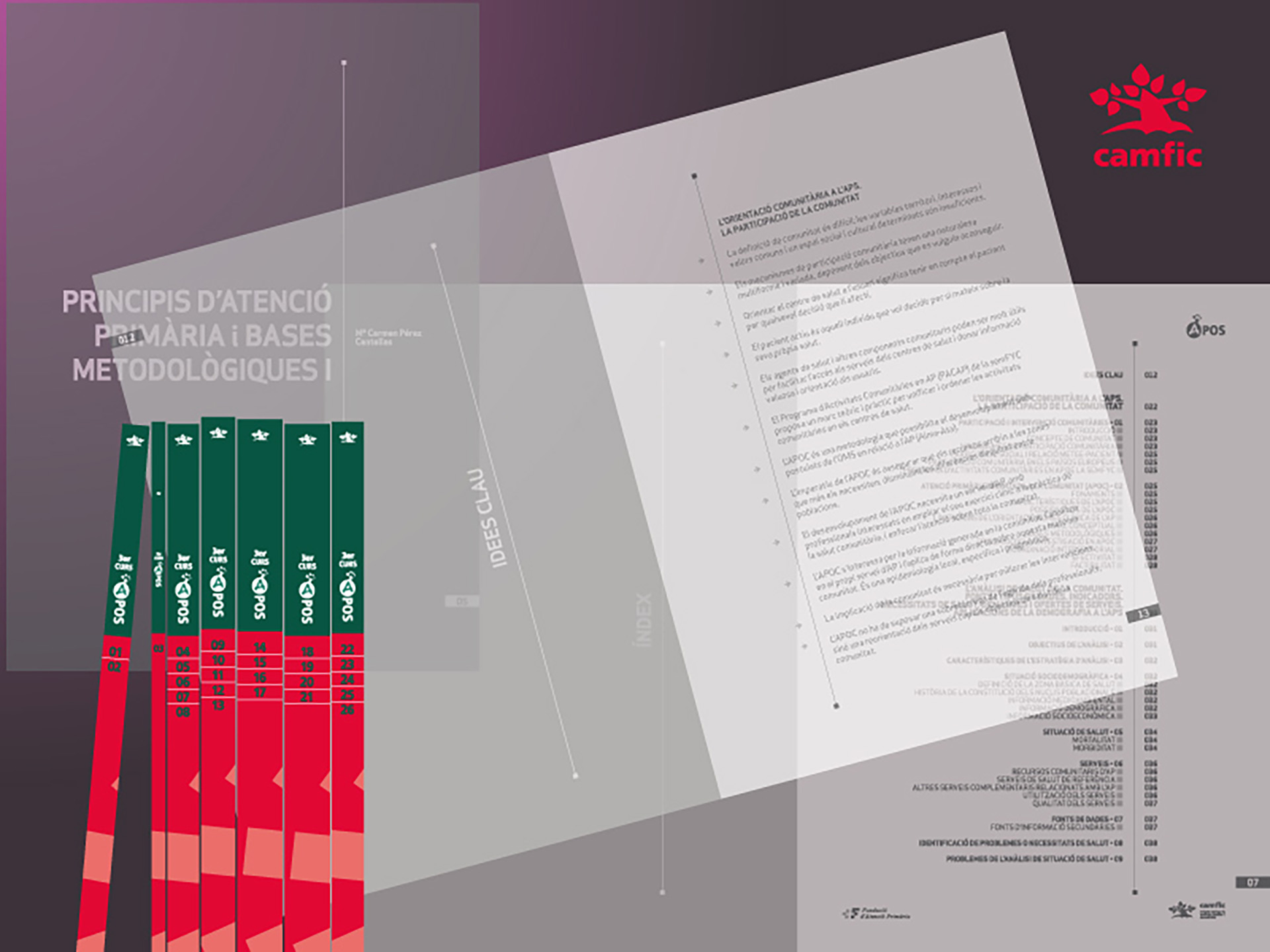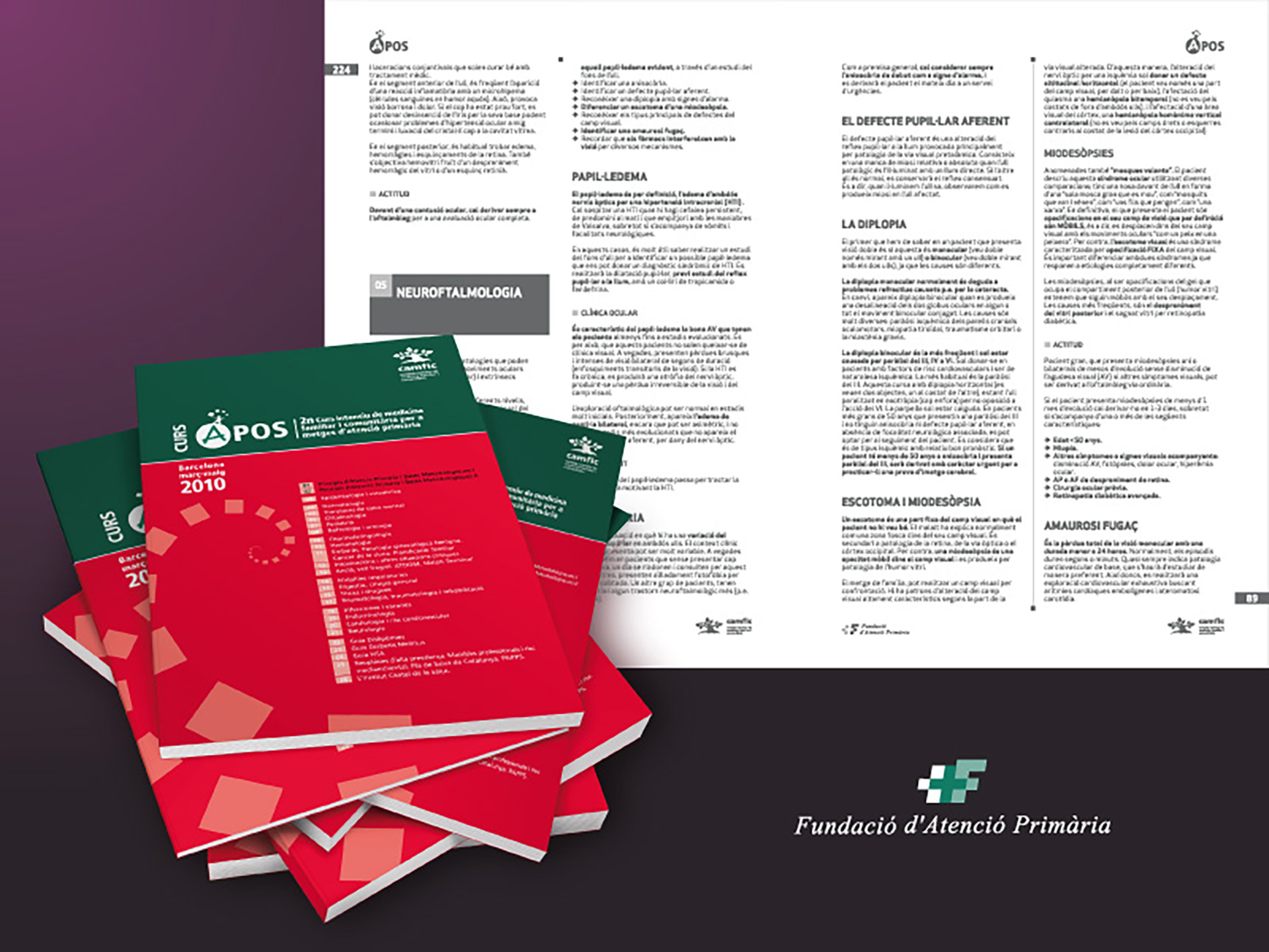 La CAMFiC m'encarrega la creació, maquetació i muntatge dels set toms que integren el curs APOS, corresponents al 3er Curs Intensiu de Medicina Familiar i Comunitària per a metges d'Atenció Primària • Aquest és un curs intensiu per a que, dit de forma senzilla, un metge pugui accedir a una plaça fixa • Un cop arribat a l'eix de comunicació gràfica desitjat, entrem en un treball de disseny editorial molt interessant i amè de fer, tot i la gran quantitat de pàgines a maquetar • Marta, Anna i Juancho (doctors coordinadors del curs) eren els nostres interlocutors; amb ells va ser molt fàcil i divertit omplir pàgines i pàgines ... • També he de dir aquí que les portades d'aquests llibres van ser realitzades per l'estudi Supergráficos_Barcelona, amb els que no vam tenir el més mínim contacte (?) • El nostre treball es va dur a terme de portades en dins i, la nostra missió, fer l'estudi més amè als aspirants • Realizamos una edición en 2007, y otra, en 2010.