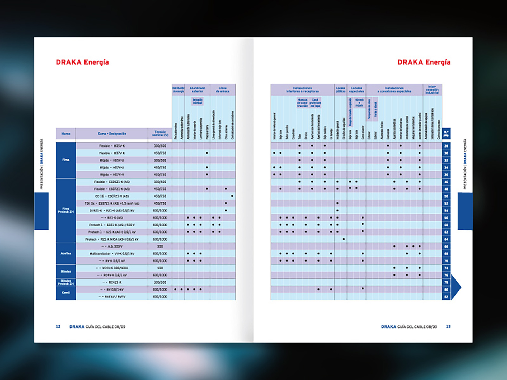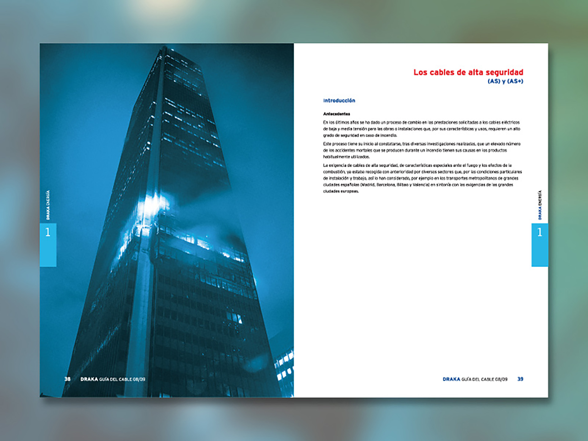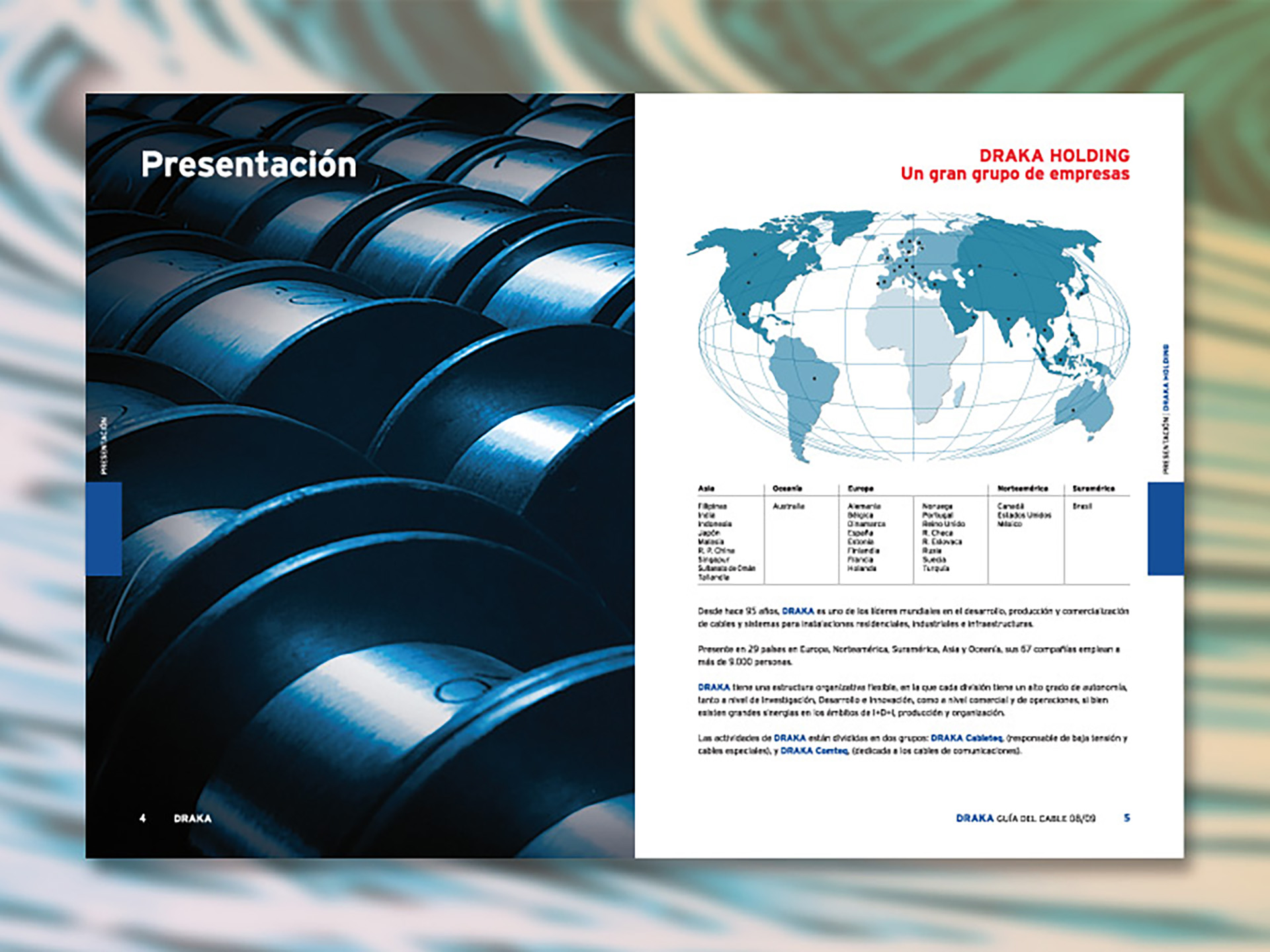L'any 2007, Draka és un dels líders mundials en el desenvolupament, producció i comercialització de cables i sistemes per a instal·lacions residencials, industrials i infraestructures • La complexitat feia més atractiu el treball • Basant-nos en la guia de Draka Cables, ja editada a nivell internacional des d'Holanda en l'any 2005, i per tal de no distorsionar la imatge present ja en altres països, vam donar aquest toc elegant a un producte, de per si, rigorosament tècnic i seriós, col·locant els diferents elements gràfics en llocs que no trenquessin el seu corporativisme • Resultat: un producte relaxat i amable per a un millor ús dels professionals del cable • L'edició va ser desenvolupada entre 2008 i 2009.