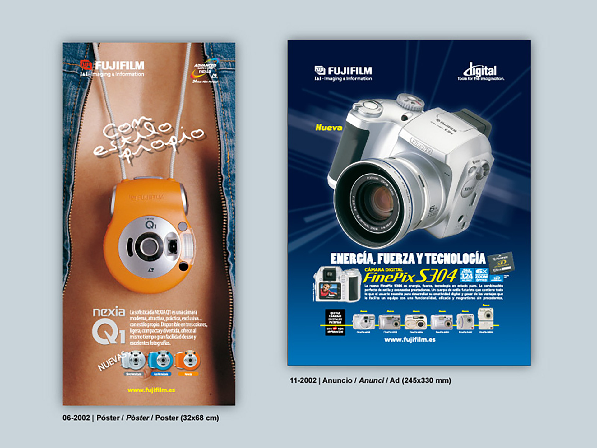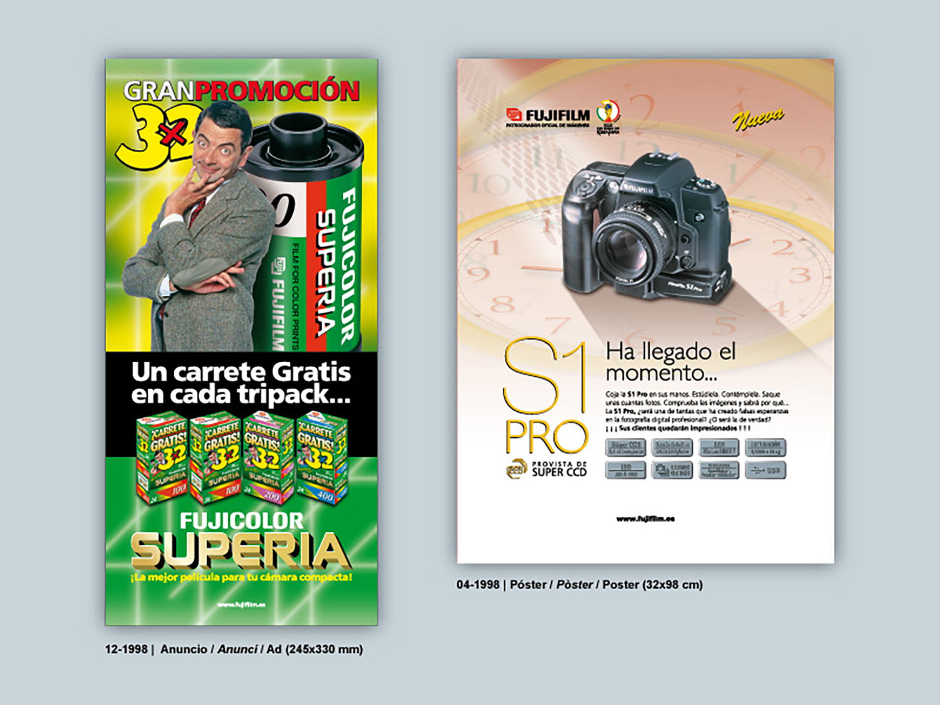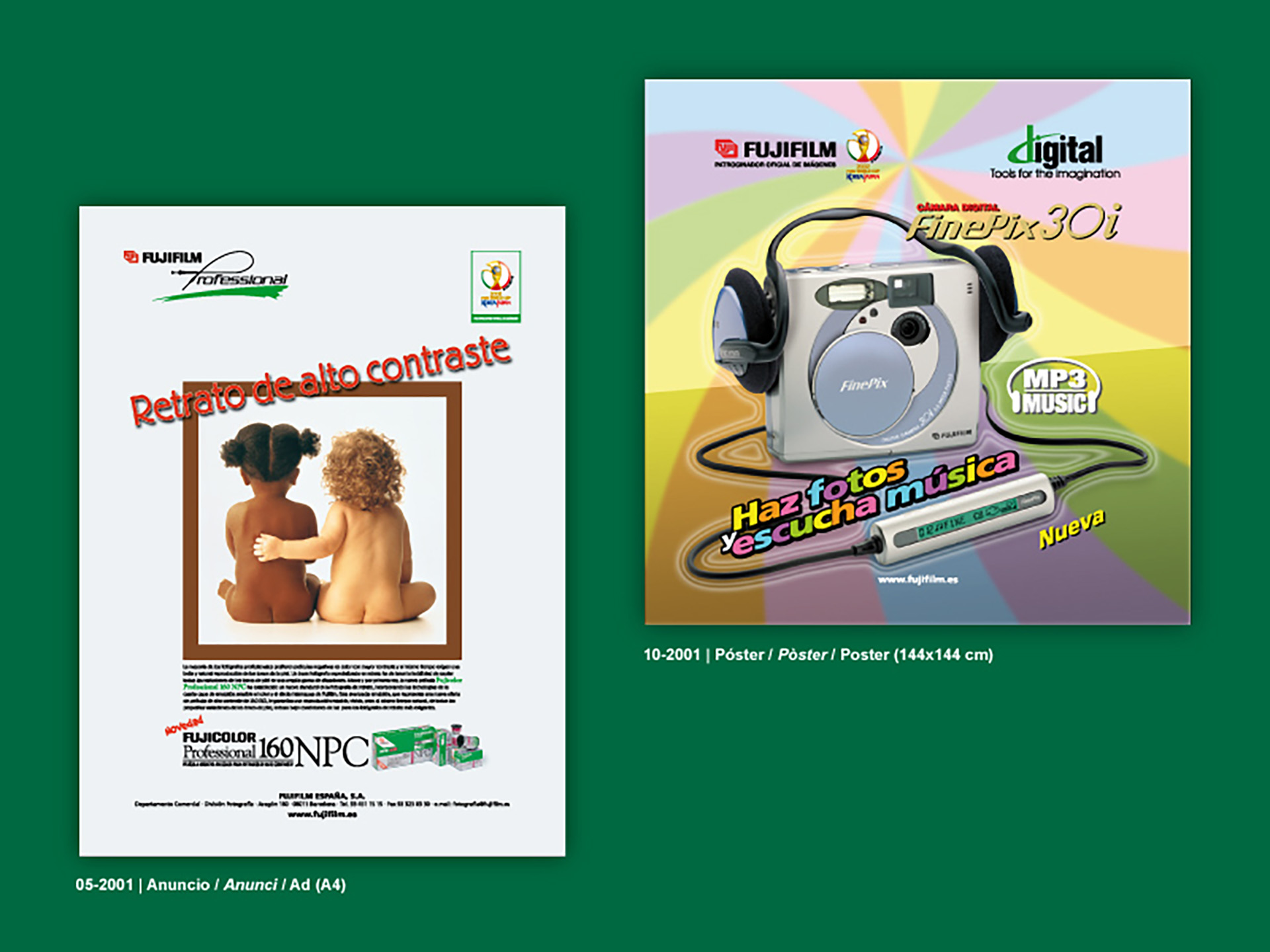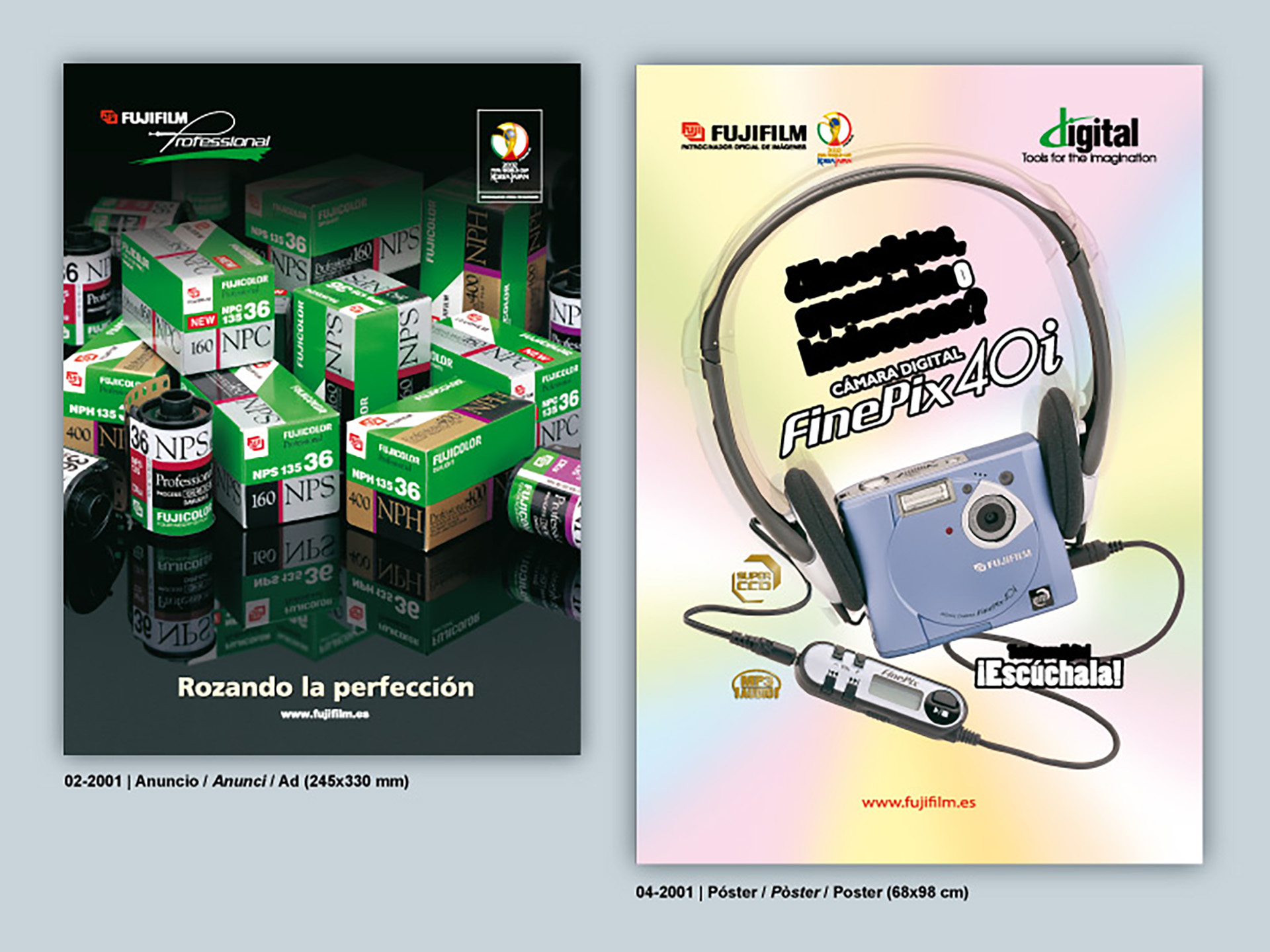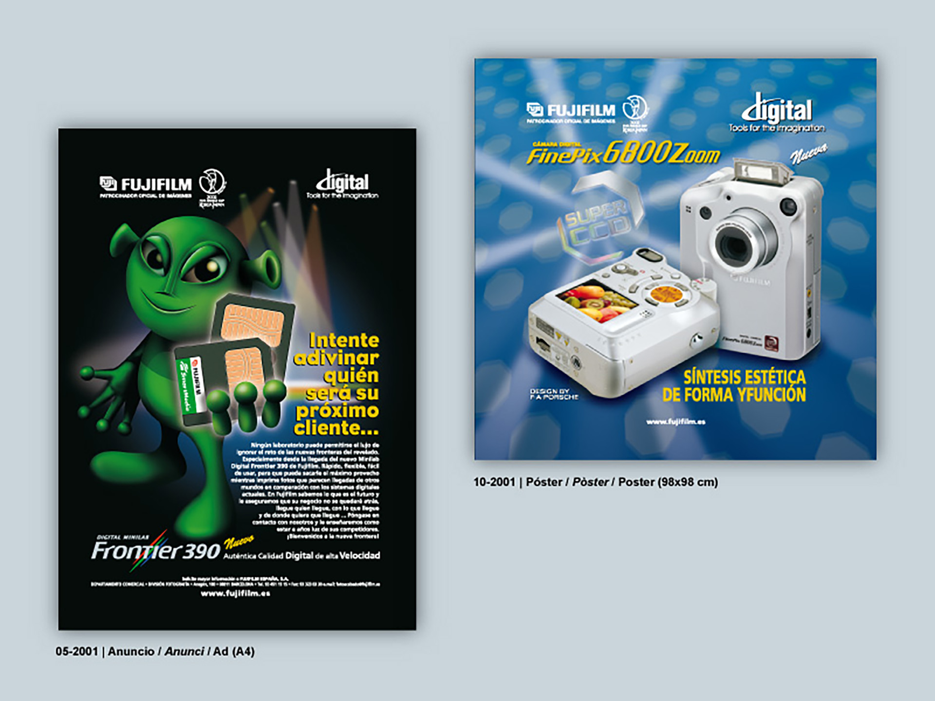 Una gran producció de cartells i anuncis de premsa i revistes nacionals es va desenvolupar per Fujifilm España, SA entre 1997 i 2007 • La creativitat conceptual i la creativitat gràfica van omplir hores i hores de treball d'estudi • S'ha de tenir en compte, a més, la gran activitat de retoc fotogràfic d'ordinador per donar una òptima qualitat a totes les imatges de producte.