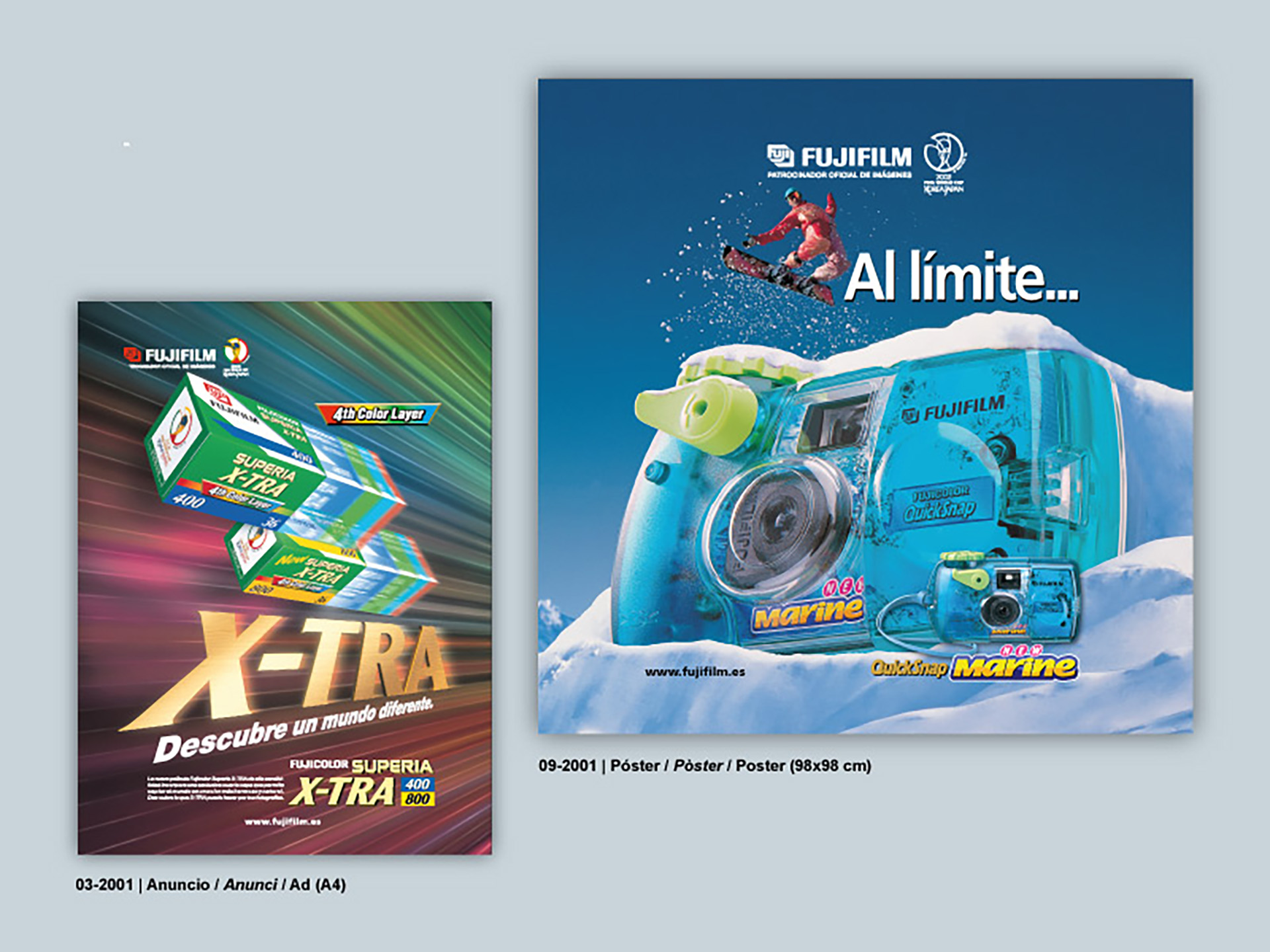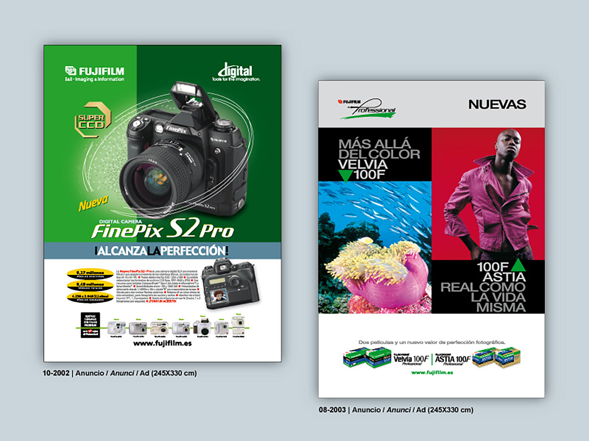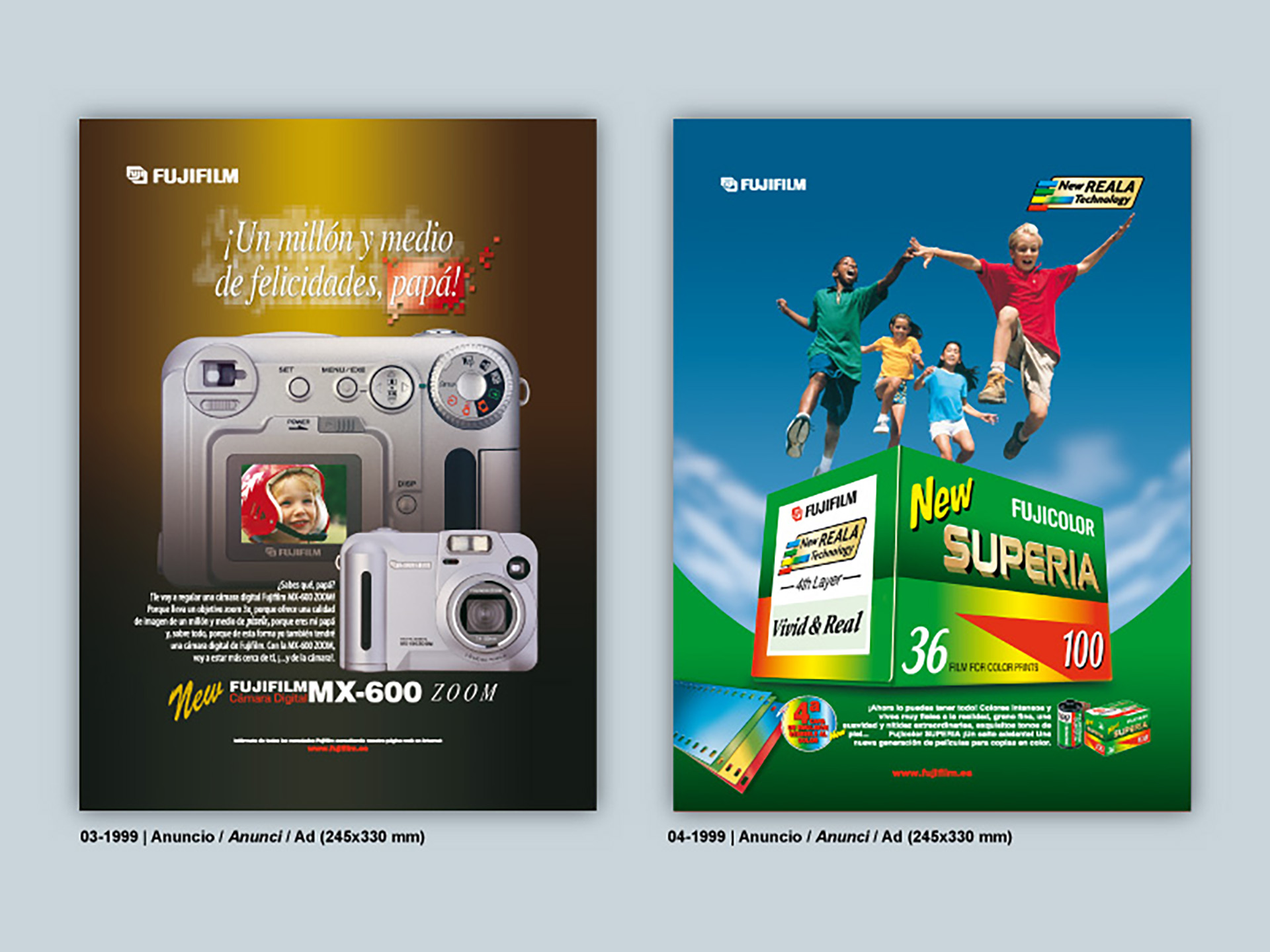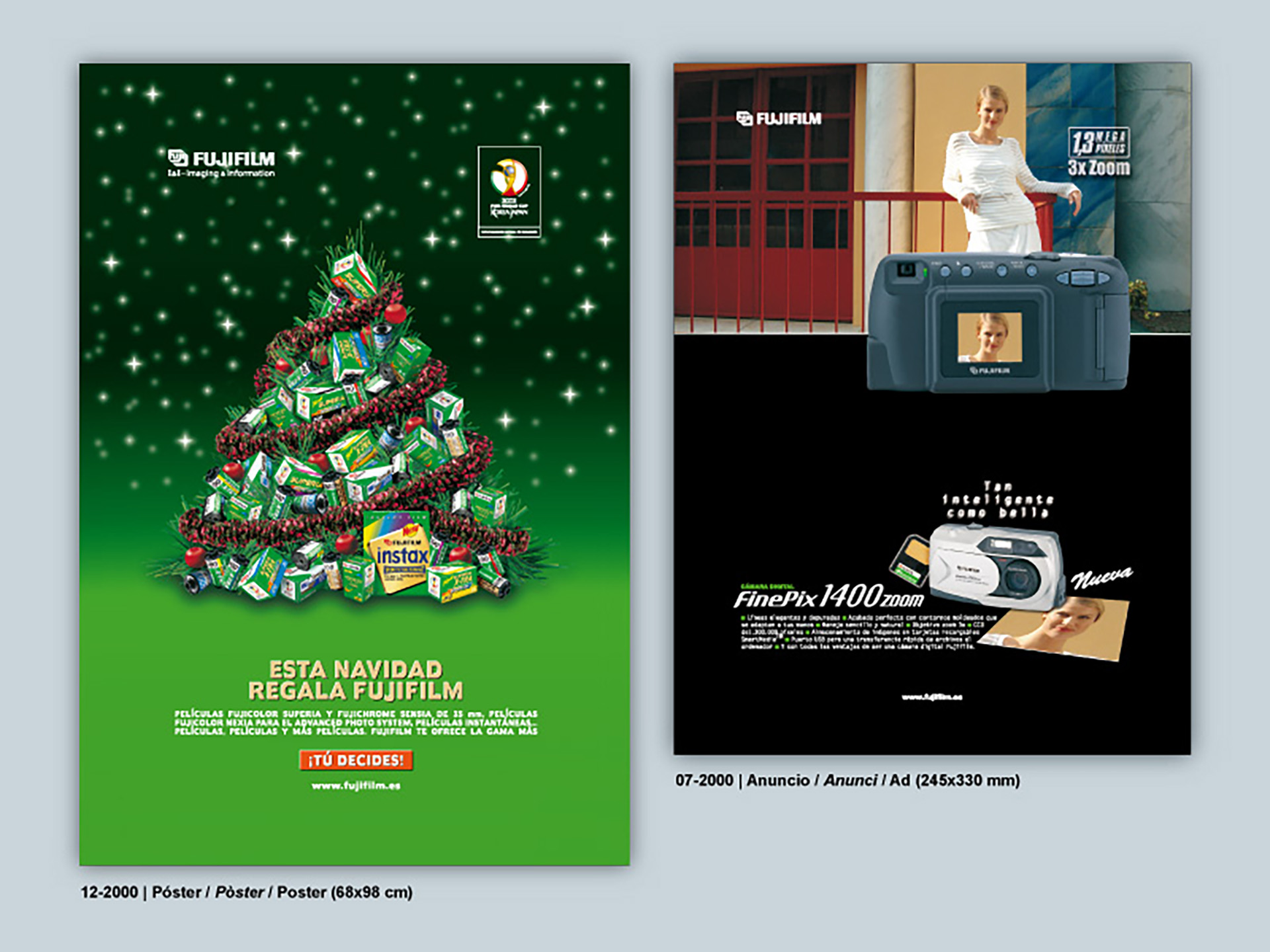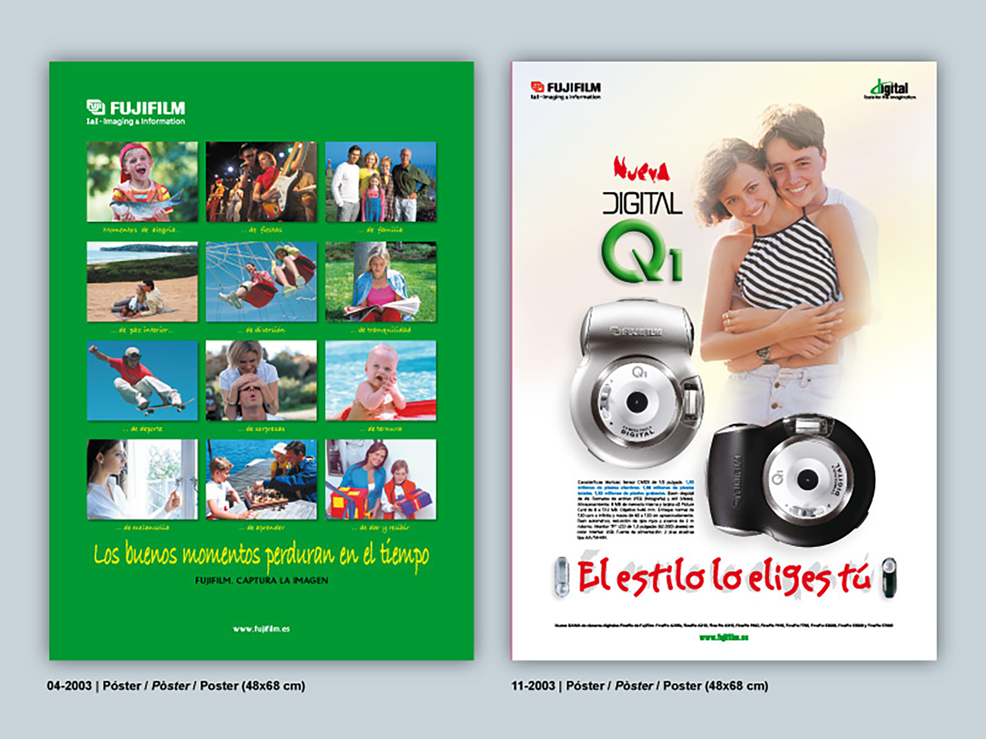 Una gran producció de cartells i anuncis de premsa i revistes nacionals es va desenvolupar per Fujifilm España, SA entre 1997 i 2007 • La creativitat conceptual i la creativitat gràfica van omplir hores i hores de treball d'estudi • S'ha de tenir en compte, a més, la gran activitat de retoc fotogràfic d'ordinador per donar una òptima qualitat a totes les imatges de producte.