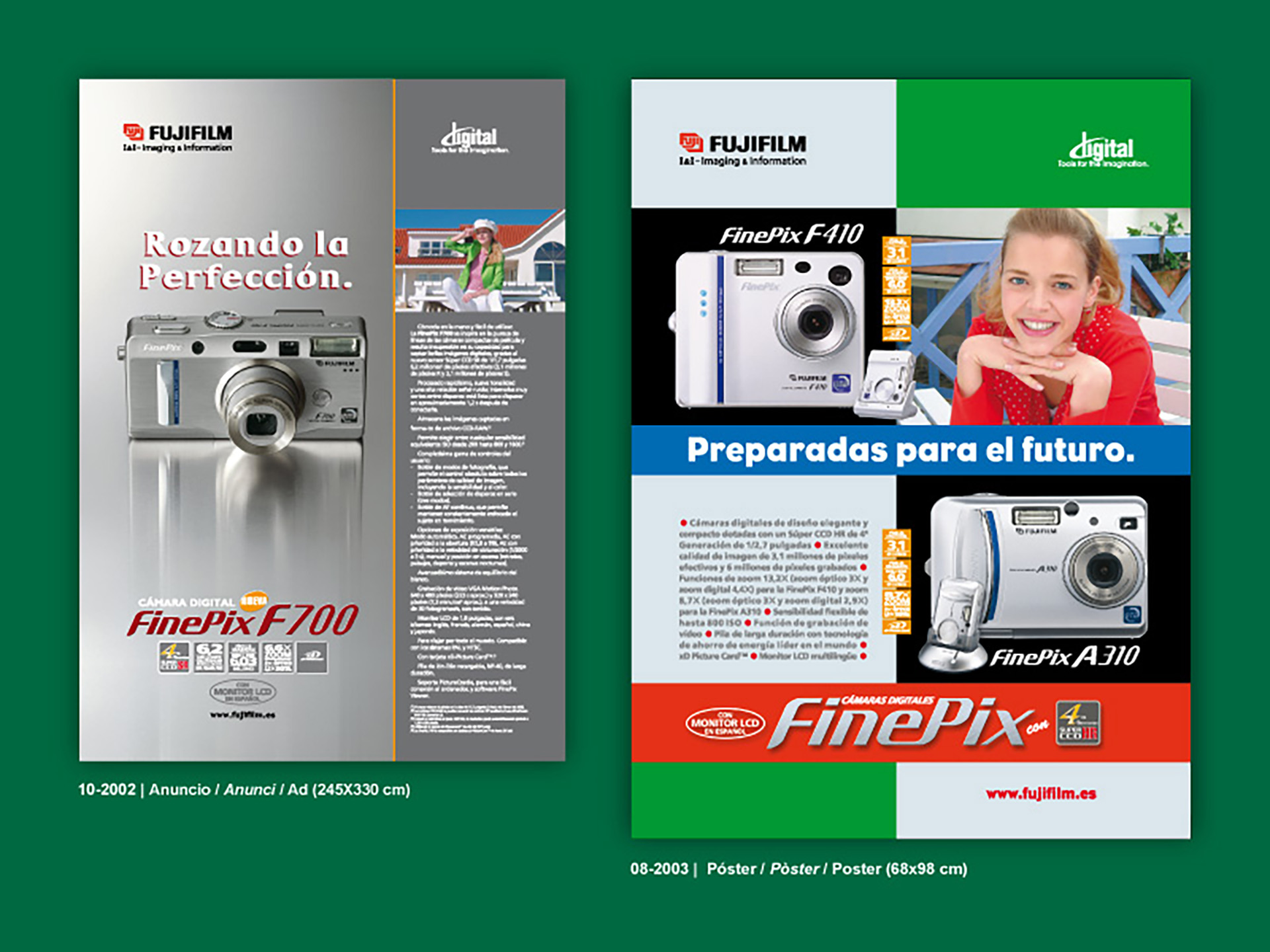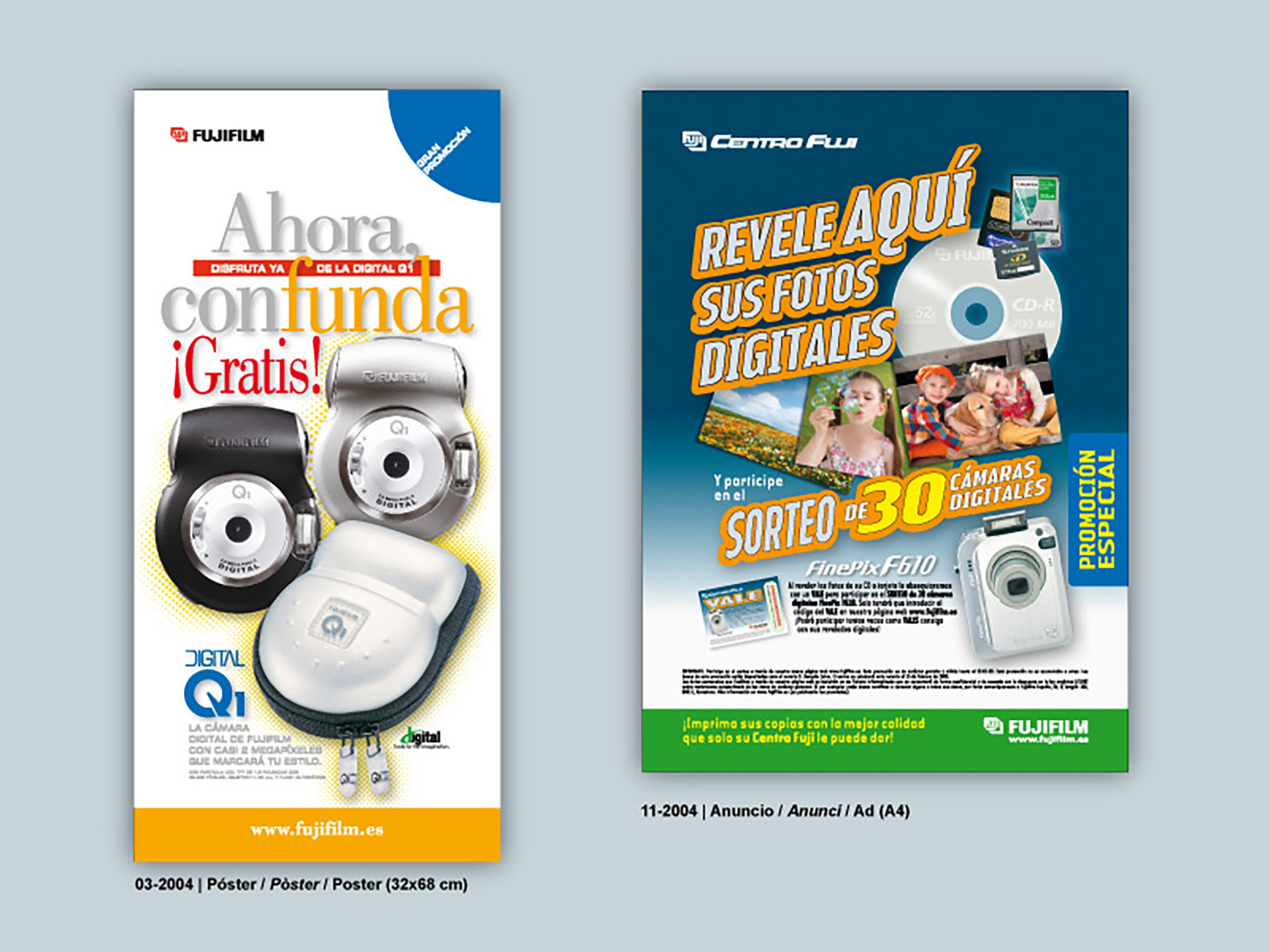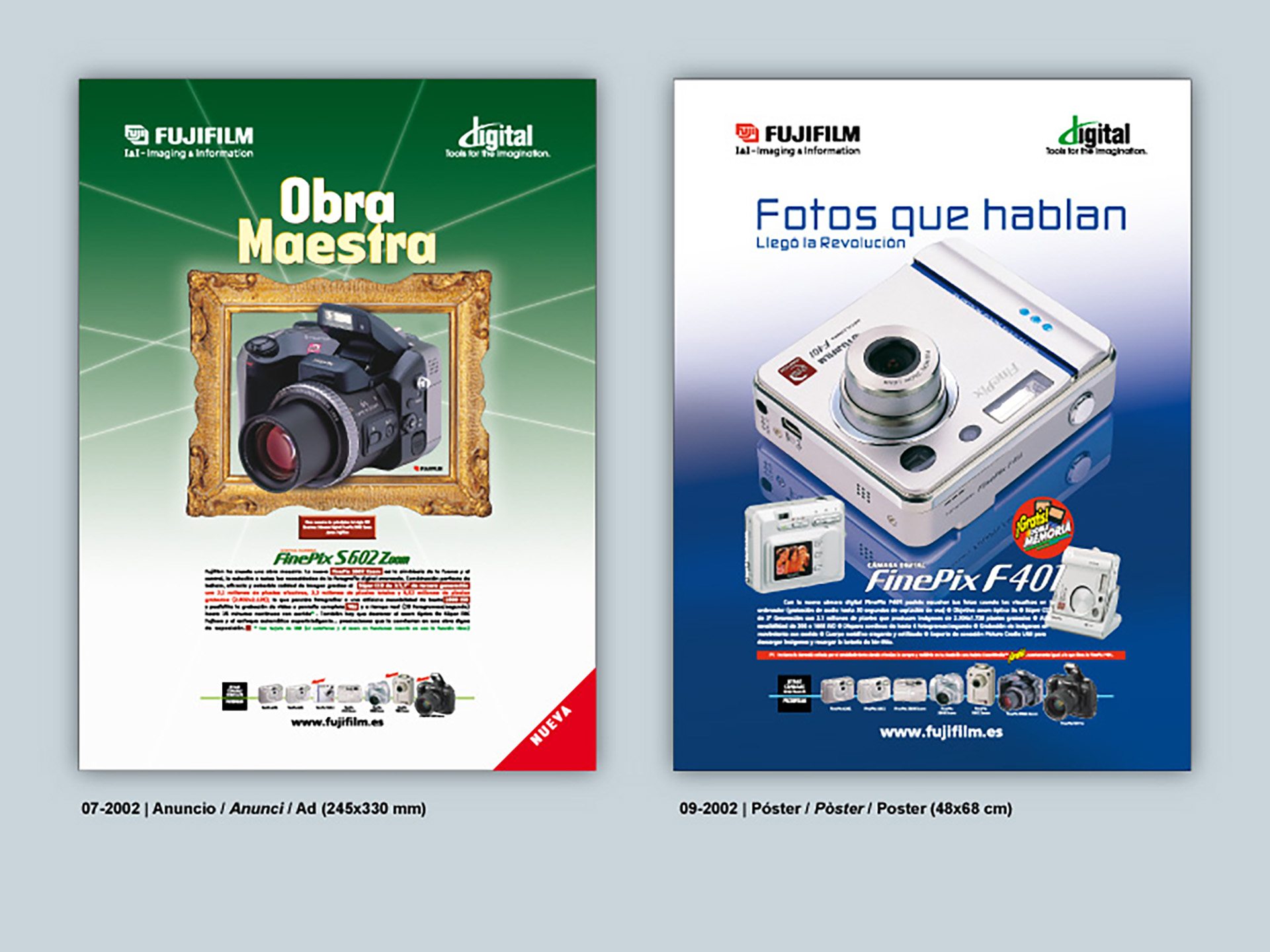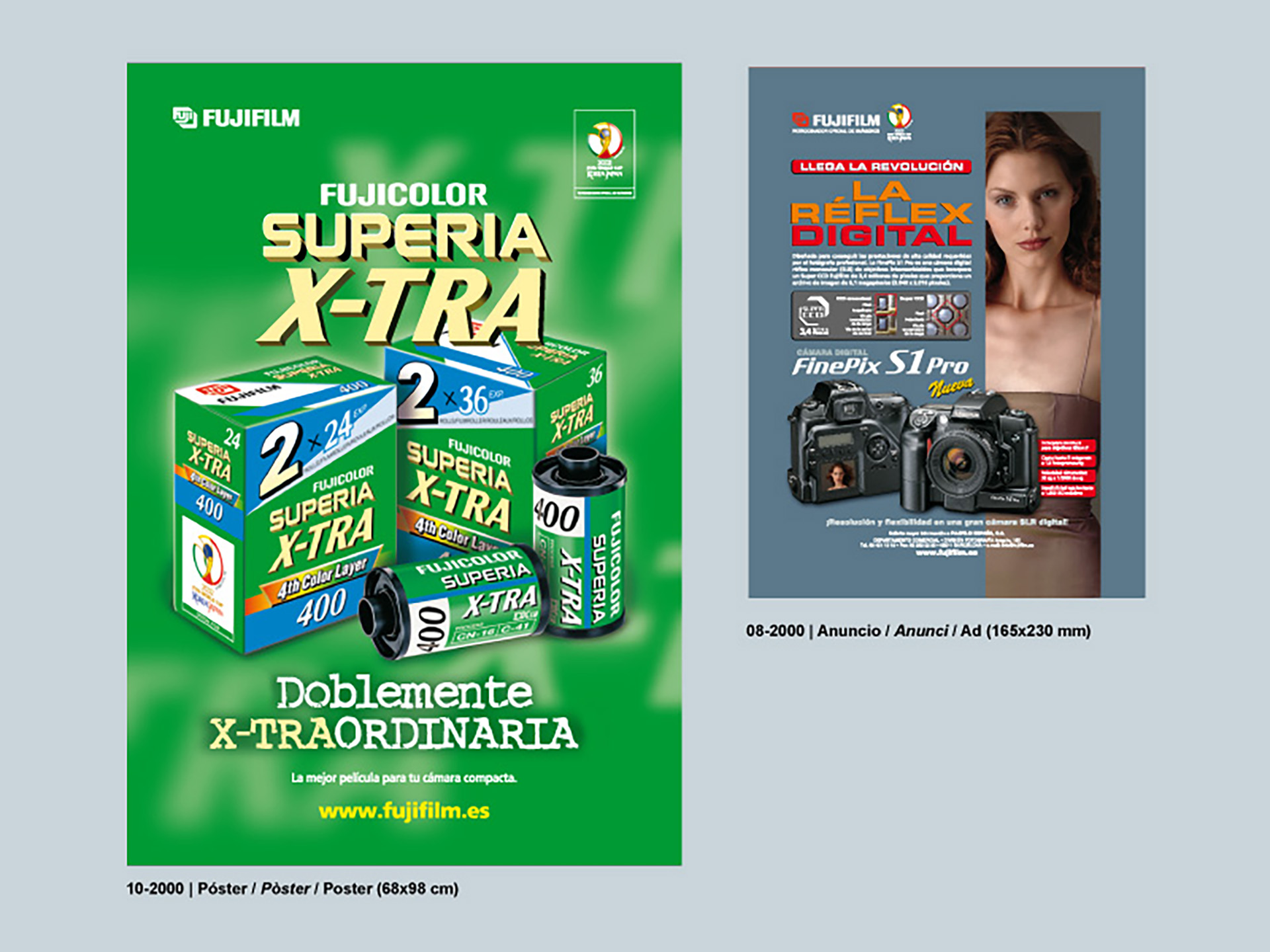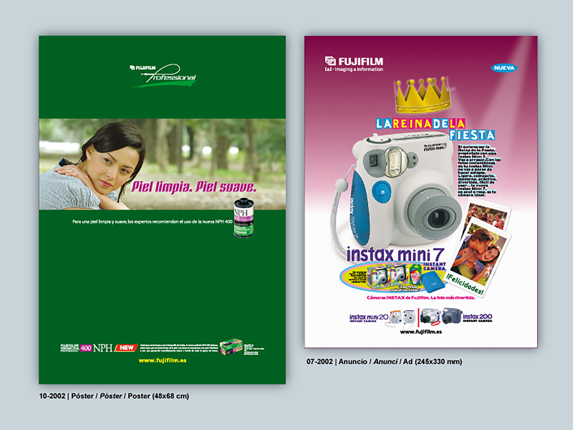 Una gran producció de cartells i anuncis de premsa i revistes nacionals es va desenvolupar per Fujifilm España, SA entre 1997 i 2007 • La creativitat conceptual i la creativitat gràfica van omplir hores i hores de treball d'estudi • S'ha de tenir en compte, a més, la gran activitat de retoc fotogràfic d'ordinador per donar una òptima qualitat a totes les imatges de producte.