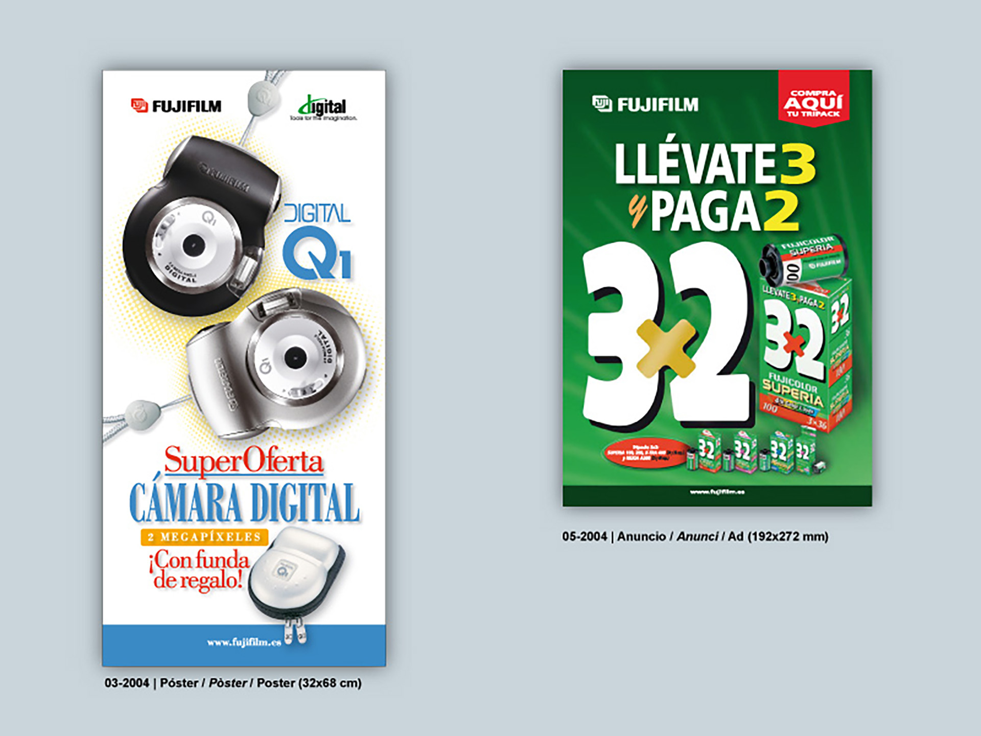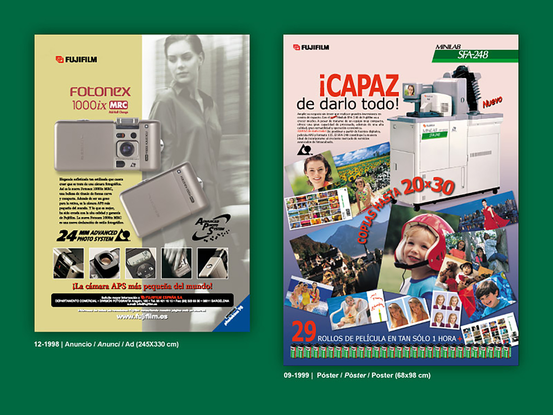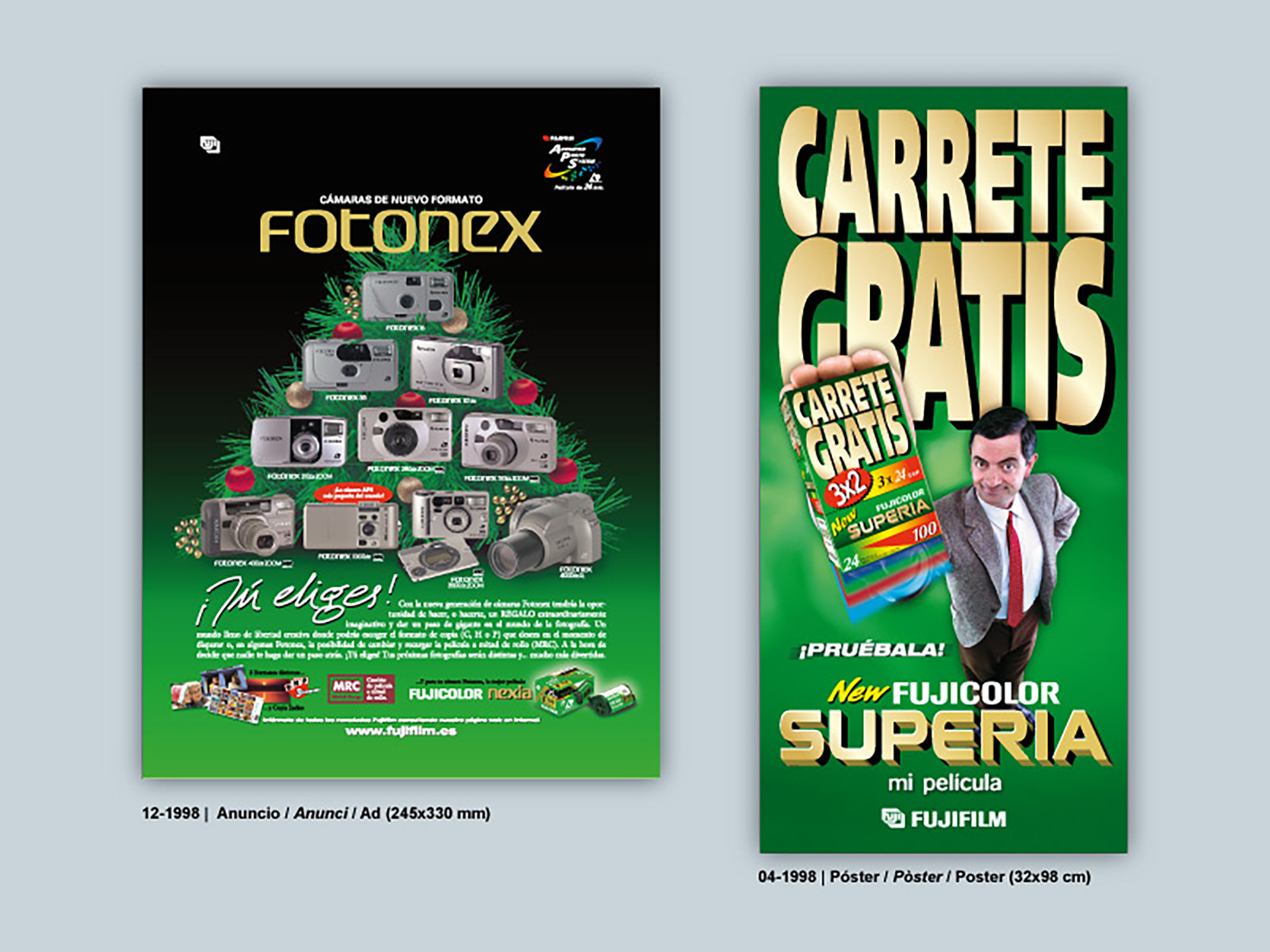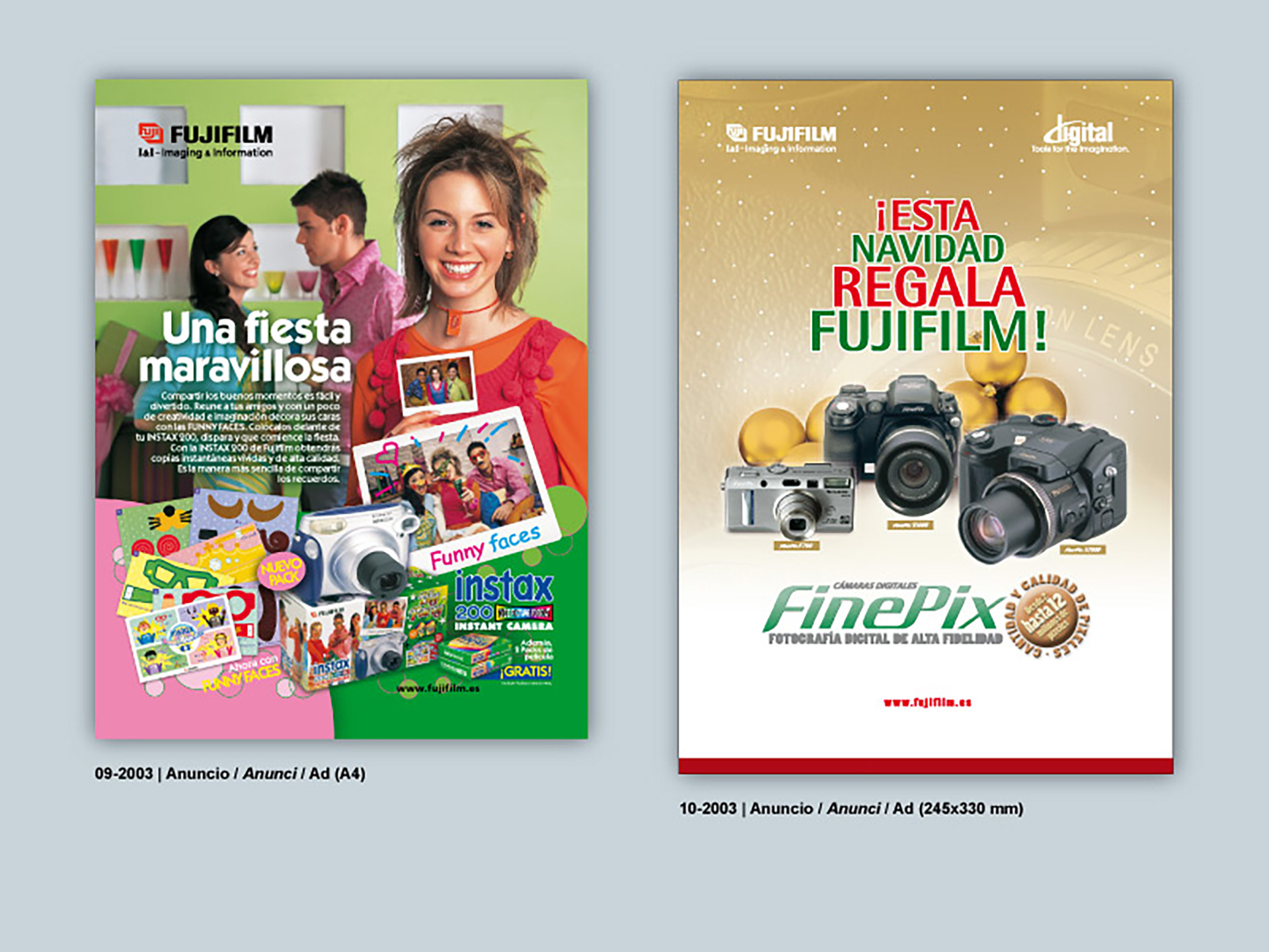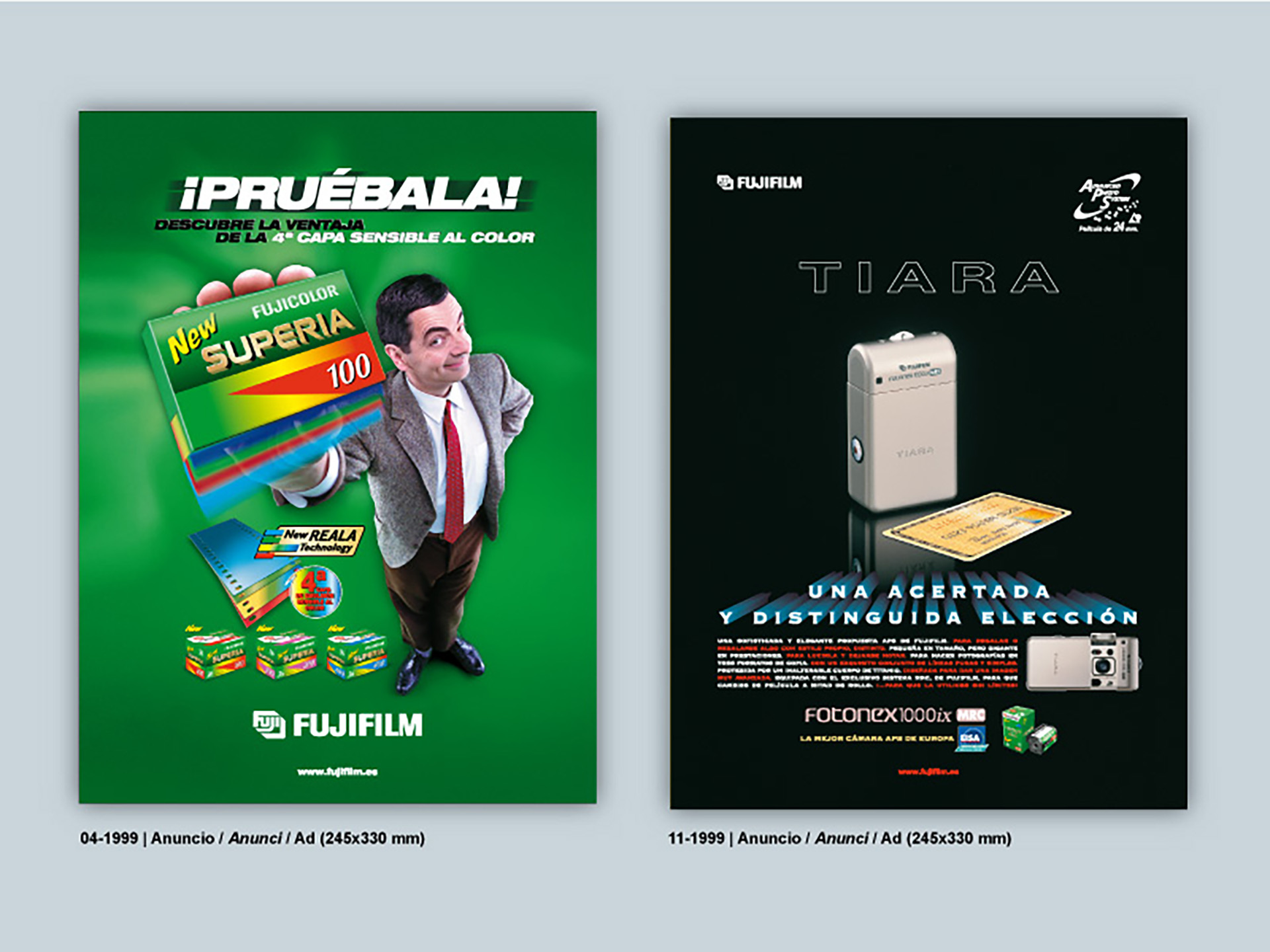 Una gran producció de cartells i anuncis de premsa i revistes nacionals es va desenvolupar per Fujifilm España, SA entre 1997 i 2007 • La creativitat conceptual i la creativitat gràfica van omplir hores i hores de treball d'estudi • S'ha de tenir en compte, a més, la gran activitat de retoc fotogràfic d'ordinador per donar una òptima qualitat a totes les imatges de producte.