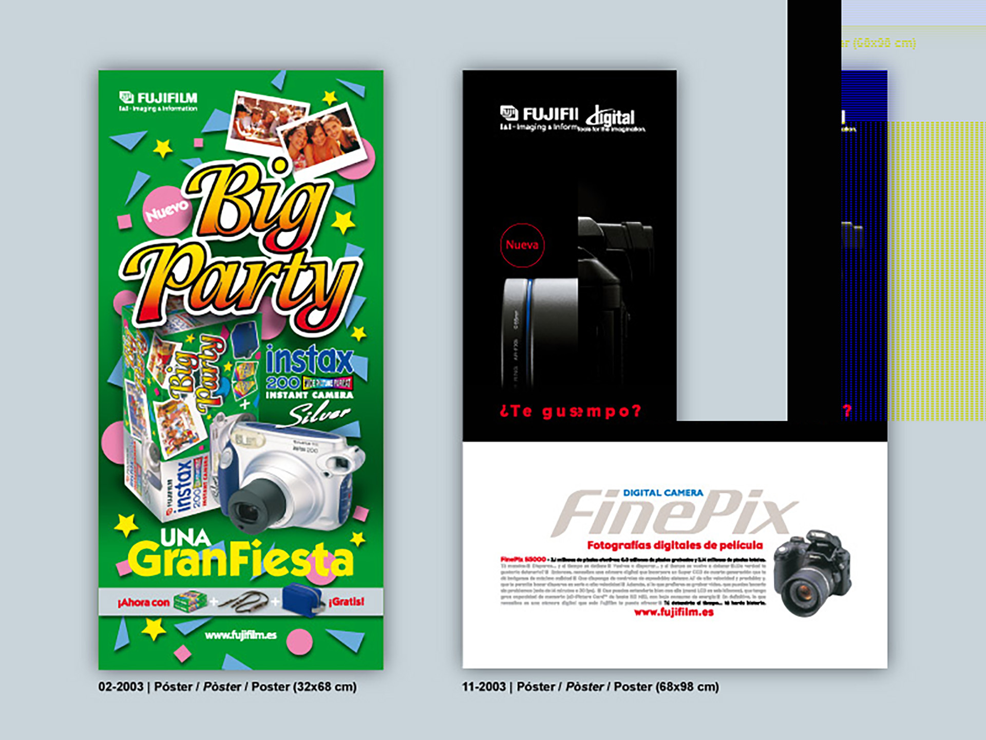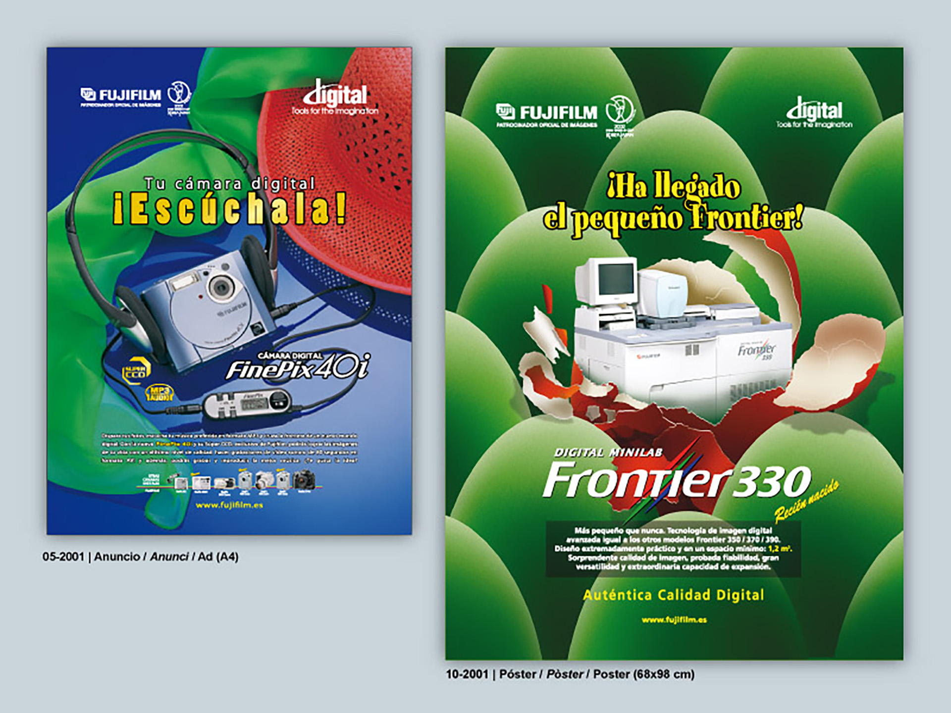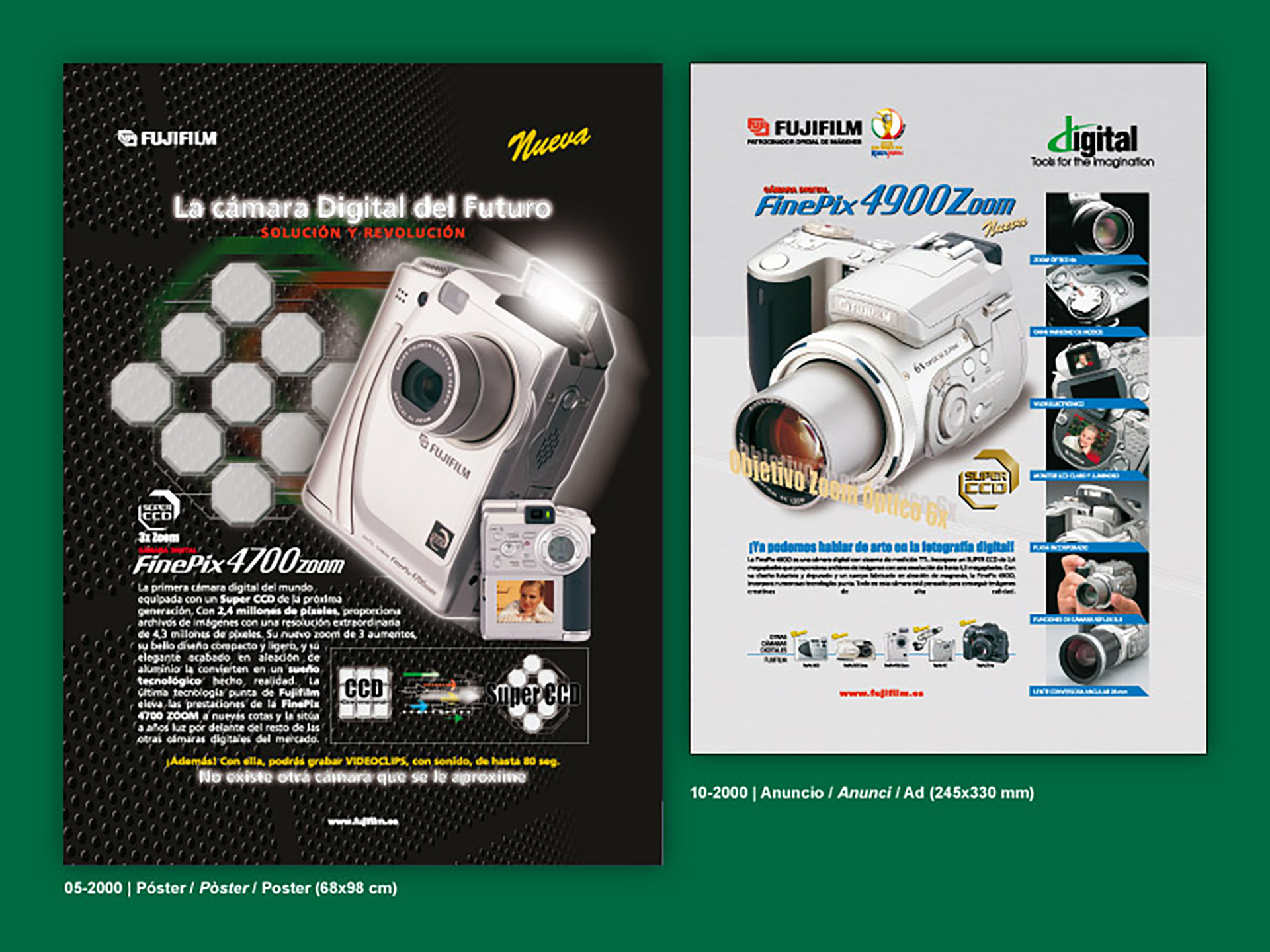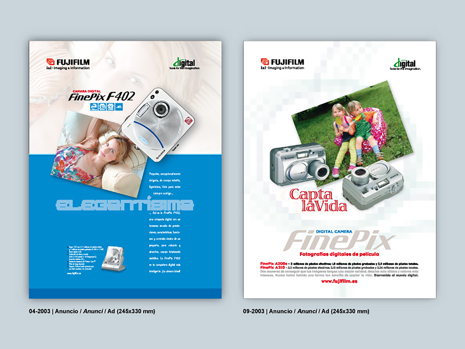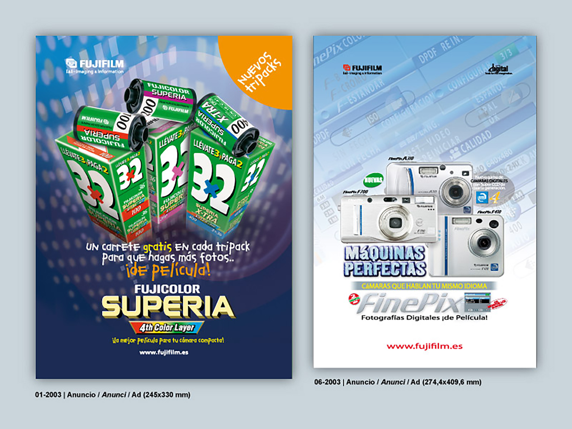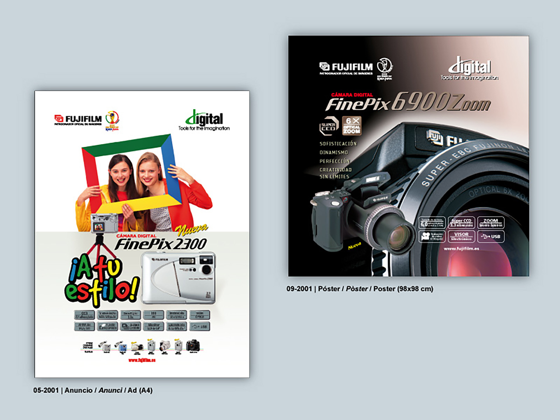 Una gran producció de cartells i anuncis de premsa i revistes nacionals es va desenvolupar per Fujifilm España, SA entre 1997 i 2007 • La creativitat conceptual i la creativitat gràfica van omplir hores i hores de treball d'estudi • S'ha de tenir en compte, a més, la gran activitat de retoc fotogràfic d'ordinador per donar una òptima qualitat a totes les imatges de producte.