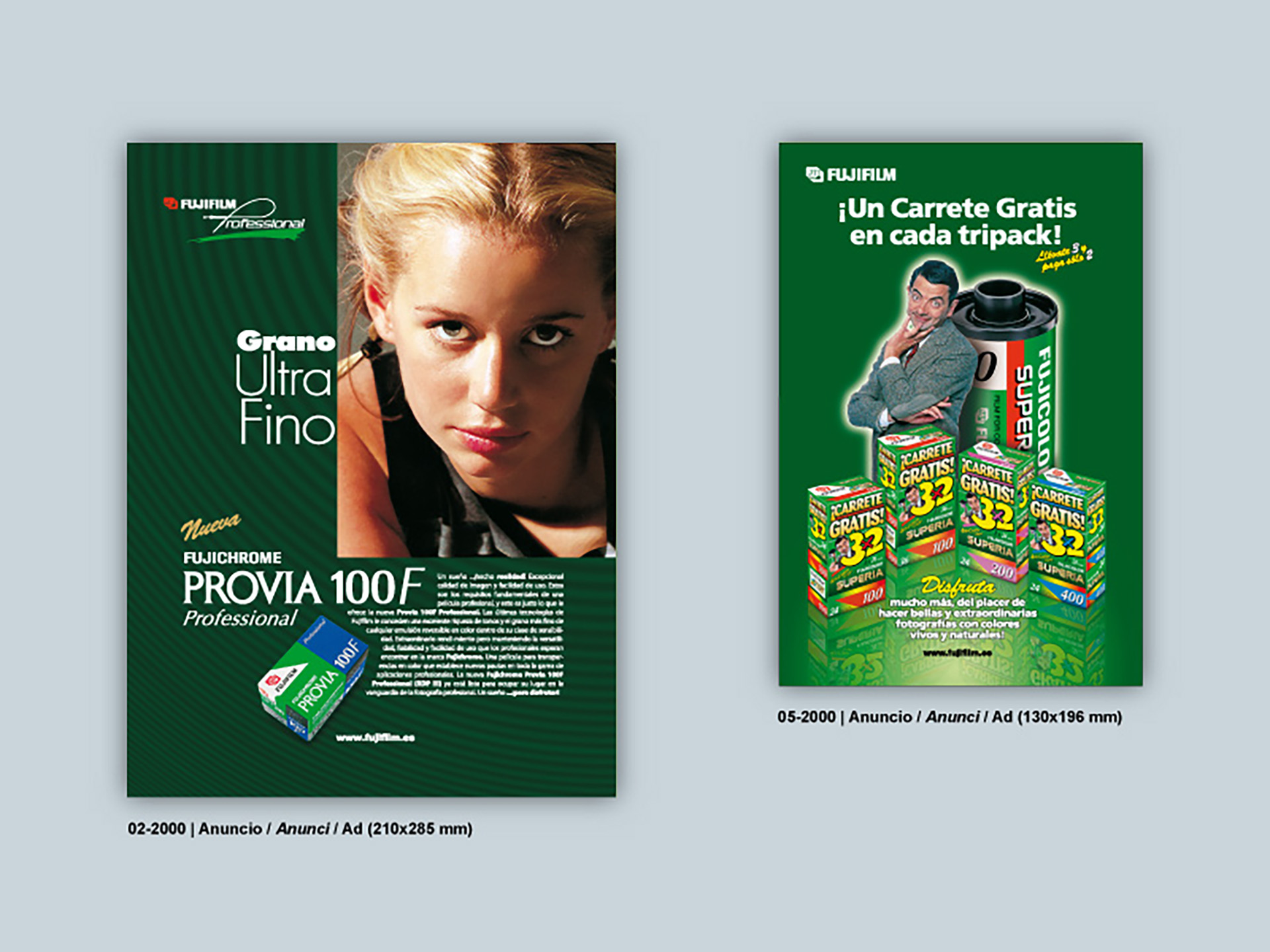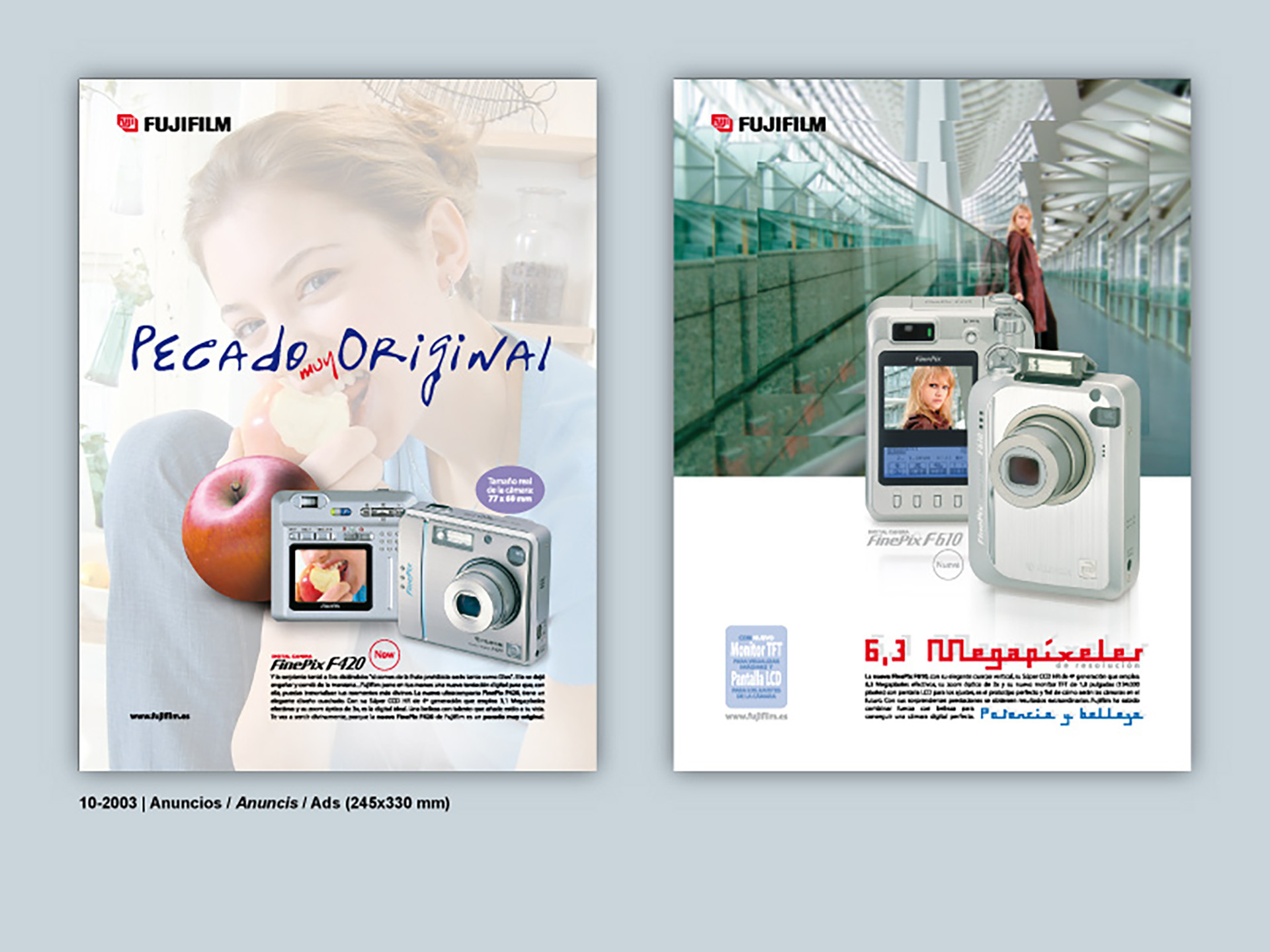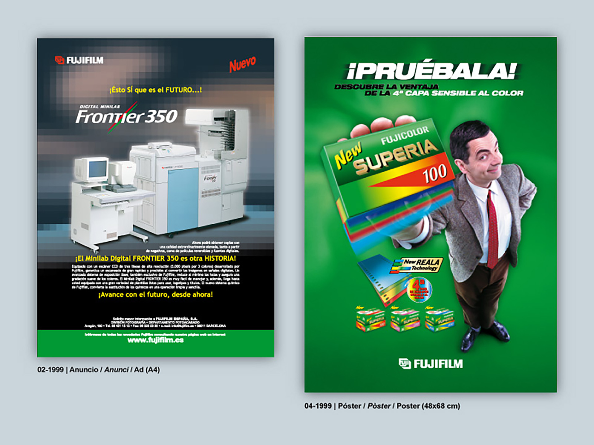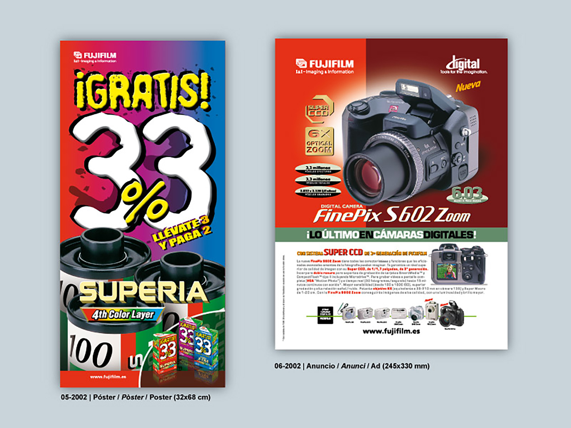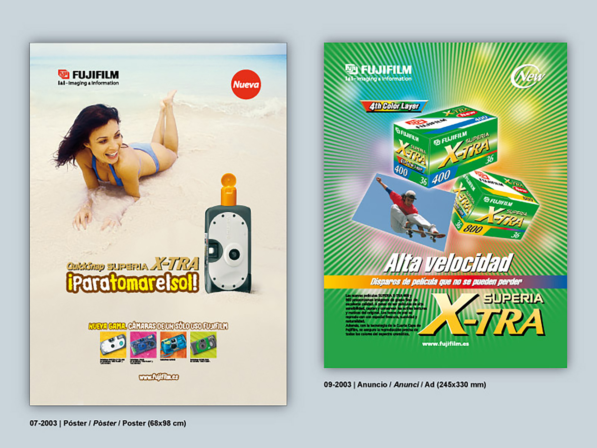 Una gran producció de cartells i anuncis de premsa i revistes nacionals es va desenvolupar per Fujifilm España, SA entre 1997 i 2007 • La creativitat conceptual i la creativitat gràfica van omplir hores i hores de treball d'estudi • S'ha de tenir en compte, a més, la gran activitat de retoc fotogràfic d'ordinador per donar una òptima qualitat a totes les imatges de producte.
