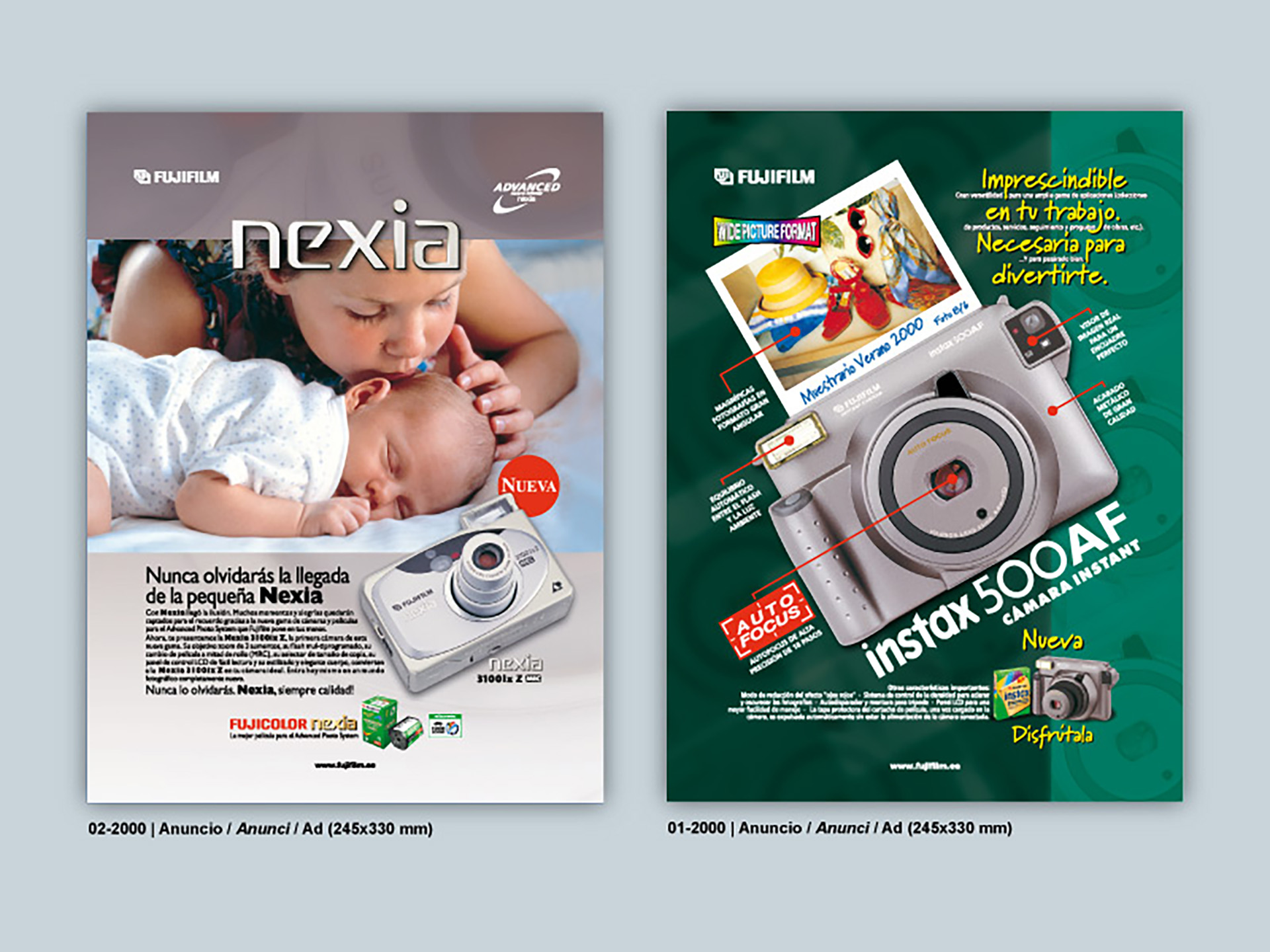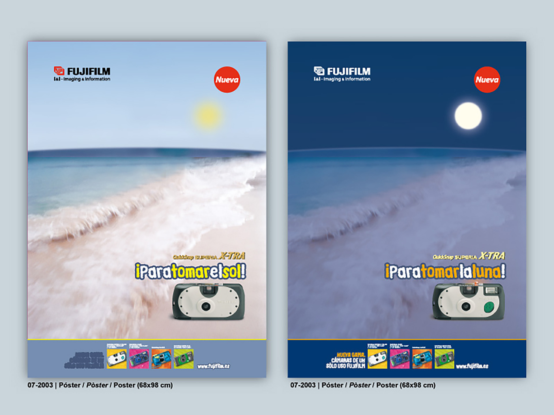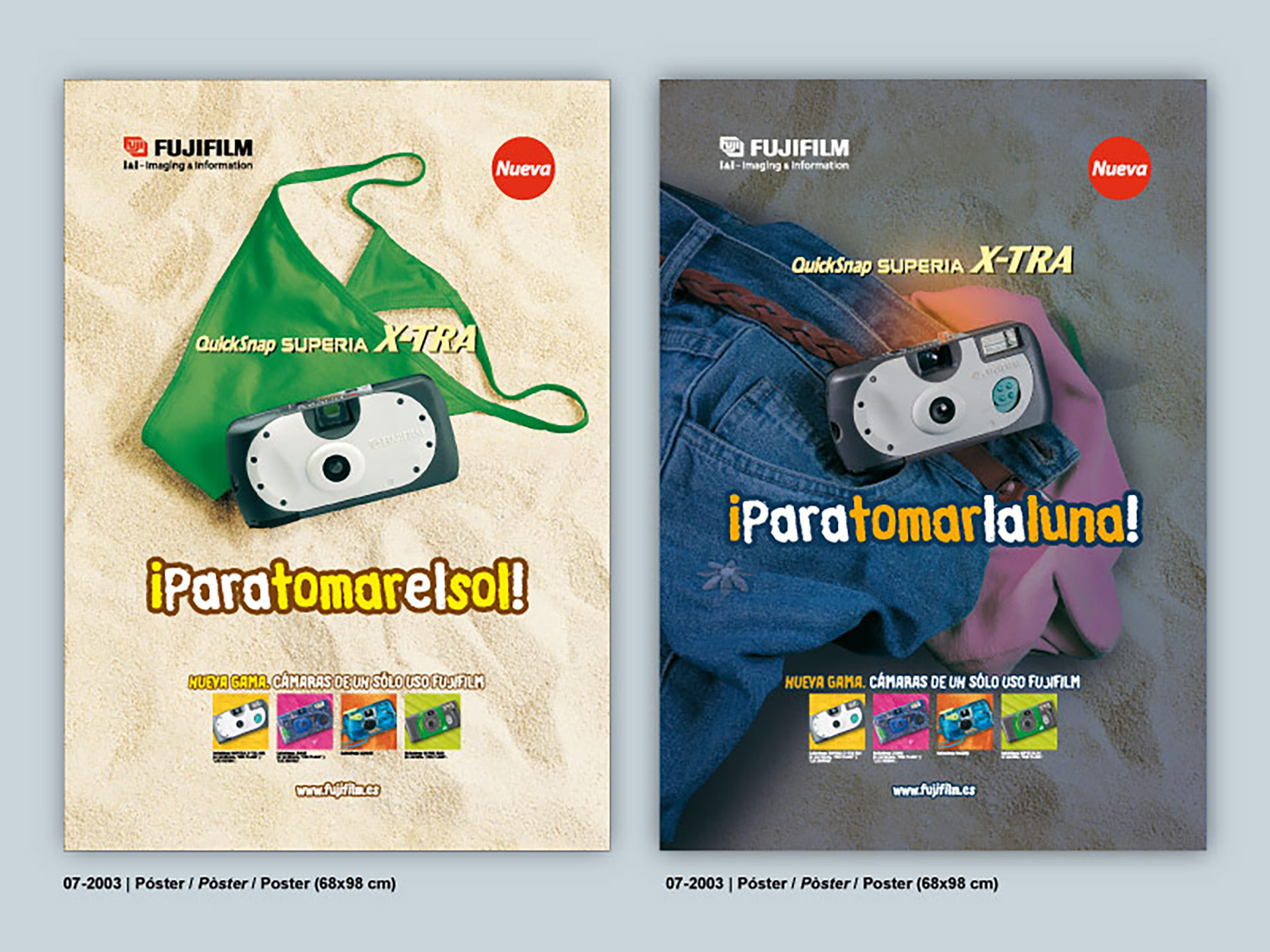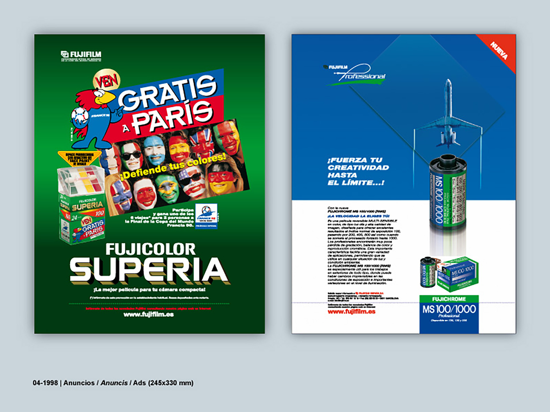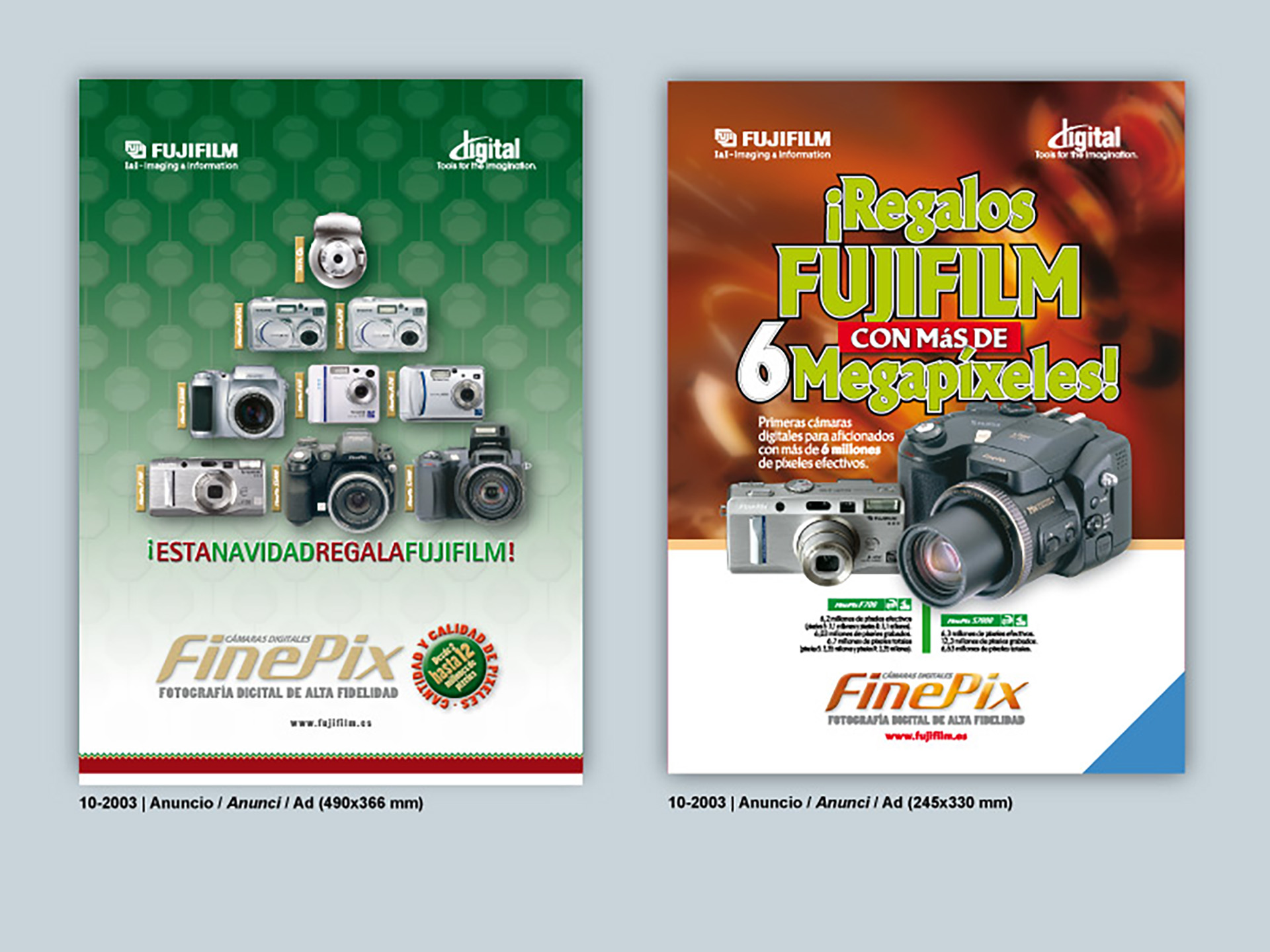 Una gran producció de cartells i anuncis de premsa i revistes nacionals es va desenvolupar per Fujifilm España, SA entre 1997 i 2007 • La creativitat conceptual i la creativitat gràfica van omplir hores i hores de treball d'estudi • S'ha de tenir en compte, a més, la gran activitat de retoc fotogràfic d'ordinador per donar una òptima qualitat a totes les imatges de producte.
