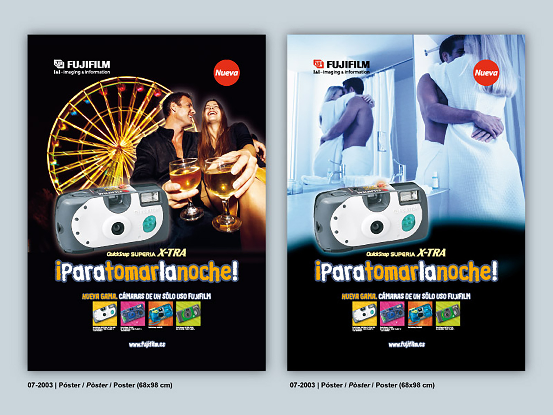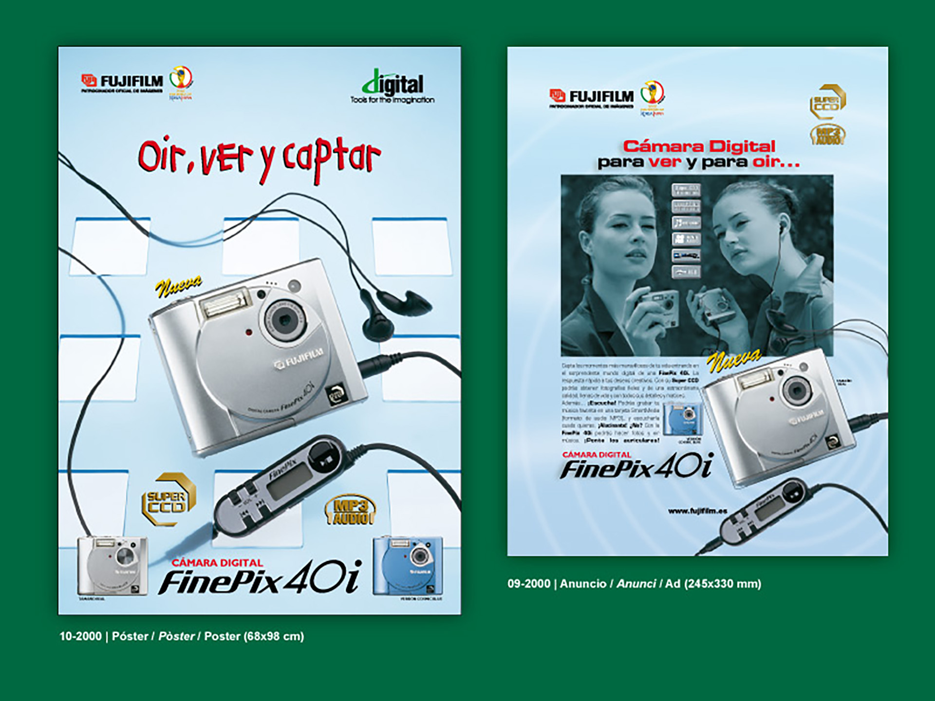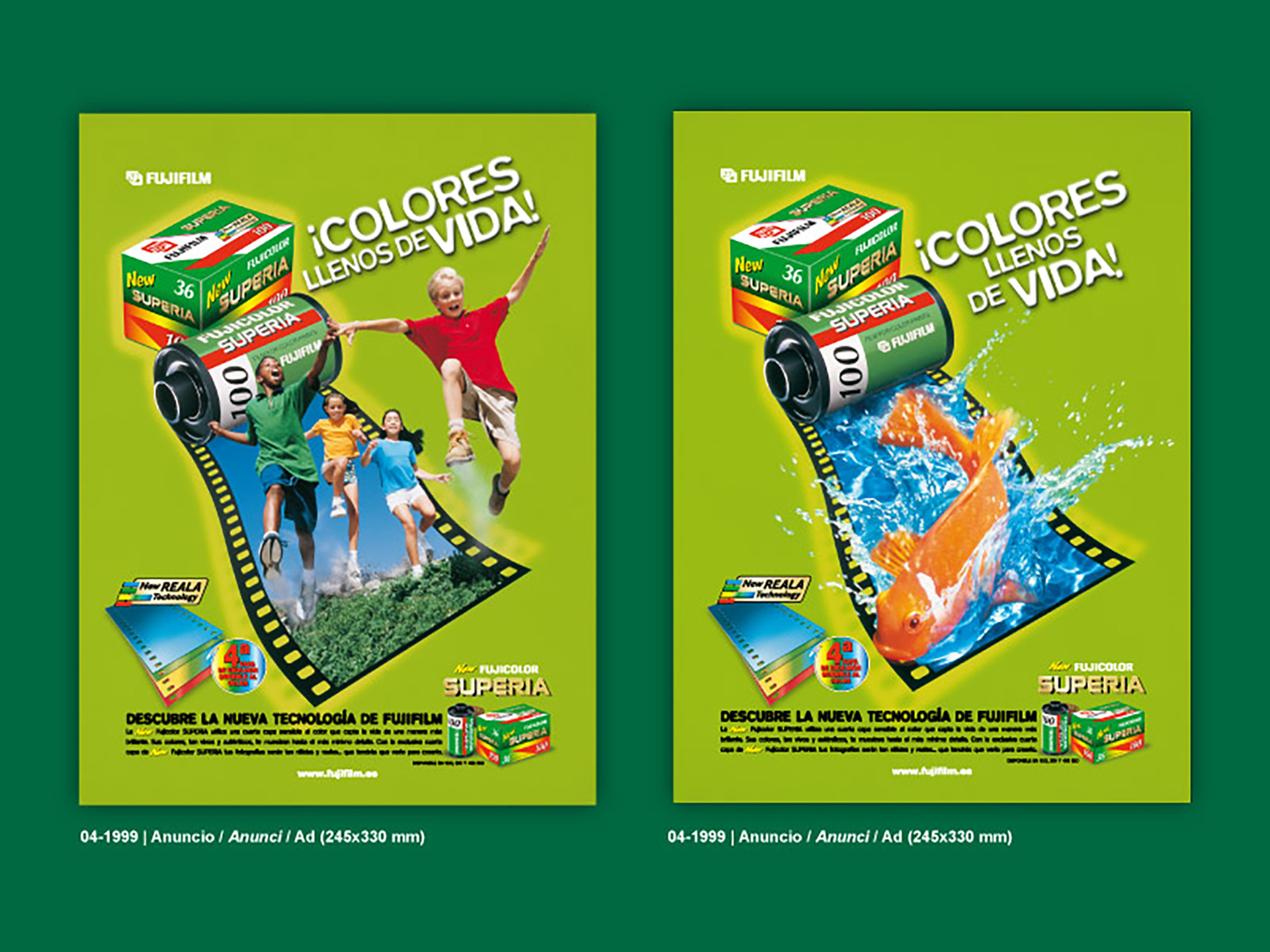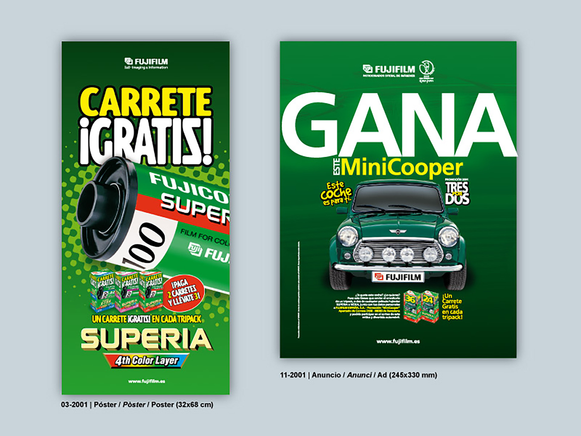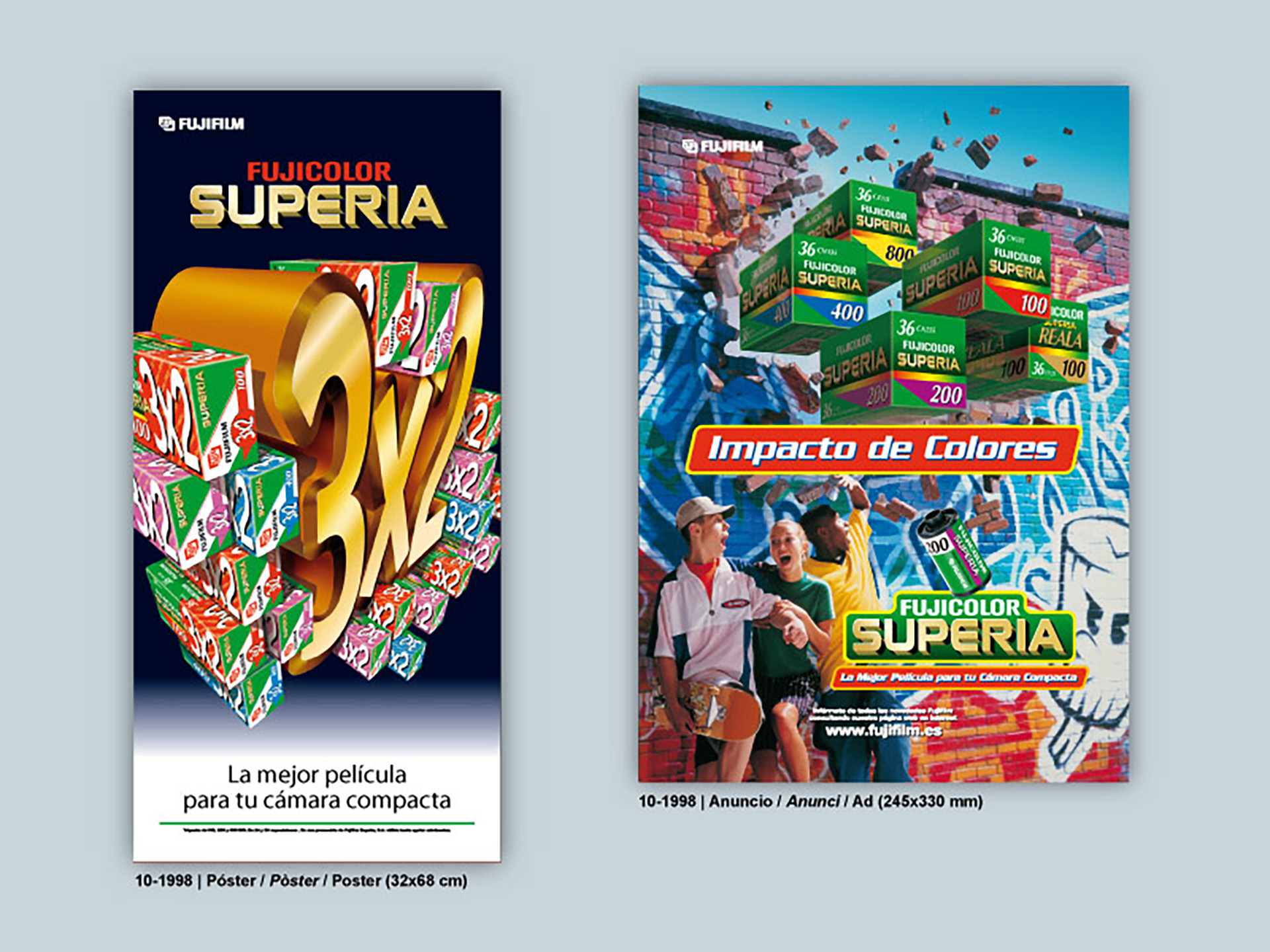 Una gran producció de cartells i anuncis de premsa i revistes nacionals es va desenvolupar per Fujifilm España, SA entre 1997 i 2007 • La creativitat conceptual i la creativitat gràfica van omplir hores i hores de treball d'estudi • S'ha de tenir en compte, a més, la gran activitat de retoc fotogràfic d'ordinador per donar una òptima qualitat a totes les imatges de producte.