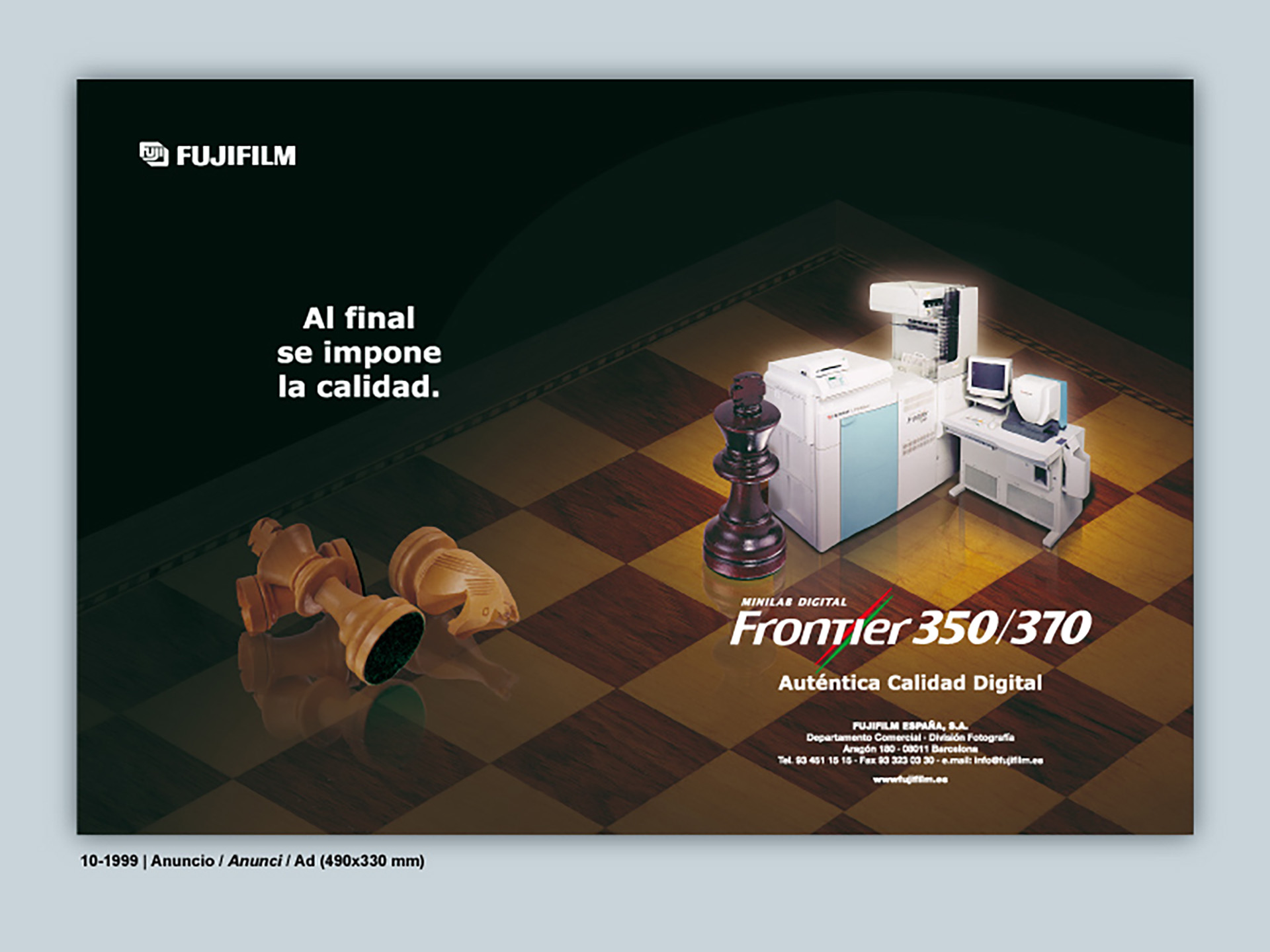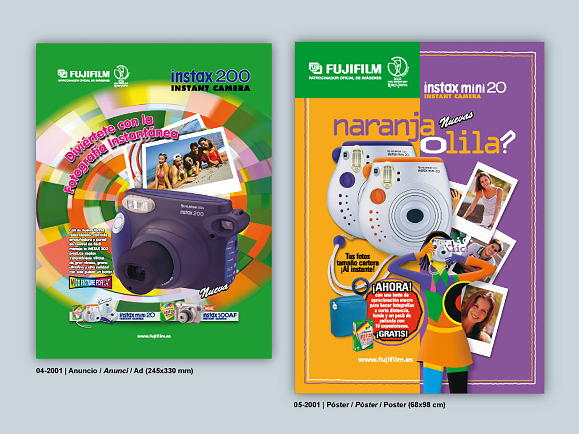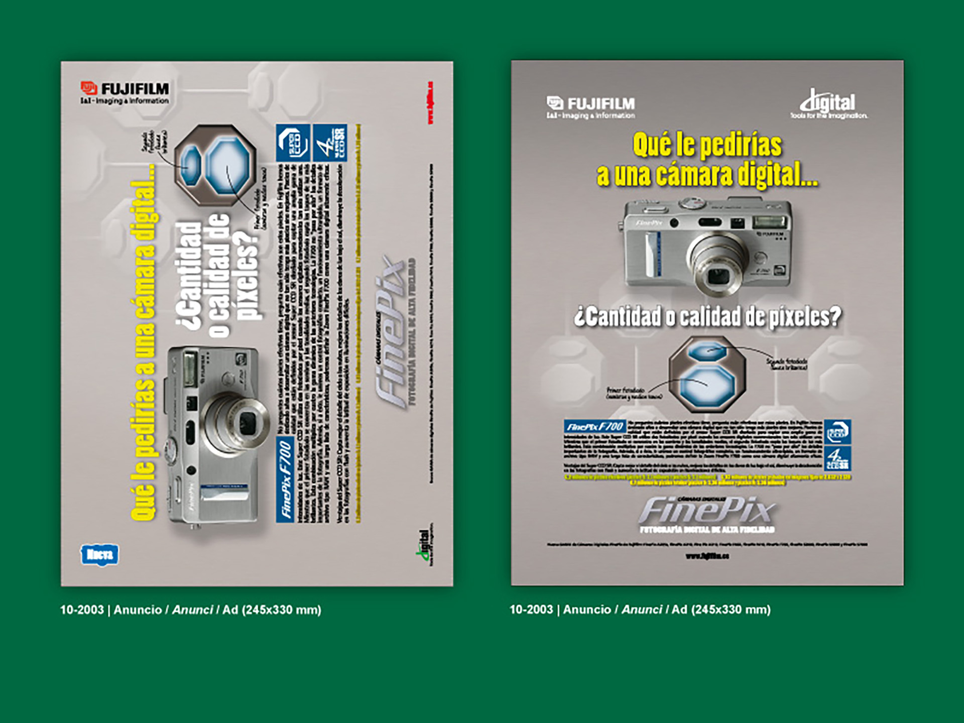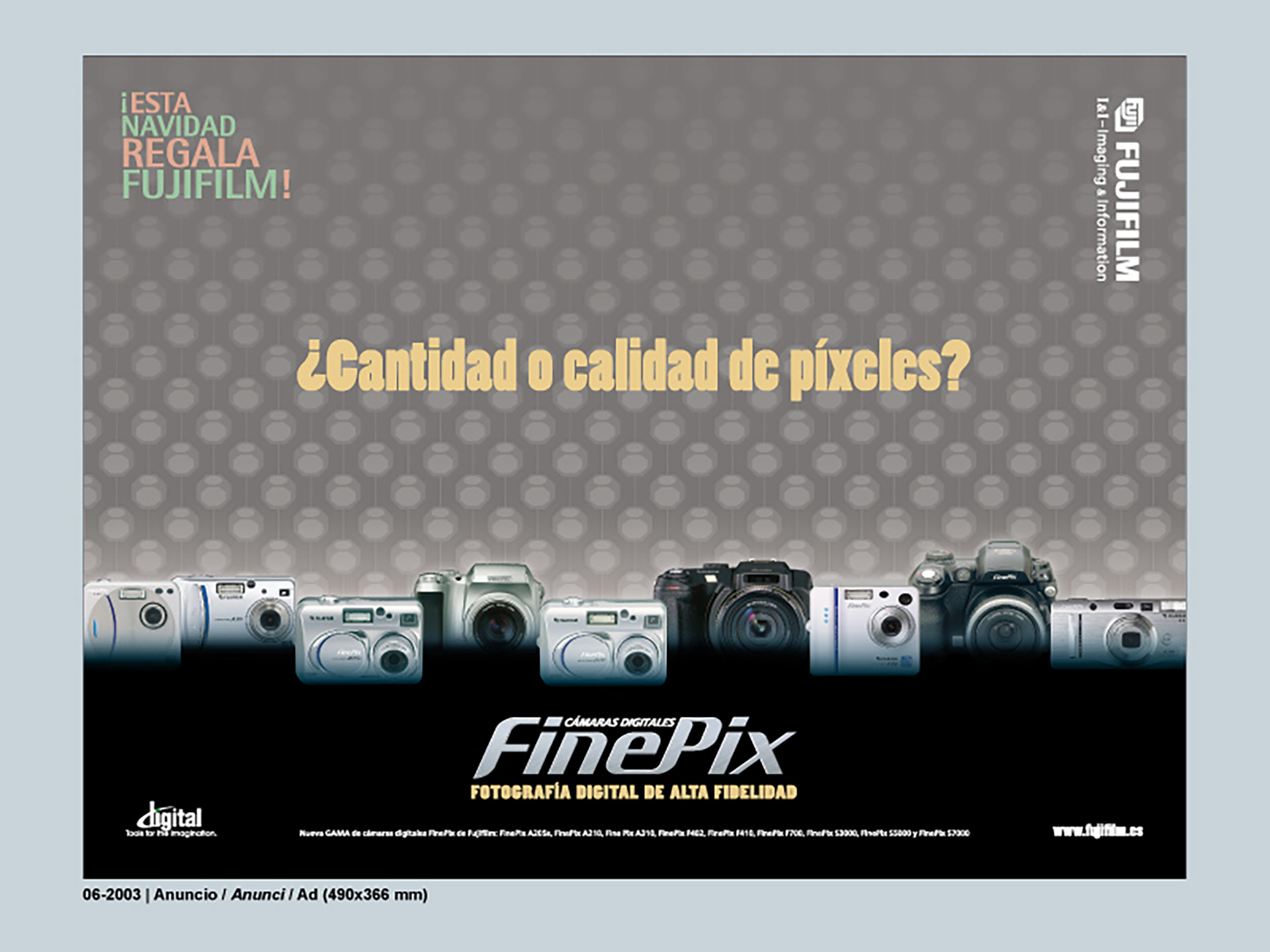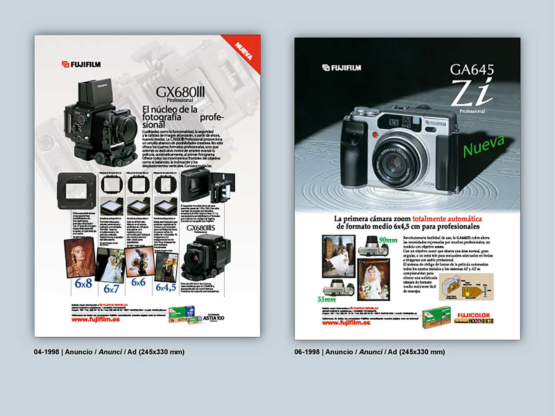 Una gran producció de cartells i anuncis de premsa i revistes nacionals es va desenvolupar per Fujifilm España, SA entre 1997 i 2007 • La creativitat conceptual i la creativitat gràfica van omplir hores i hores de treball d'estudi • S'ha de tenir en compte, a més, la gran activitat de retoc fotogràfic d'ordinador per donar una òptima qualitat a totes les imatges de producte.