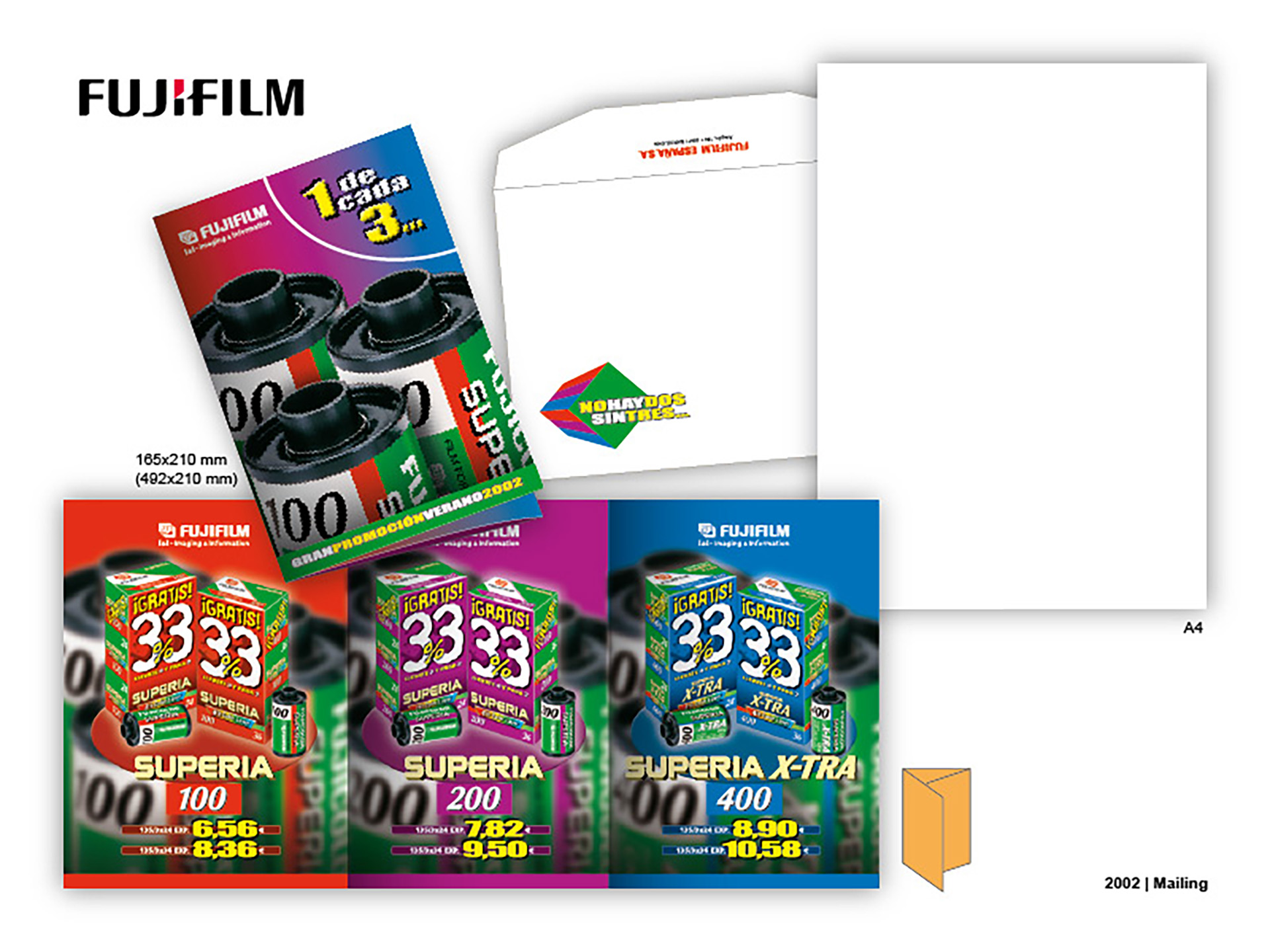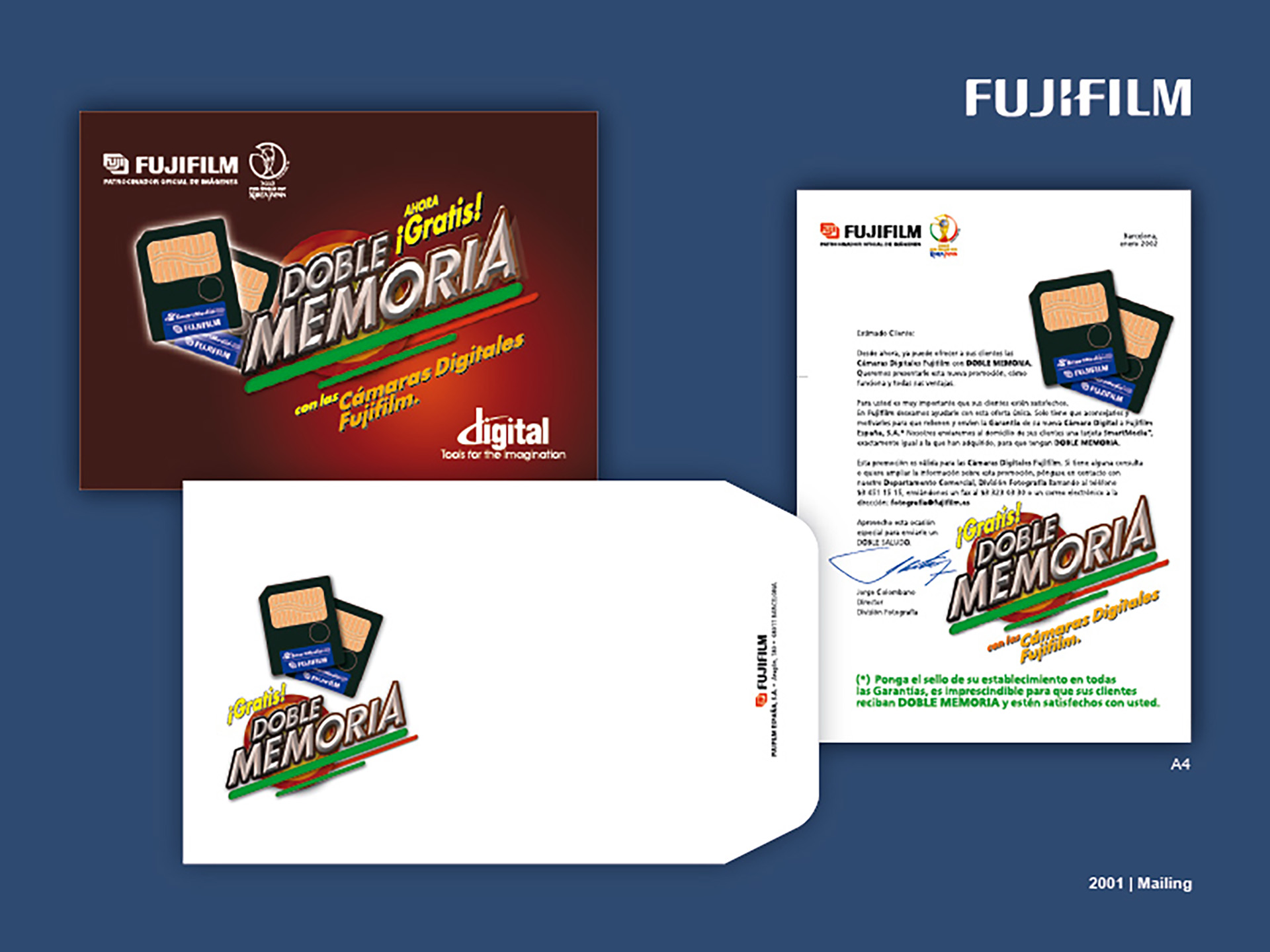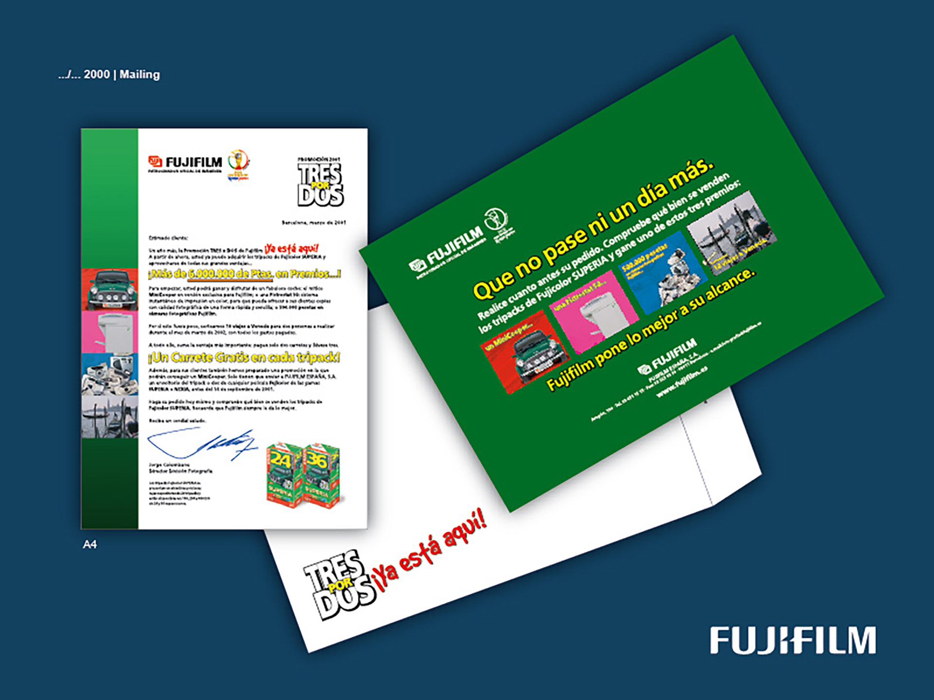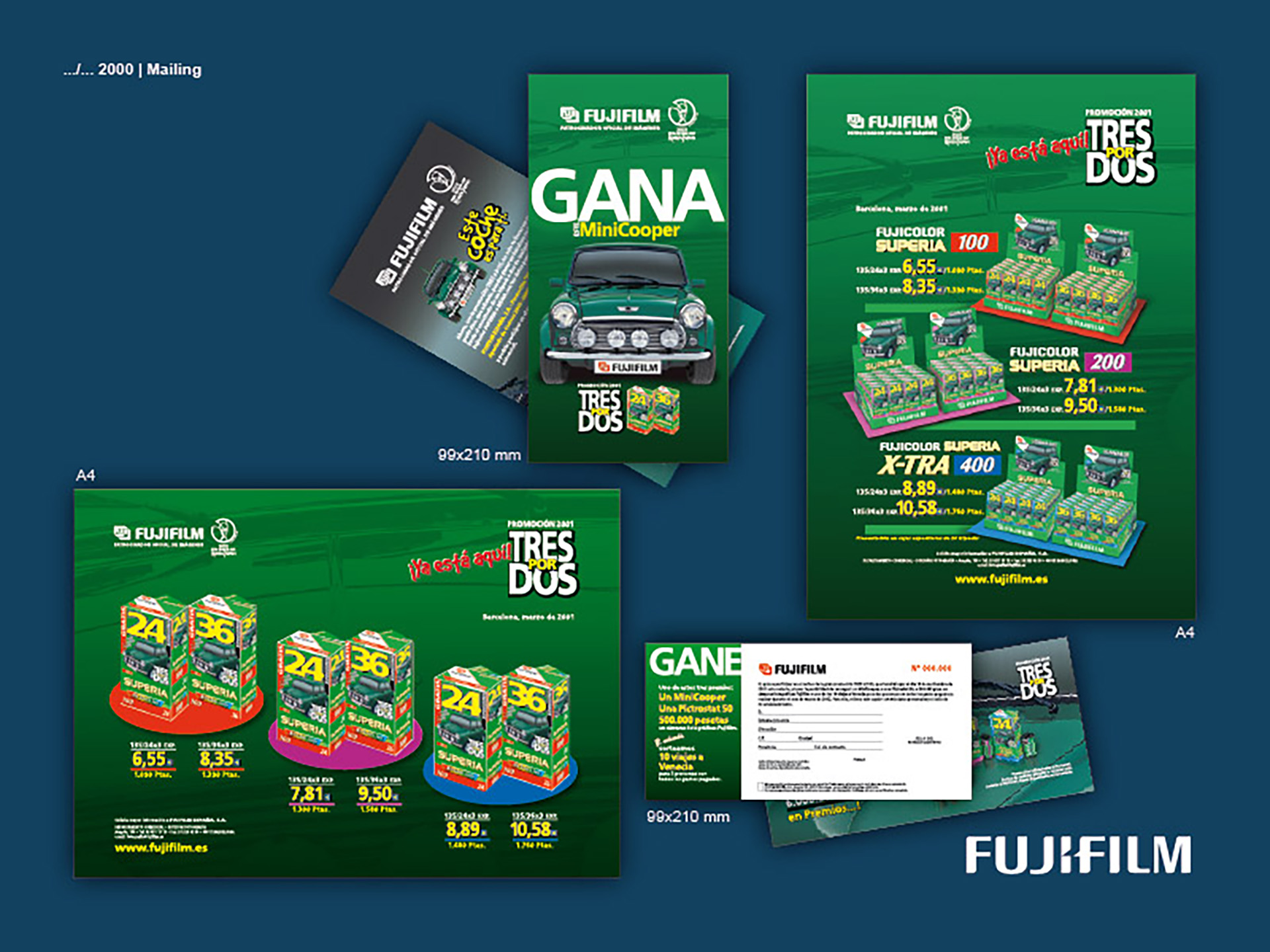 Cada mailing és una acció individual • Aquí es poden veure alguns de l'àmplia gamma de productes Fujifilm • Aquest tipus de comunicació estava destinada al client principal: les botigues • També es van desenvolupar aquest tipus d'accions per comunicar diferents esdeveniments de moment, com ara els campionats mundials de futbol, dels quals Fujifilm va ser patrocinador oficial d'imatge durant diversos anys.