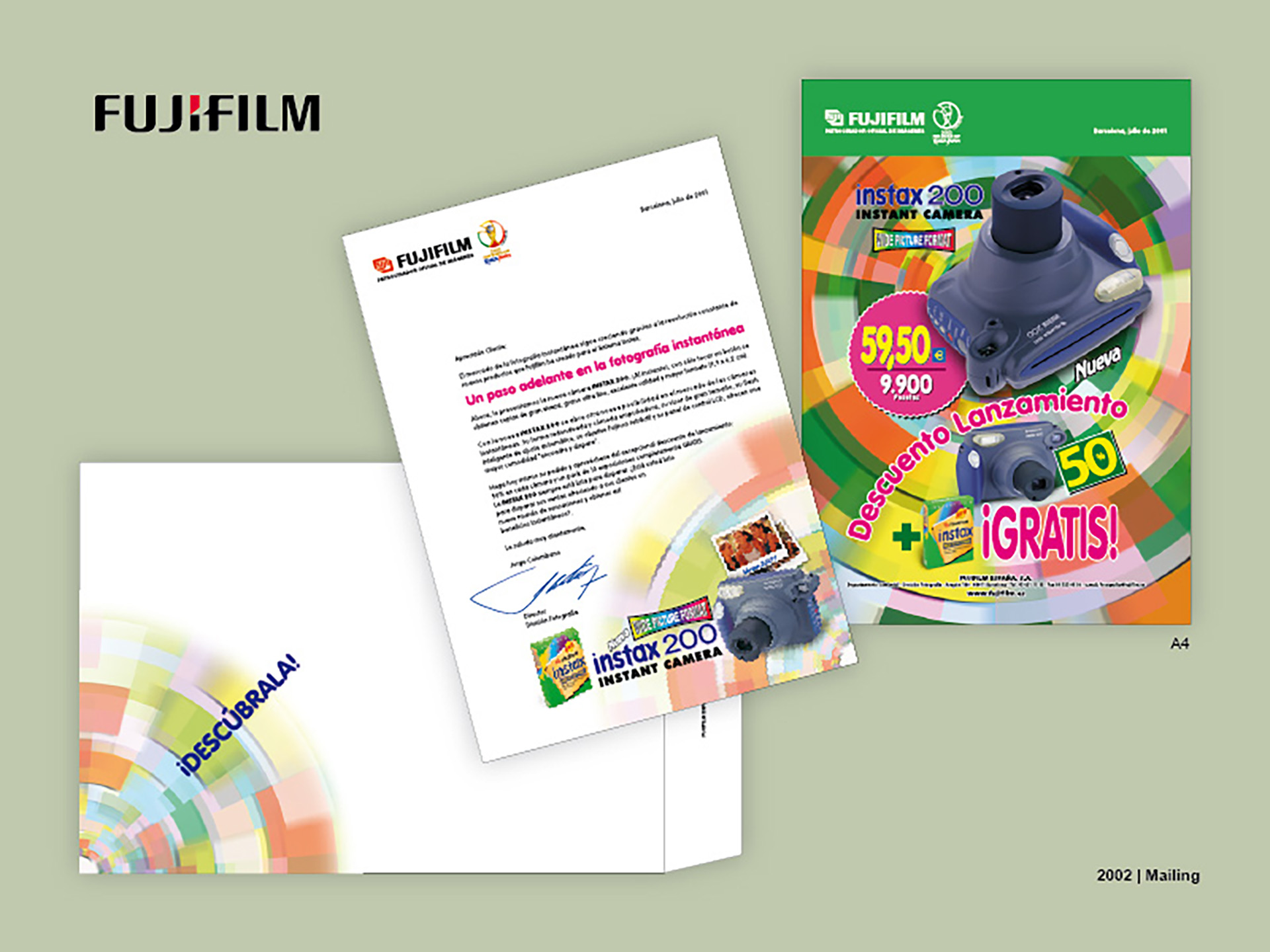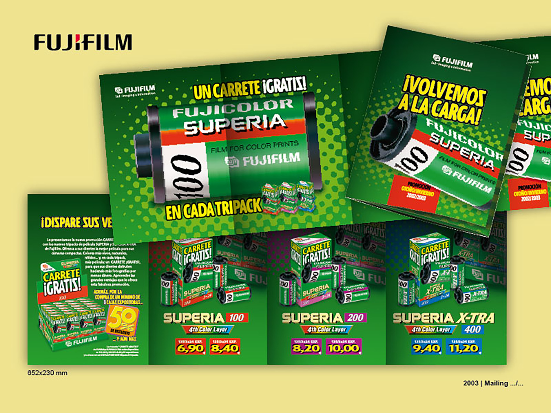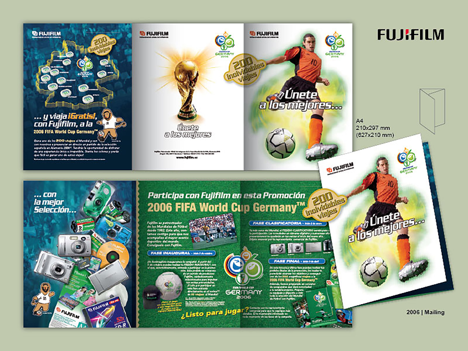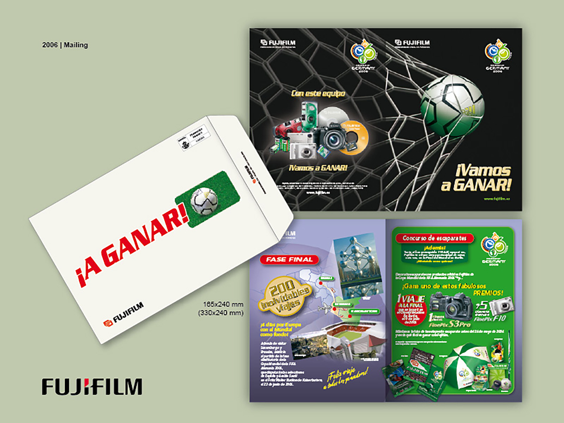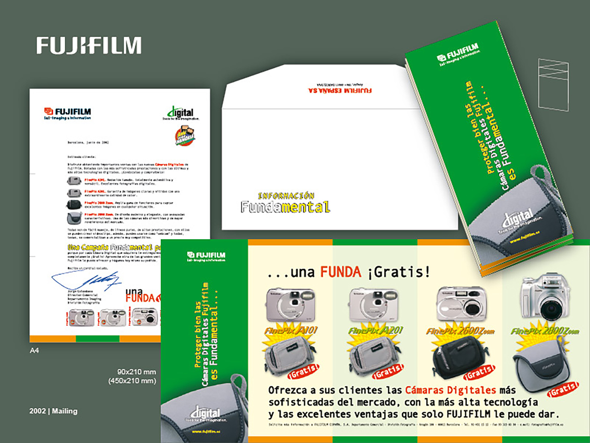 Cada mailing és una acció individual • Aquí es poden veure alguns de l'àmplia gamma de productes Fujifilm • Aquest tipus de comunicació estava destinada al client principal: les botigues • També es van desenvolupar aquest tipus d'accions per comunicar diferents esdeveniments de moment, com ara els campionats mundials de futbol, dels quals Fujifilm va ser patrocinador oficial d'imatge durant diversos anys.