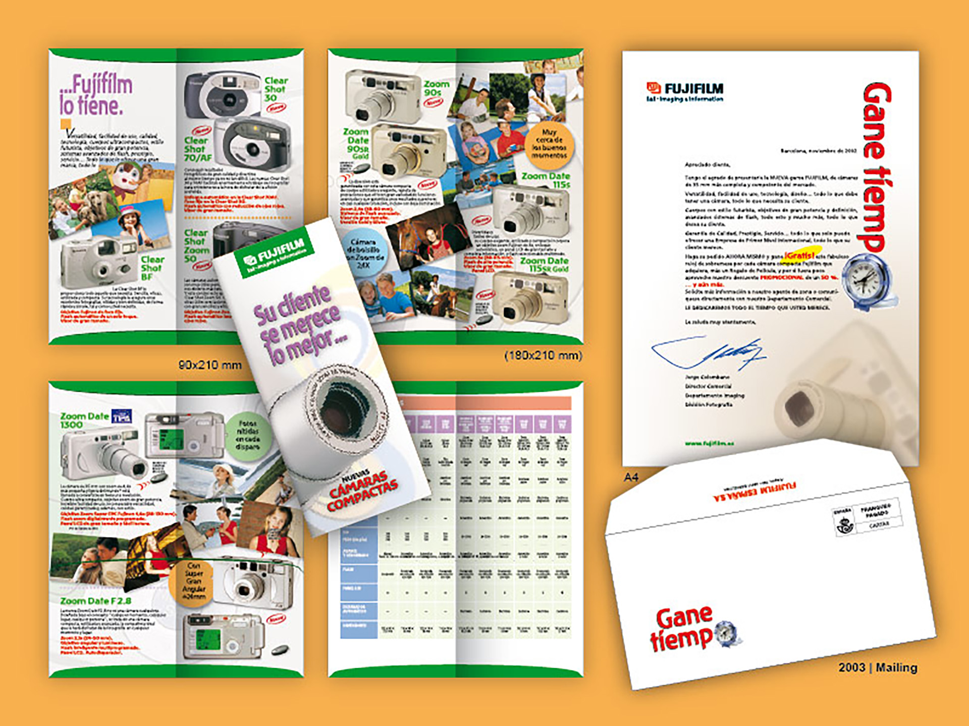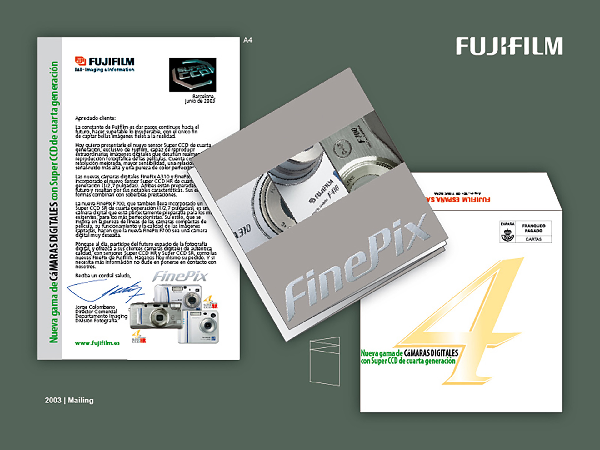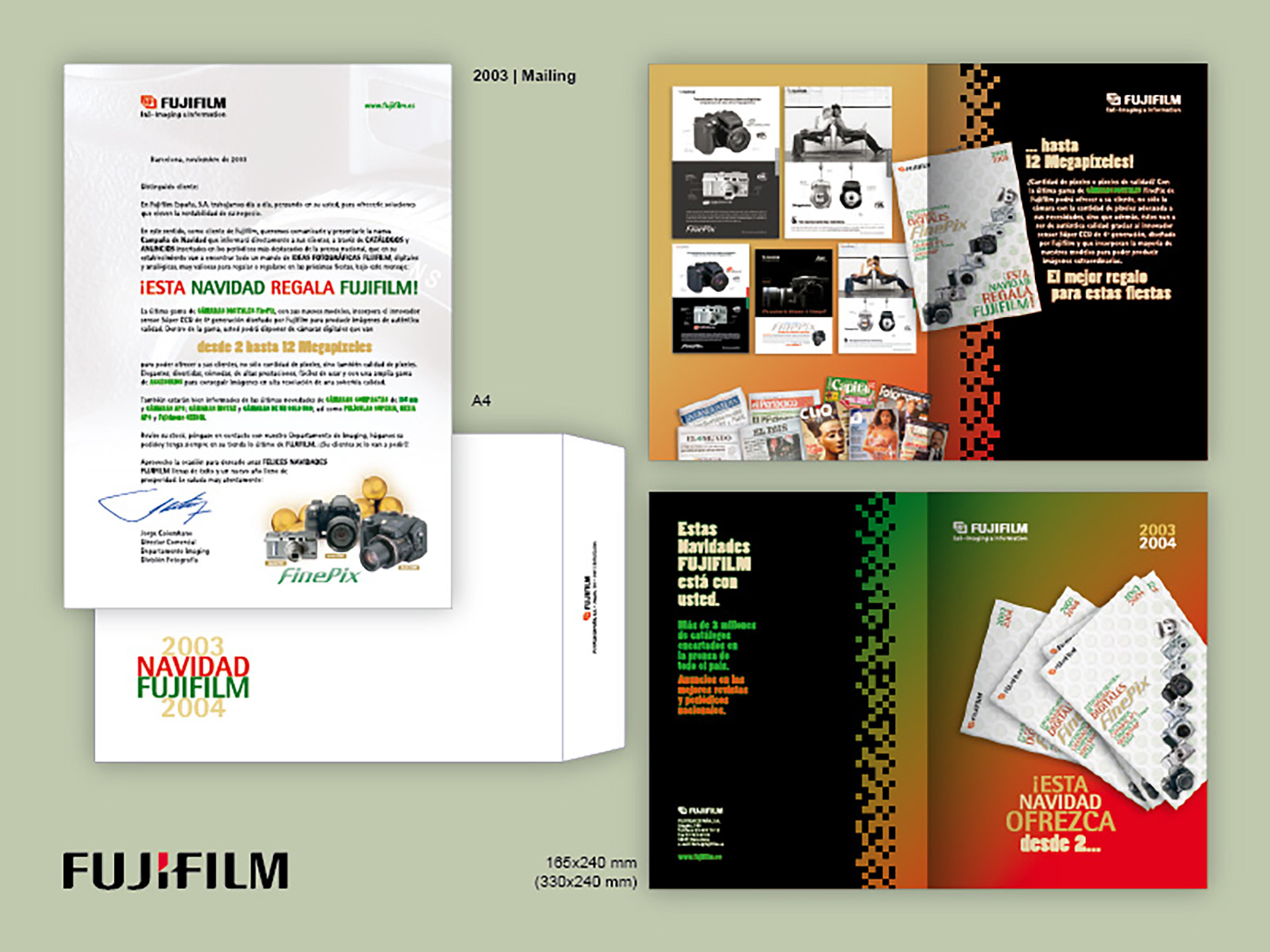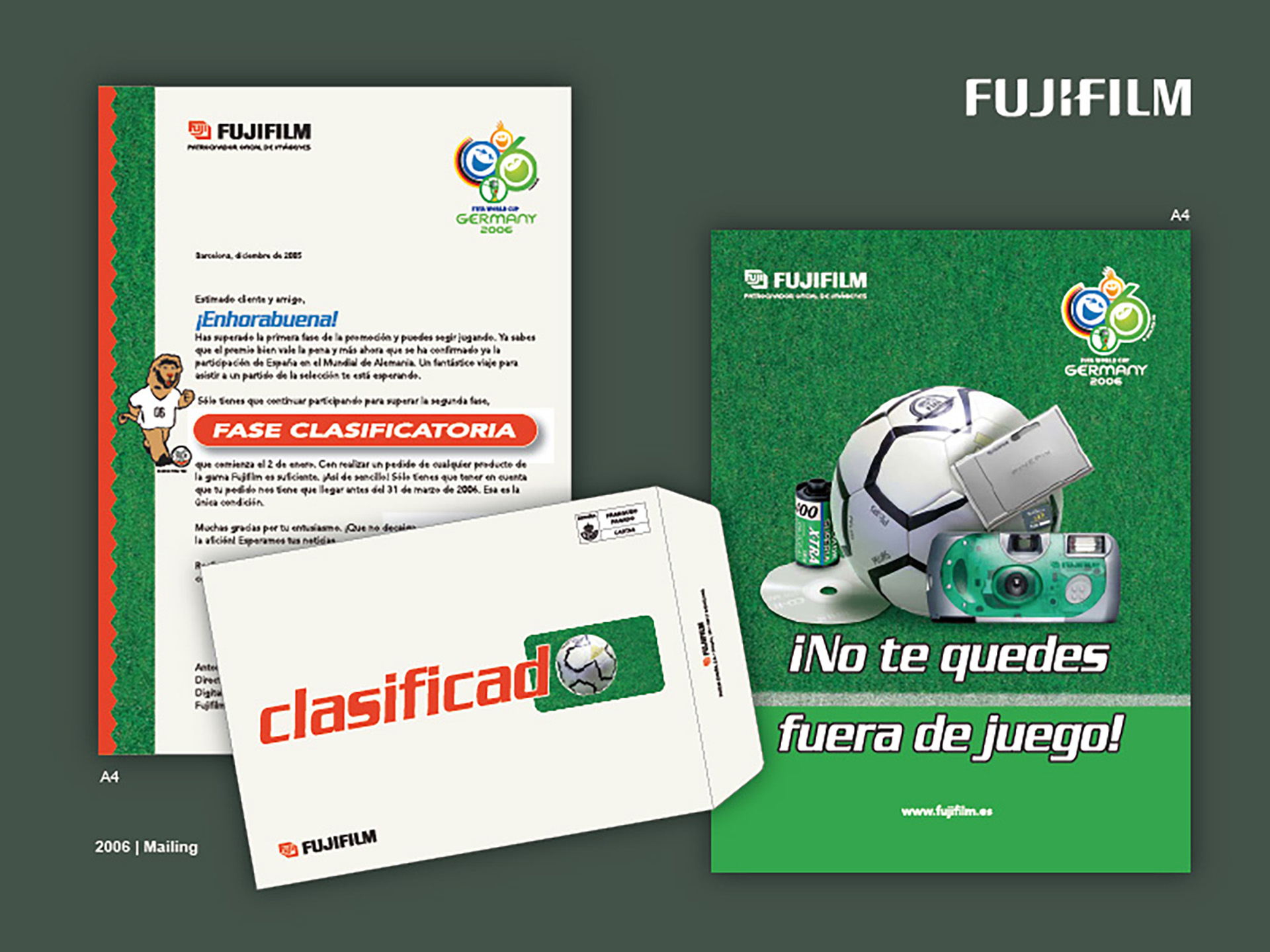 Cada mailing és una acció individual • Aquí es poden veure alguns de l'àmplia gamma de productes Fujifilm • Aquest tipus de comunicació estava destinada al client principal: les botigues • També es van desenvolupar aquest tipus d'accions per comunicar diferents esdeveniments de moment, com ara els campionats mundials de futbol, dels quals Fujifilm va ser patrocinador oficial d'imatge durant diversos anys.