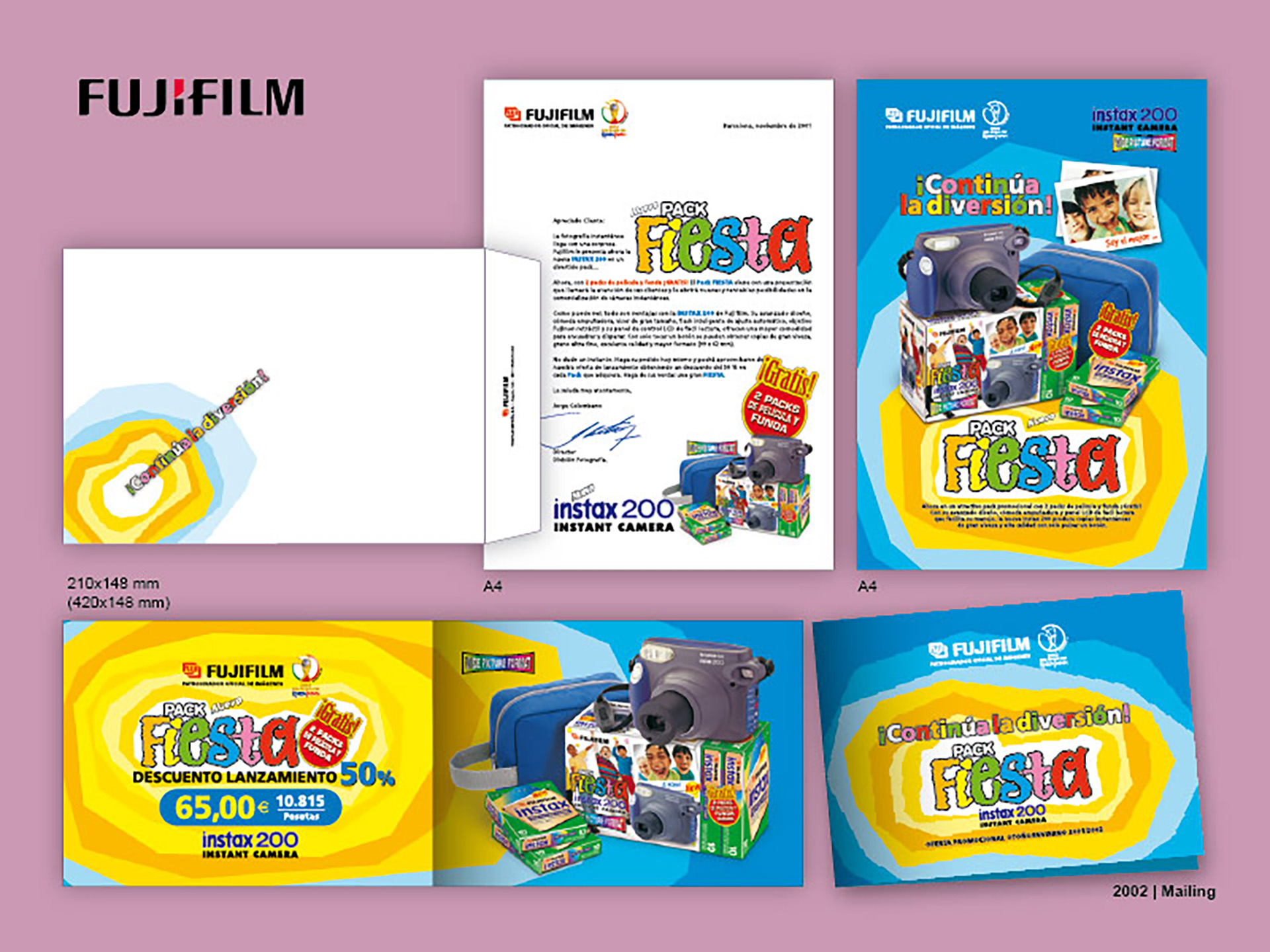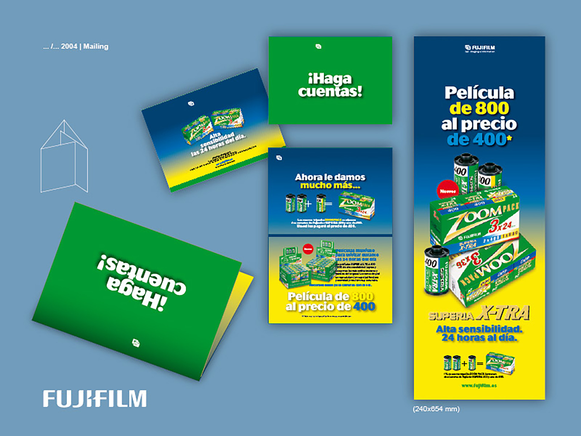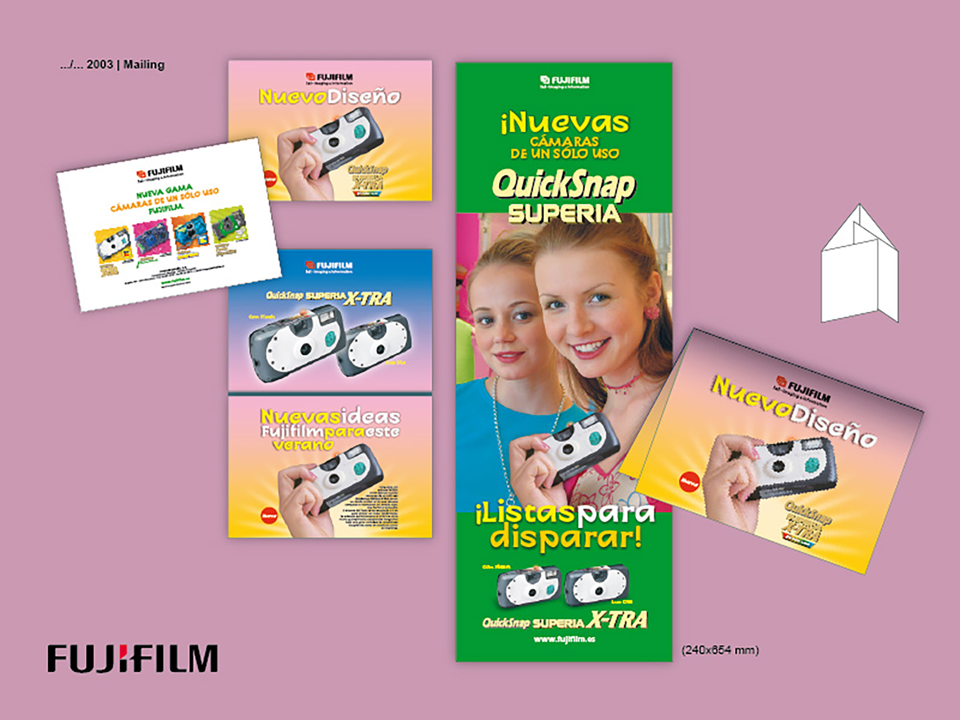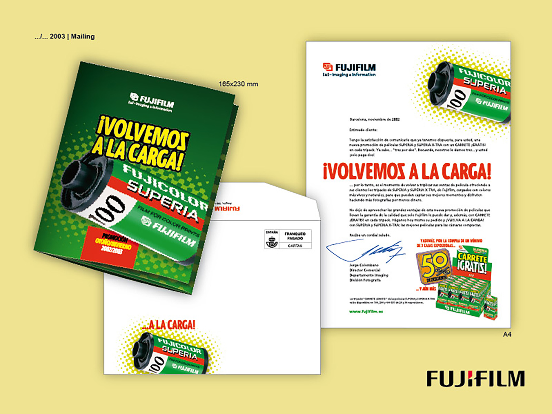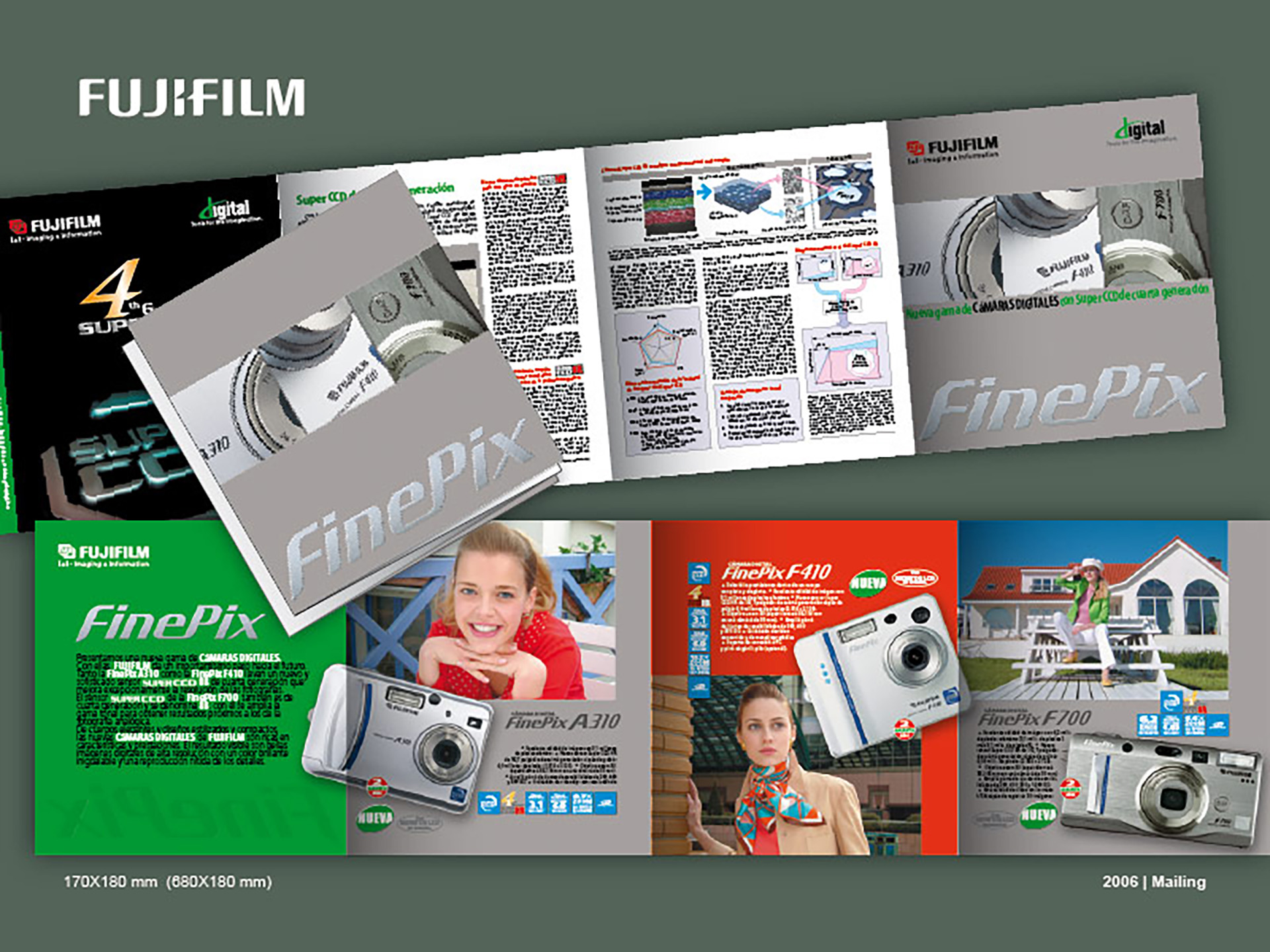 Cada mailing és una acció individual • Aquí es poden veure alguns de l'àmplia gamma de productes Fujifilm • Aquest tipus de comunicació estava destinada al client principal: les botigues • També es van desenvolupar aquest tipus d'accions per comunicar diferents esdeveniments de moment, com ara els campionats mundials de futbol, dels quals Fujifilm va ser patrocinador oficial d'imatge durant diversos anys.