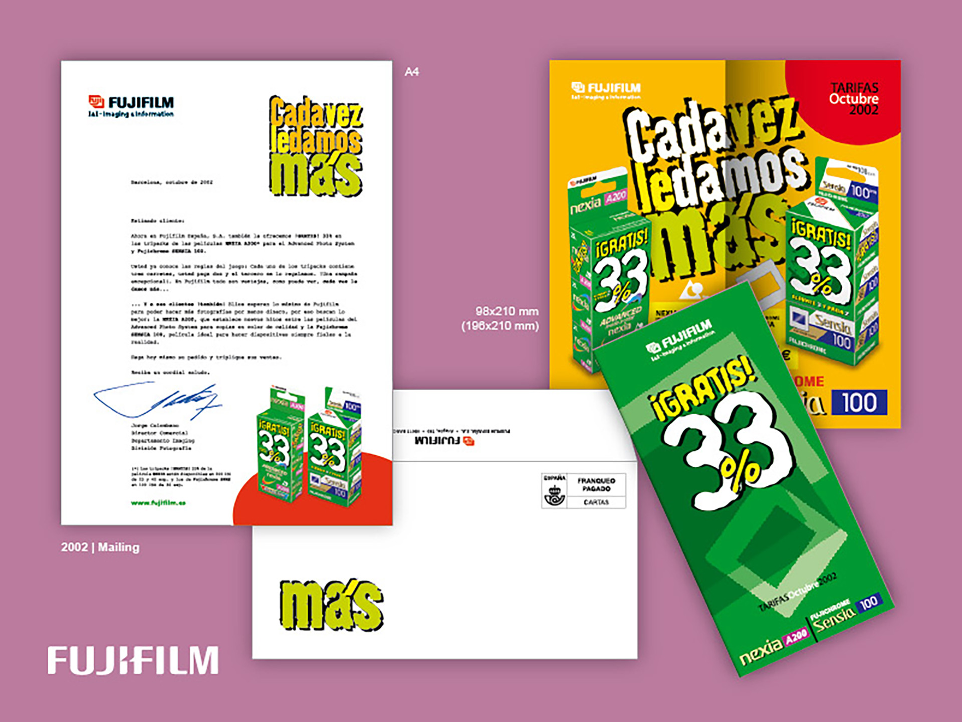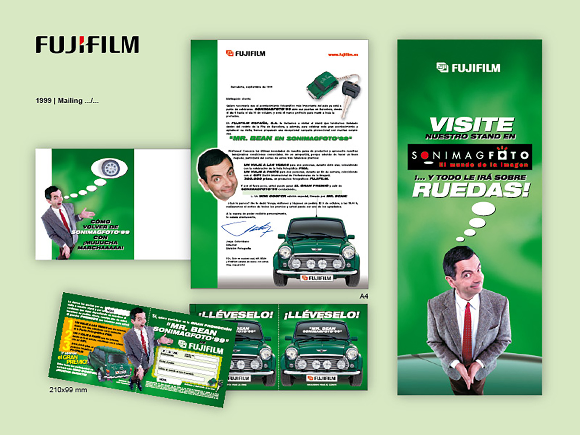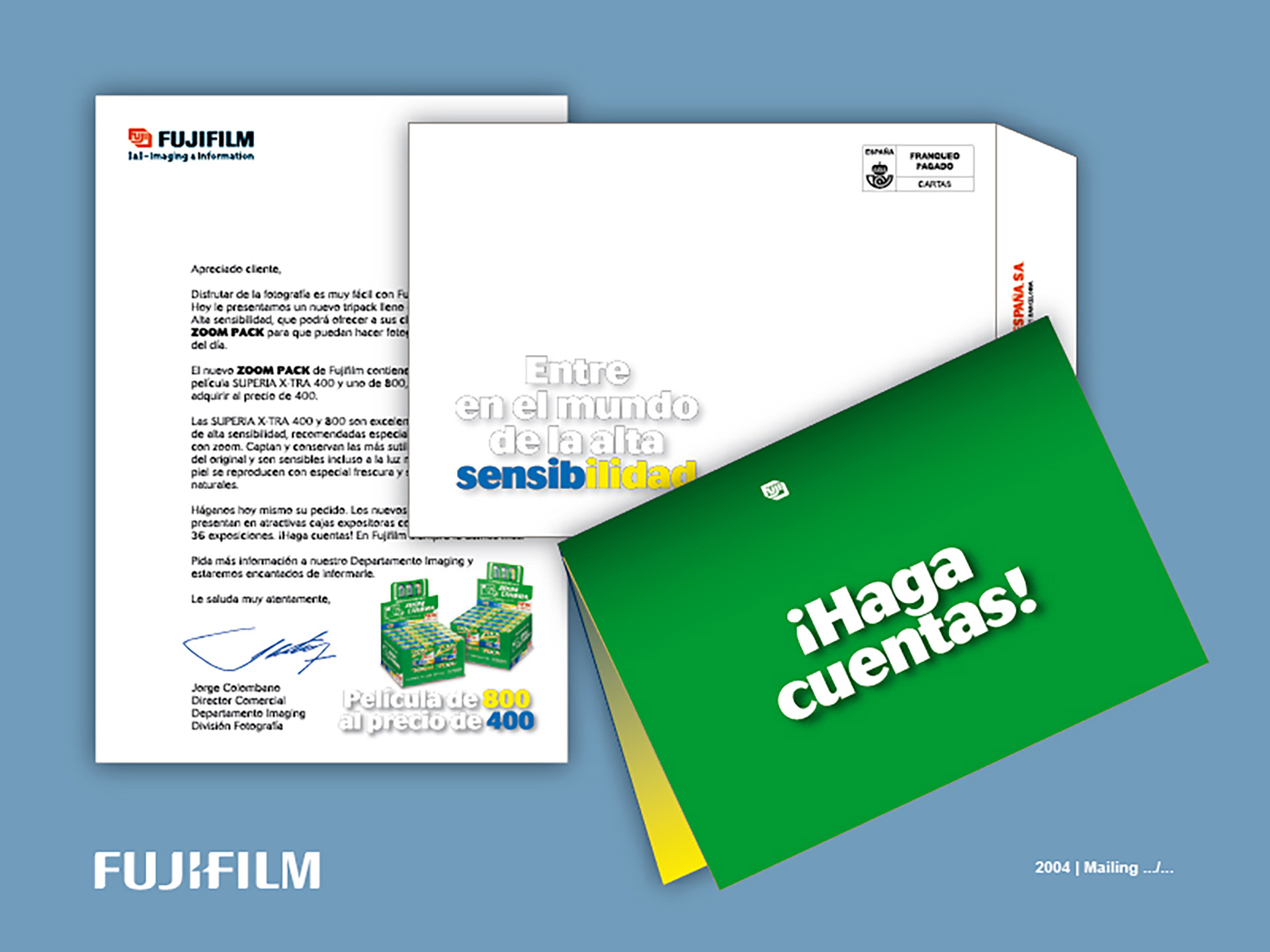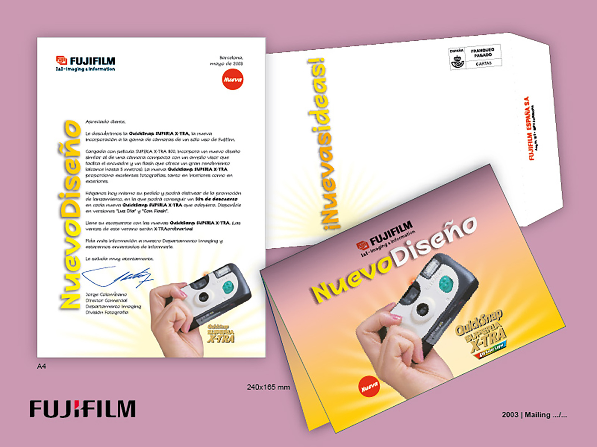 Cada mailing és una acció individual • Aquí es poden veure alguns de l'àmplia gamma de productes Fujifilm • Aquest tipus de comunicació estava destinada al client principal: les botigues • També es van desenvolupar aquest tipus d'accions per comunicar diferents esdeveniments de moment, com ara els campionats mundials de futbol, dels quals Fujifilm va ser patrocinador oficial d'imatge durant diversos anys.