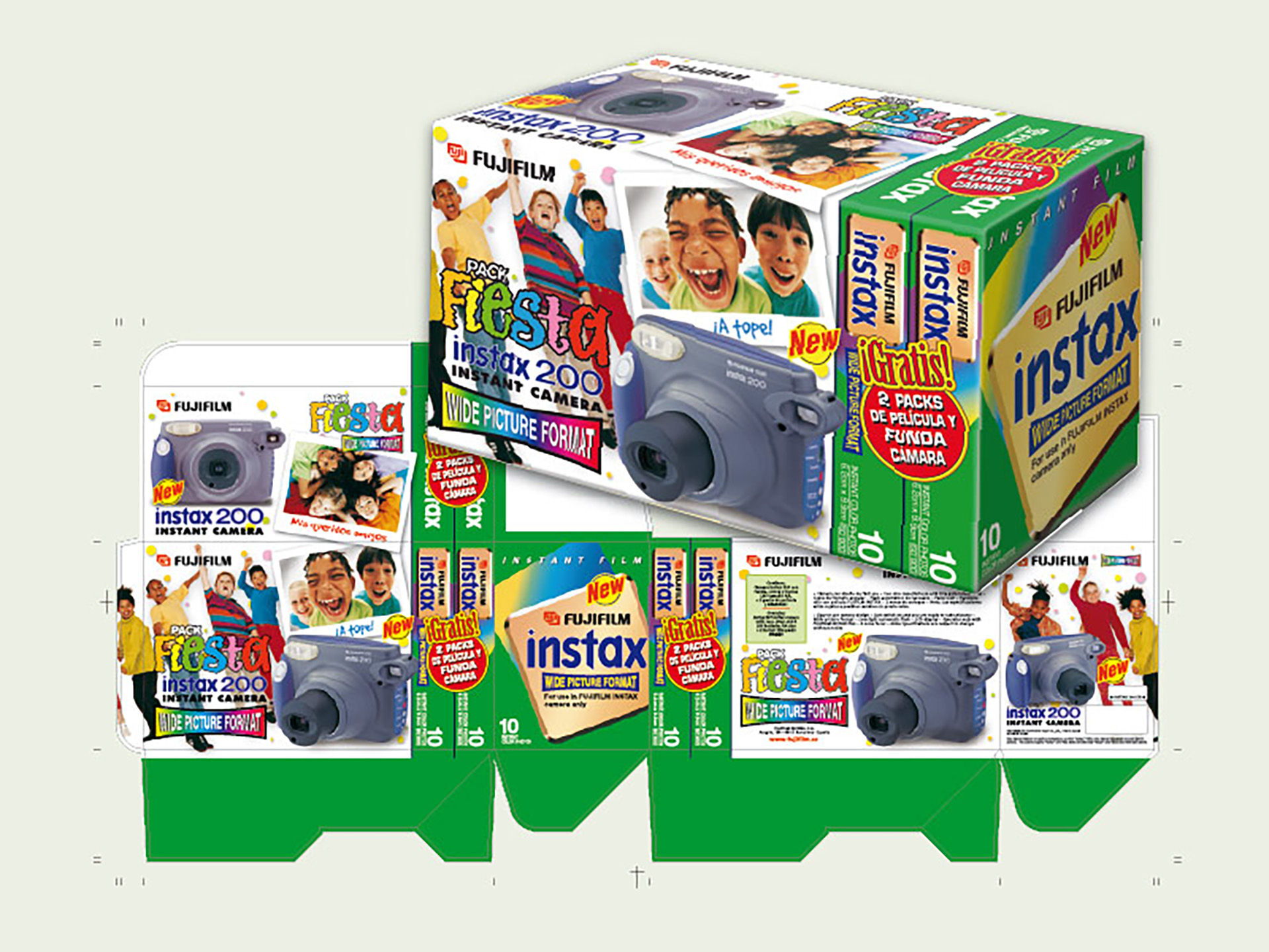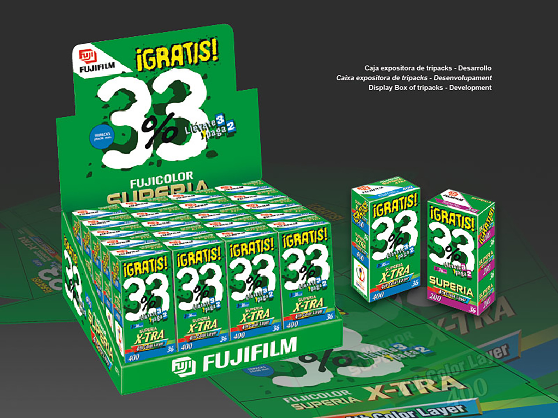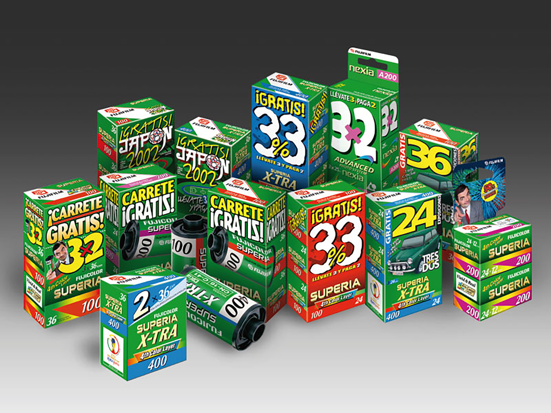 Packs de totes les classes per als productes fotogràfics de Fujifilm Espanya. • Bipacks i tripacks amb rodets de pel·lícula per a promocions com «3x2 - Emporta't 3 i paga 2», «Rodet gratis», «50% de pel·lícula gratis», «Gratis 33%» ... i, també, dissenyats per a grans esdeveniments esportius , com la Copa de Món de Futbol d'Itàlia, França, Holanda, Japó, etc. • Les càmeres d'un sol ús QuickSnap presentaven un embolcall decorat amb diversos motius, com els Smile (divertits personatges com Hedra, Orio, Constela i Cosmo); els packs promocionals de les càmeres Instax incloïen packs de pel·lícula i funda gratis; i les ofertes especials de les càmeres Nexia Q1 (Advanced Photo System) es venien en atractives bosses de material plàstic • Tot això va abastar una àmplia època, en la qual vam crear un autèntic historial gràfic que va portar a Fujifilm Espanya a aconseguir una atractiva cota d'alta qualitat i bona presentació reconeguda per tot el mercat.