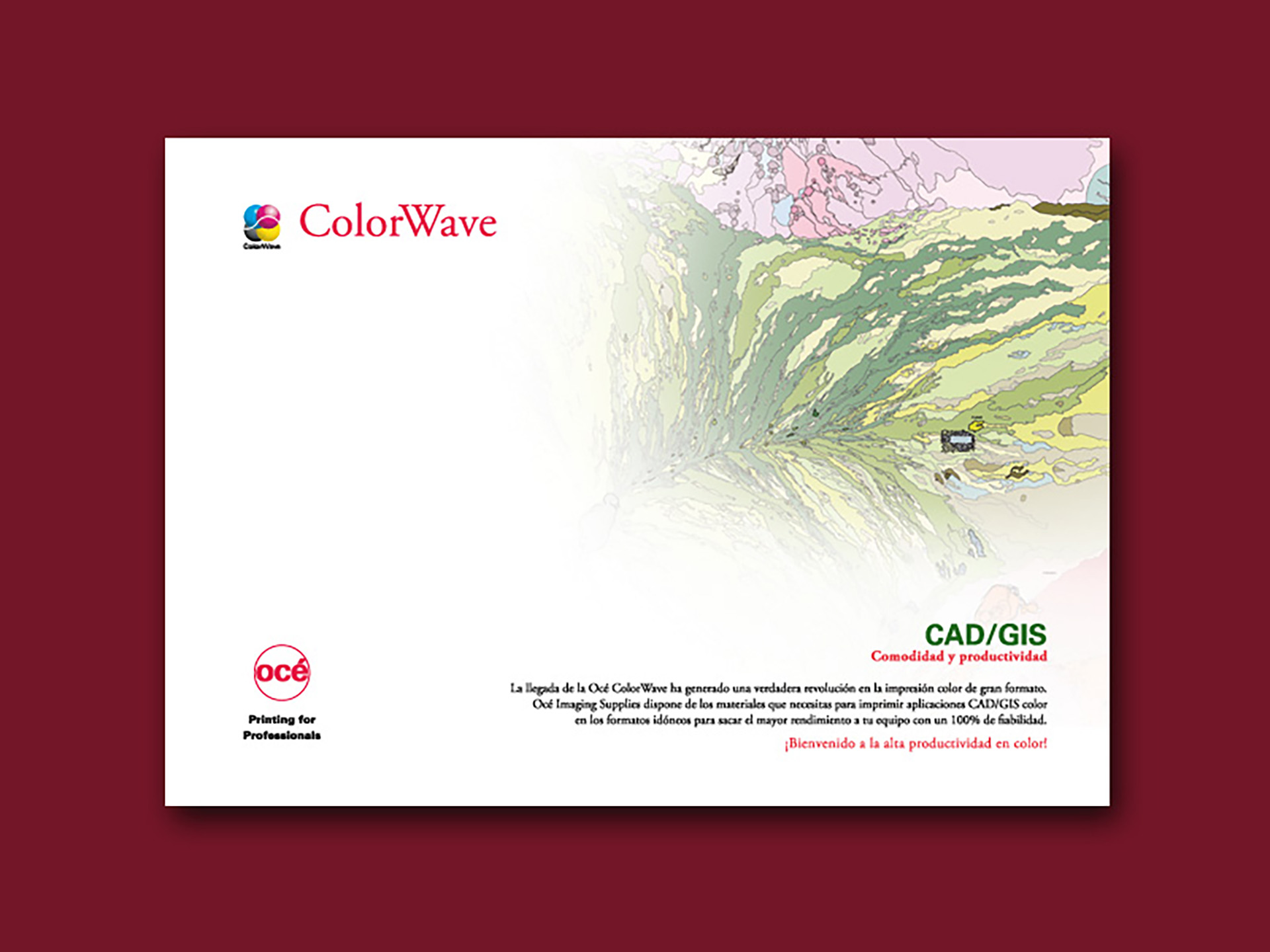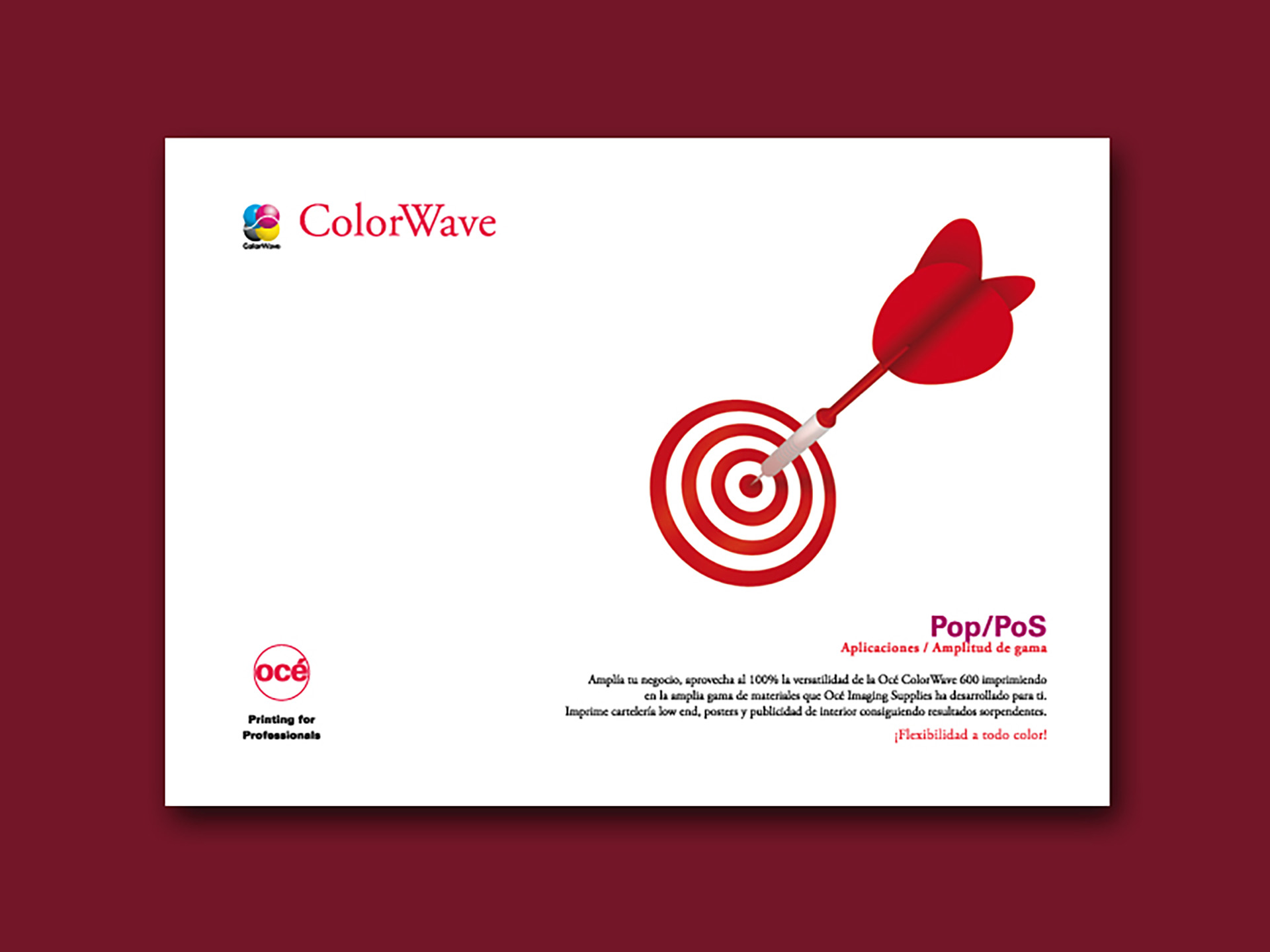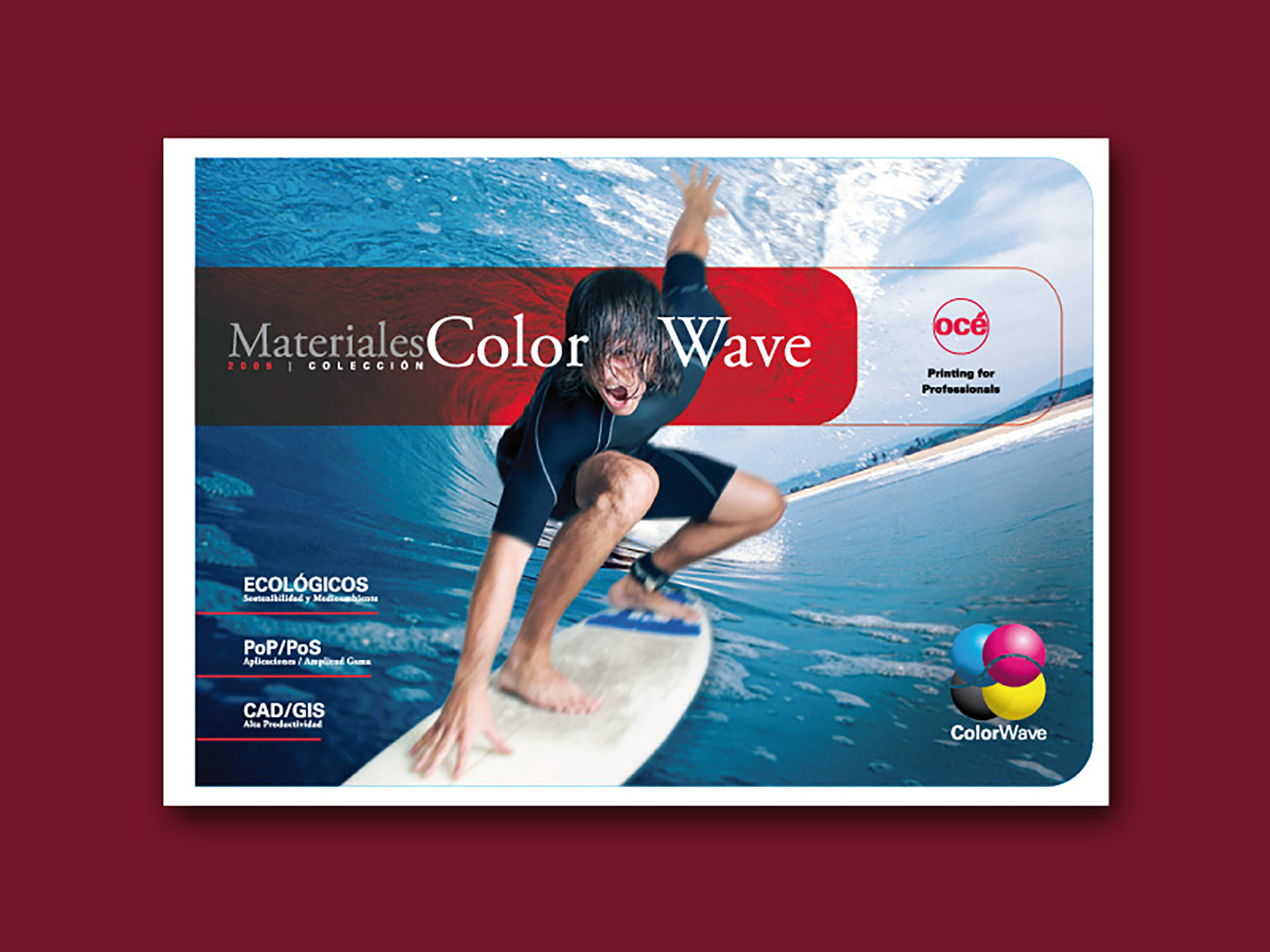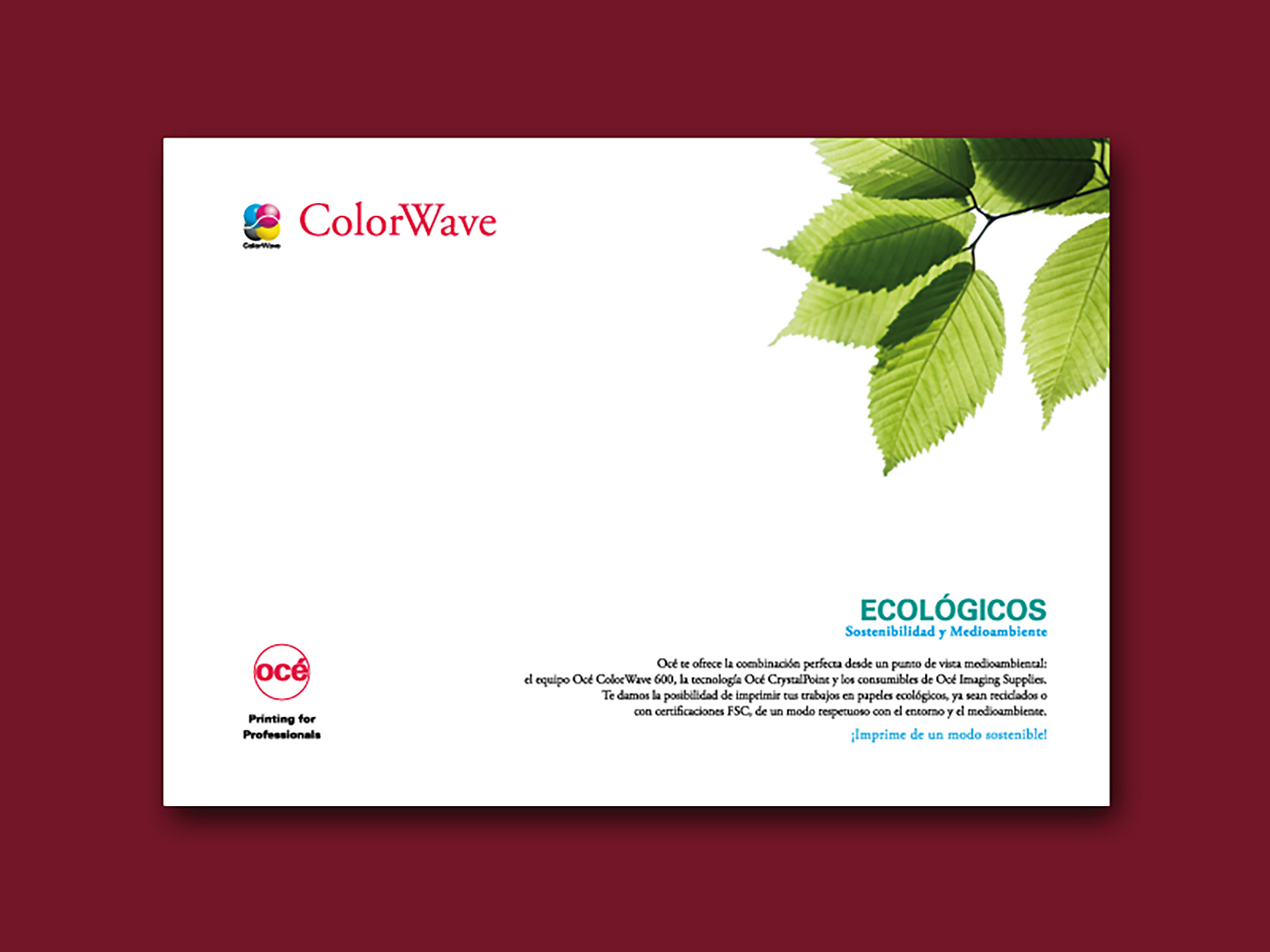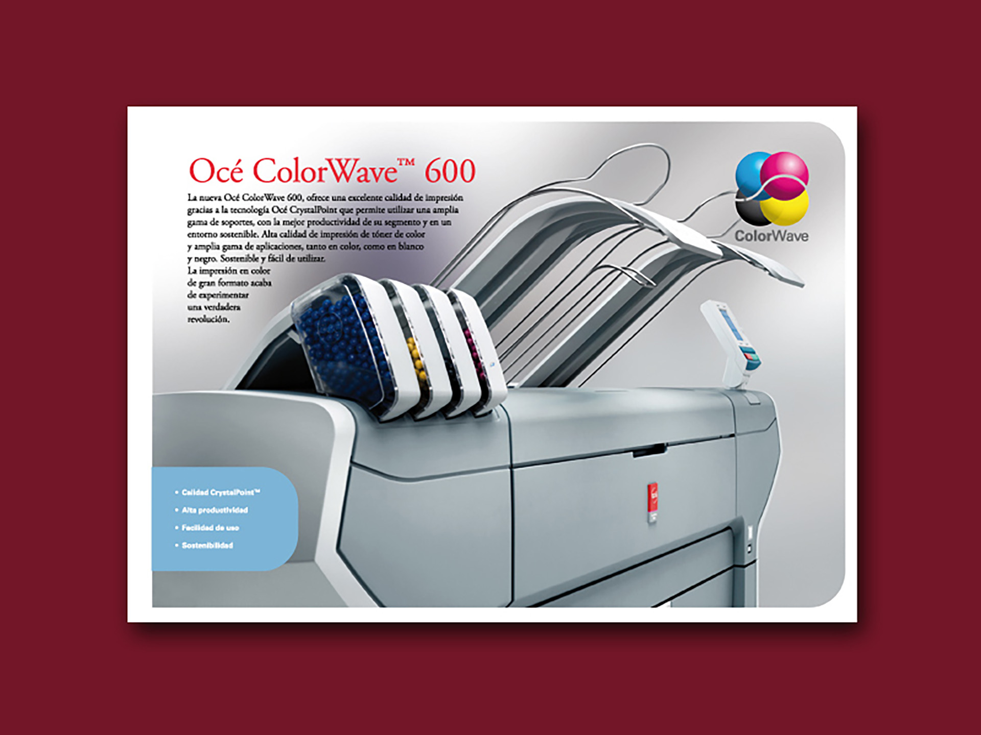 Creació d'un gran catàleg-mostrari amb els diferents suports consumibles d'Océ per utilitzar en l'Océ Color Wave ™ 600, amb la nova tecnologia Océ CrystalPoint • Una sèrie d'exemples d'aplicacions impresos sobre suports reals configuren tot el mostrari • Desde papers ecològics («Imprimeix d'una manera sostenible!»), Passant per una sèrie de materials per a cartelleria, pòsters i publicitat interior a botigues («Flexibilitat a tot color!»), Fins a suports per imprimir aplicacions CAD / GIS de gran format («Benvingut a l'alta productivitat en color!») • Va ser un altre treball minuciós de recerca, realització i creació d'idees reals d'aplicacions per fer que el missatge arribés més clar als clients consumidors d'Océ • Setembre i octubre de 2008; format de les làmines: A3 (420 x 297 mm); 19 làmines més portades.