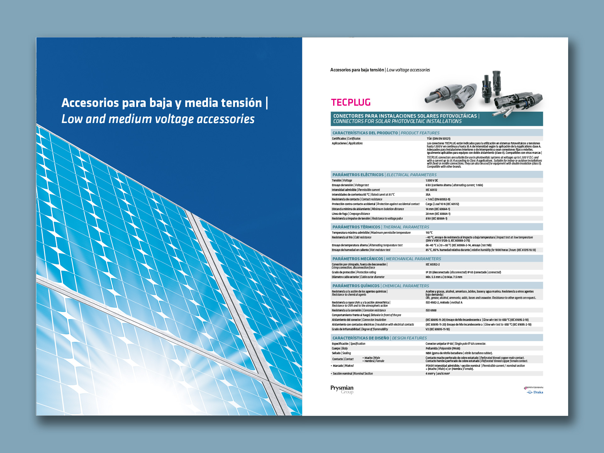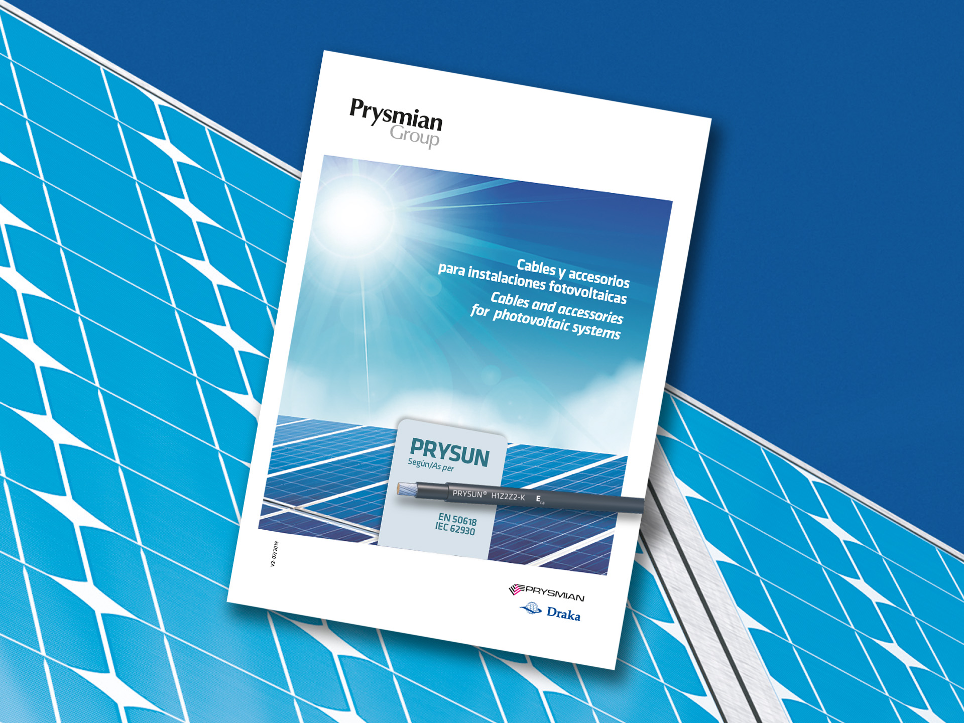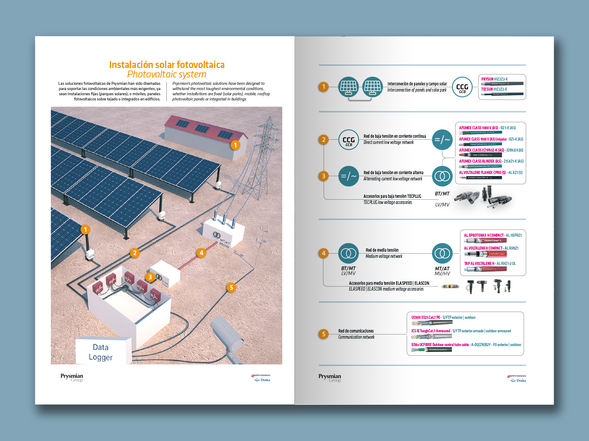 L'any 2020, Prysmian Group, ens encarrega el disseny i l'edició gràfica del Catàleg de Cables i Accessoris per a Instal·lacions fotovoltaiques • Una altra vegada ficats entre la fredor del producte en si i l'atractiva opció de poder revestir-la amb aquesta presentació càlida • 32 pàgines plenes de documentació tècnica amanides amb imatges que ens relaxen entre tema i tema • Anteriorment ja havíem realitzat l'edició de l'any 2018 i 2019 del mateixa catàleg.