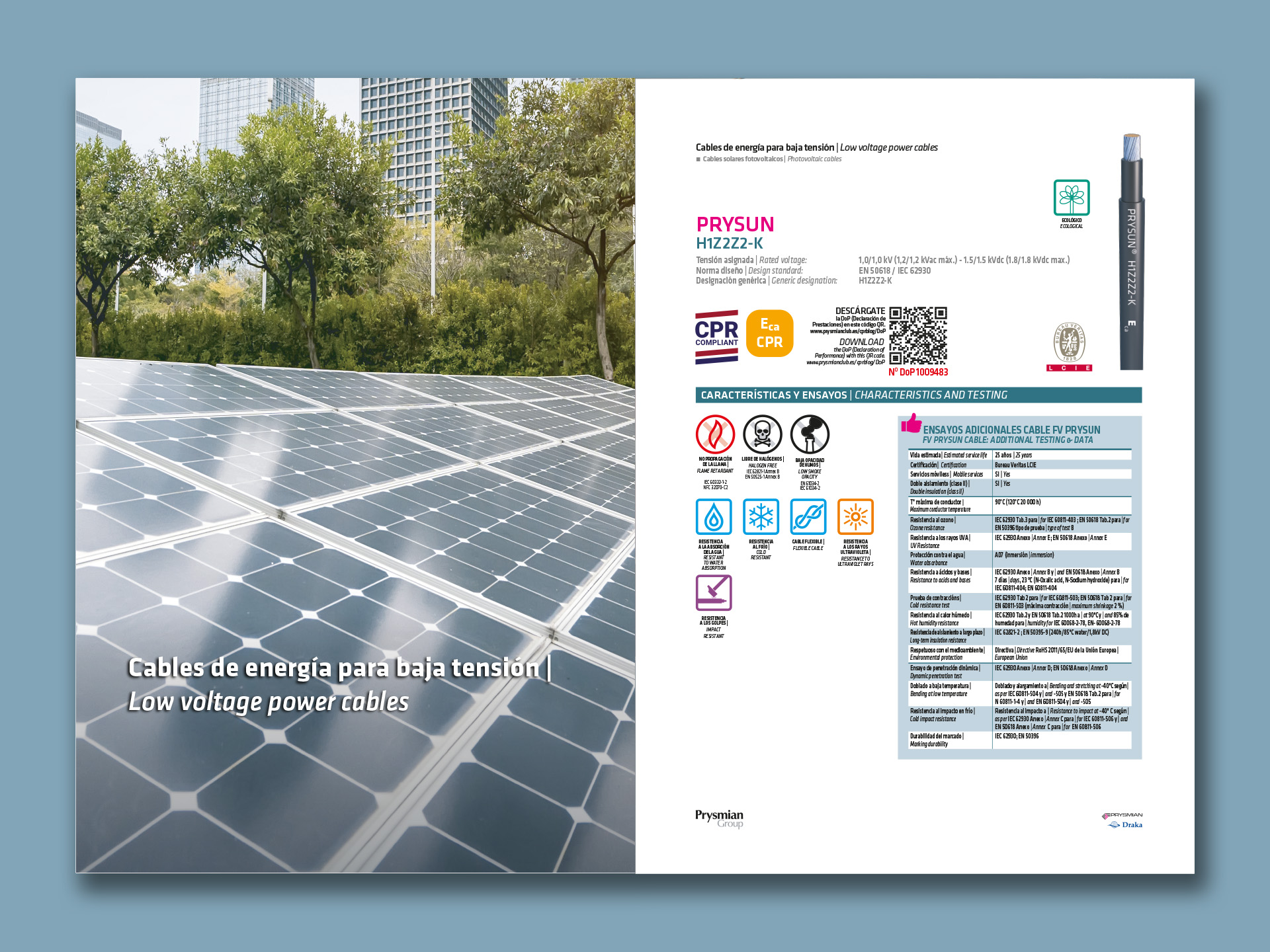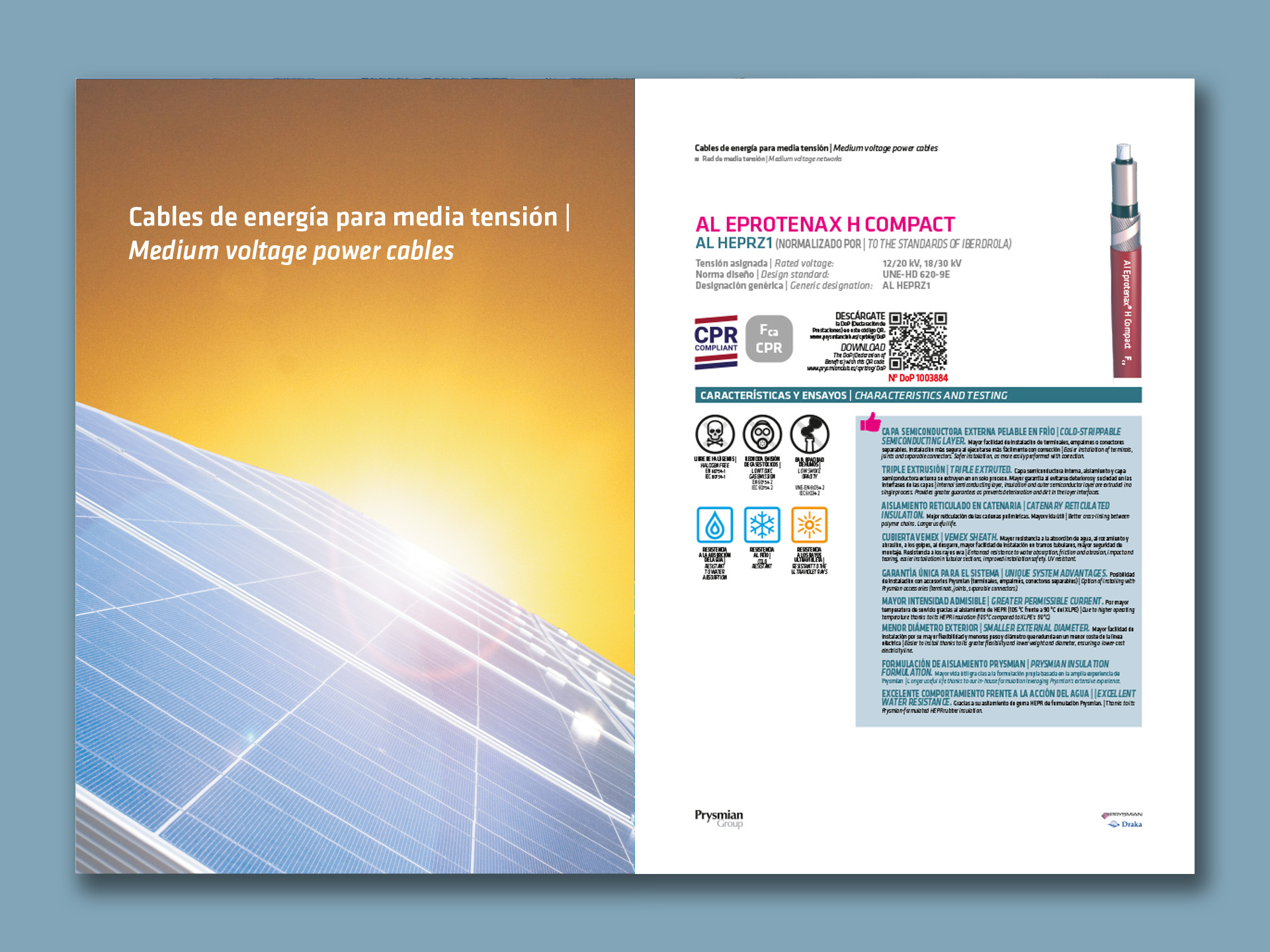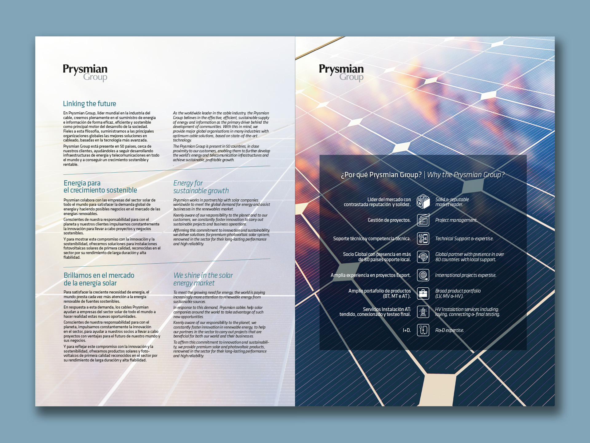 L'any 2020, Prysmian Group, ens encarrega el disseny i l'edició gràfica del Catàleg de Cables i Accessoris per a Instal·lacions fotovoltaiques • Una altra vegada ficats entre la fredor del producte en si i l'atractiva opció de poder revestir-la amb aquesta presentació càlida • 32 pàgines plenes de documentació tècnica amanides amb imatges que ens relaxen entre tema i tema • Anteriorment ja havíem realitzat l'edició de l'any 2018 i 2019 del mateixa catàleg.