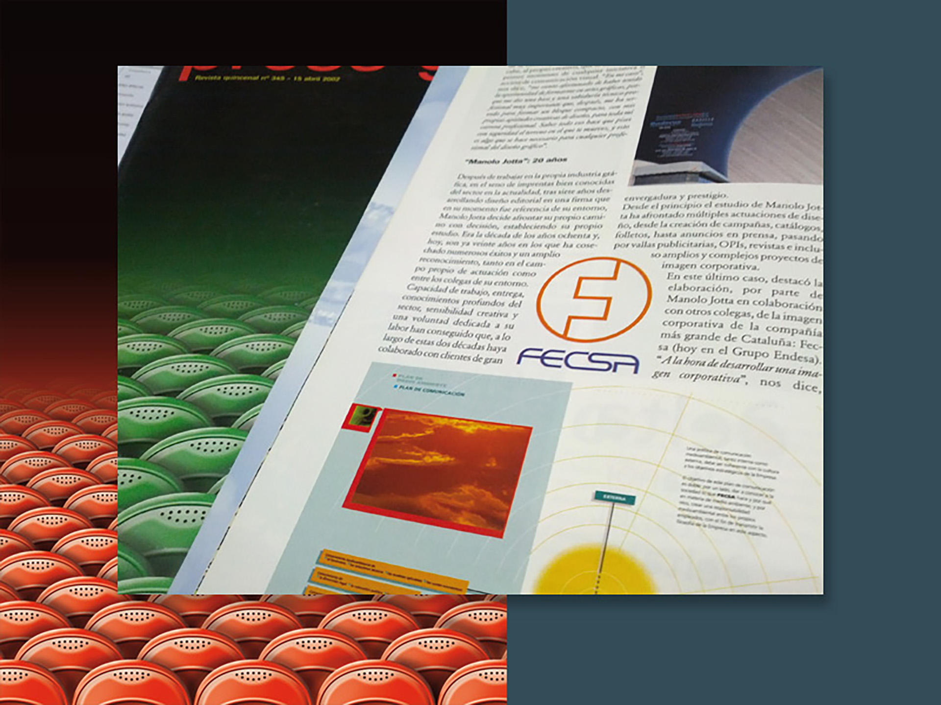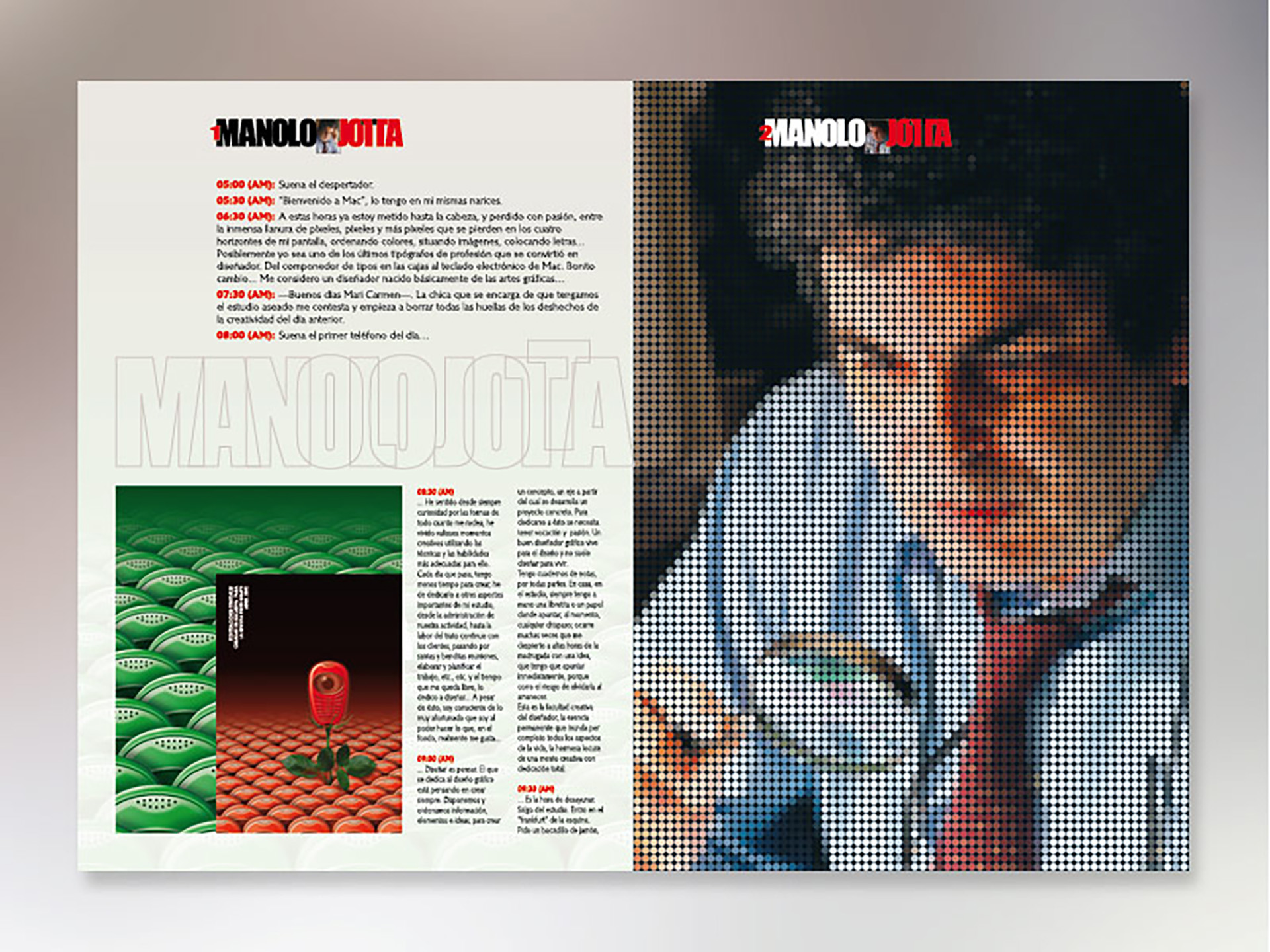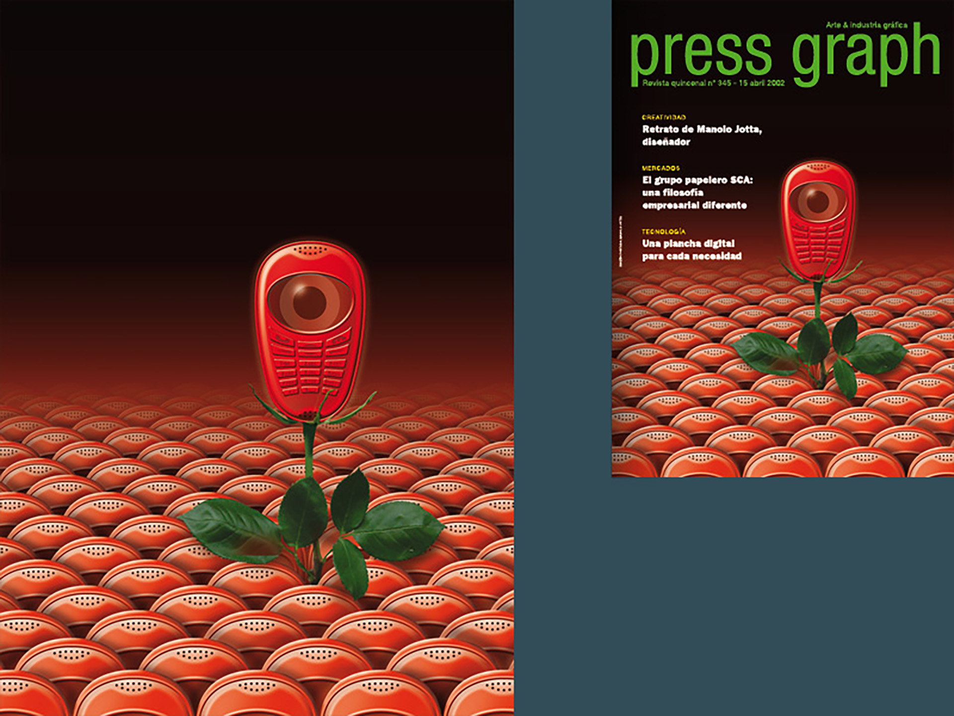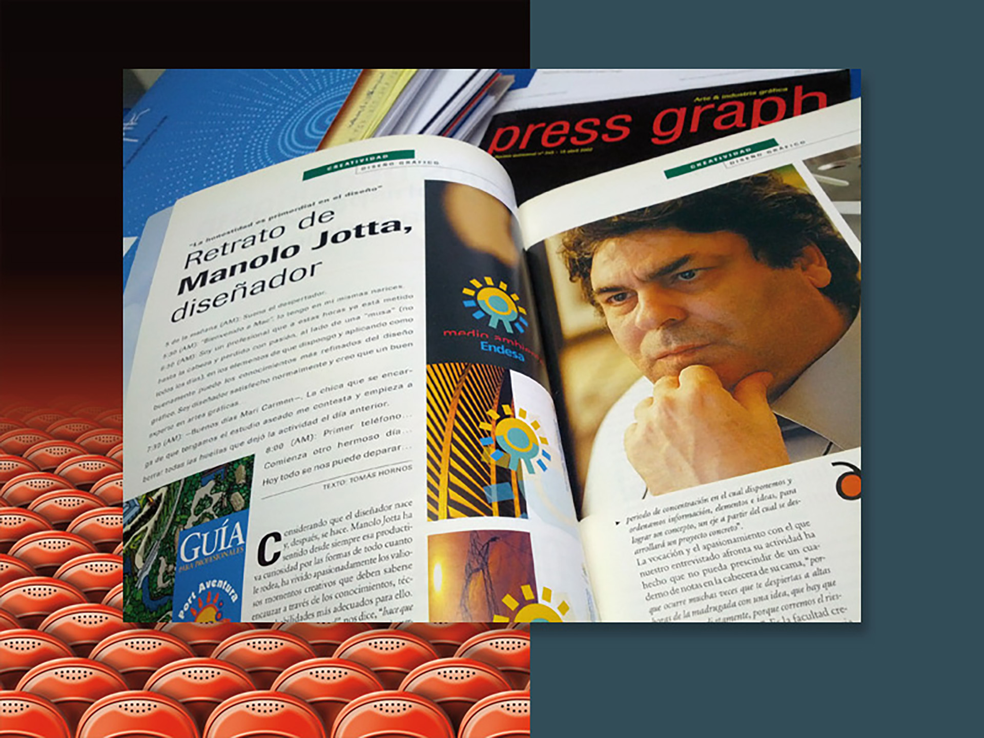 Allà pel mes de febrer de l'any 2002, vaig rebre una trucada de Tomàs Forns, de la redacció de la revista Press Graph (la revista dels professionals de la indústria gràfica i la comunicació impresa) • Volia fer-me una àmplia entrevista (set pàgines) i em va demanar una il·lustració per a cadascun dels dos nombres a publicar al mes d'abril de el mateix any • Coincidint aquest mes amb la festa de la rosa de Sant Jordi, vaig recrear les il·lustracions amb motius rabiosament actuals de al moment. L'ecologisme i la tecnologia punta a el servei de la popular festa • Per aquella època (2003), la revista Artegrafica, concretament en el seu número 6, també va dedicar tot el seu contingut a la publicació de l'obra de catorze dissenyadors made in Catalunya • Cada autor va dissenyar les seves pròpies pàgines. En aquesta selecció, a part d'una àmplia mostra de la producció de disseny gràfic realitzada per l'estudi, destaco la peça d'un autoretrat confeccionat amb topos circulars grans • Molts cercles de diferent to, però, cada un d'ells, per separat, d'un mateix color.