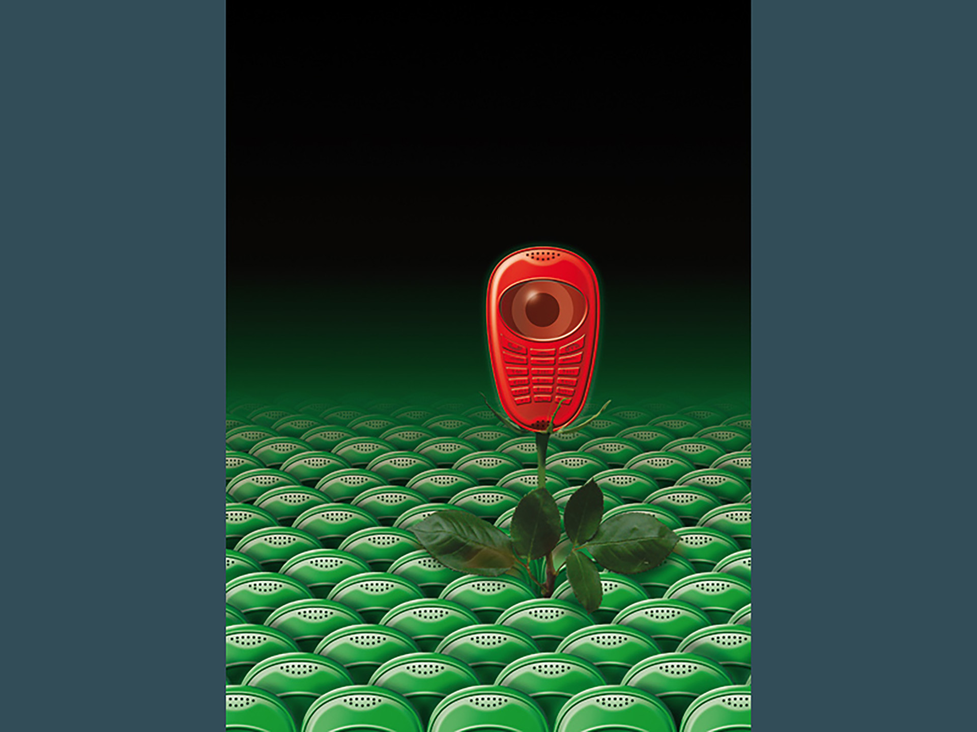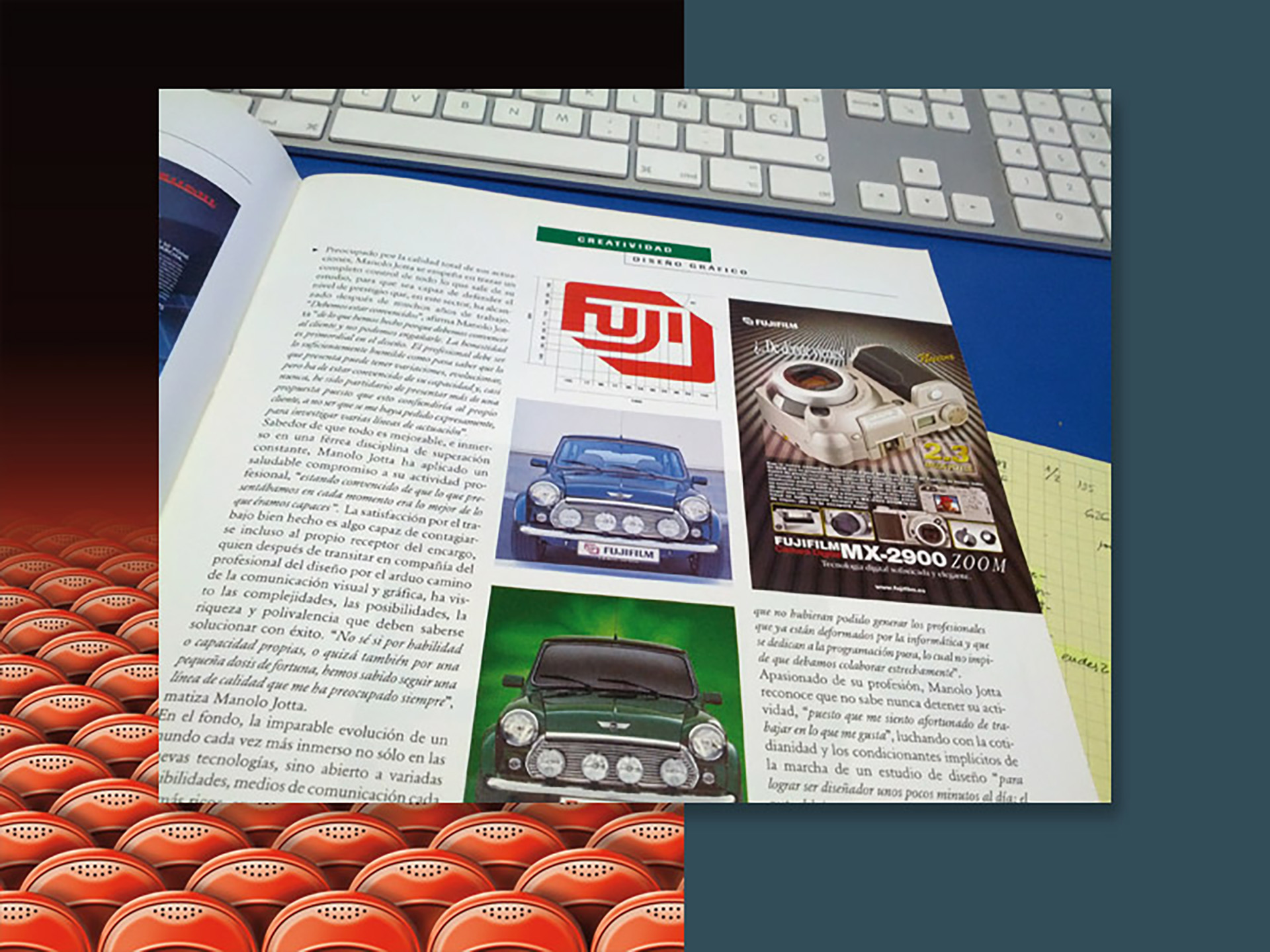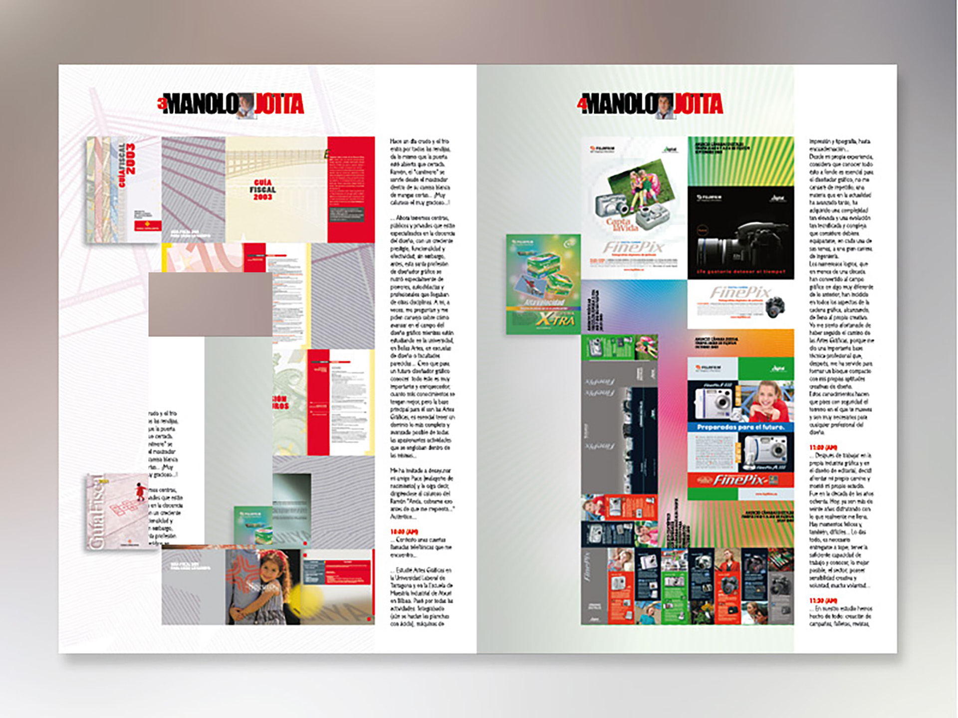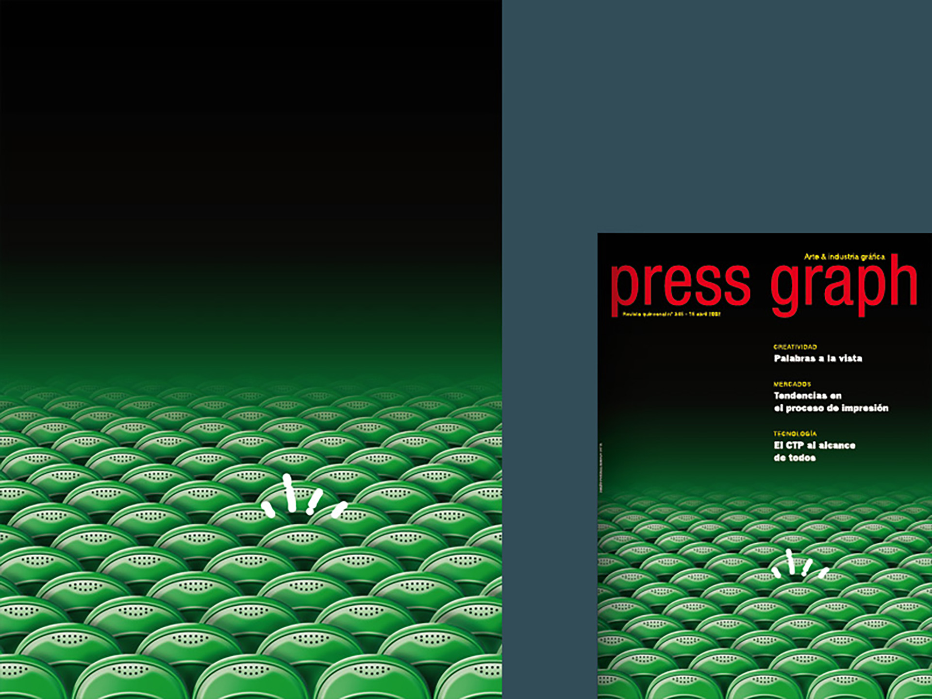 Allà pel mes de febrer de l'any 2002, vaig rebre una trucada de Tomàs Forns, de la redacció de la revista Press Graph (la revista dels professionals de la indústria gràfica i la comunicació impresa) • Volia fer-me una àmplia entrevista (set pàgines) i em va demanar una il·lustració per a cadascun dels dos nombres a publicar al mes d'abril de el mateix any • Coincidint aquest mes amb la festa de la rosa de Sant Jordi, vaig recrear les il·lustracions amb motius rabiosament actuals de al moment. L'ecologisme i la tecnologia punta a el servei de la popular festa • Per aquella època (2003), la revista Artegrafica, concretament en el seu número 6, també va dedicar tot el seu contingut a la publicació de l'obra de catorze dissenyadors made in Catalunya • Cada autor va dissenyar les seves pròpies pàgines. En aquesta selecció, a part d'una àmplia mostra de la producció de disseny gràfic realitzada per l'estudi, destaco la peça d'un autoretrat confeccionat amb topos circulars grans • Molts cercles de diferent to, però, cada un d'ells, per separat, d'un mateix color.