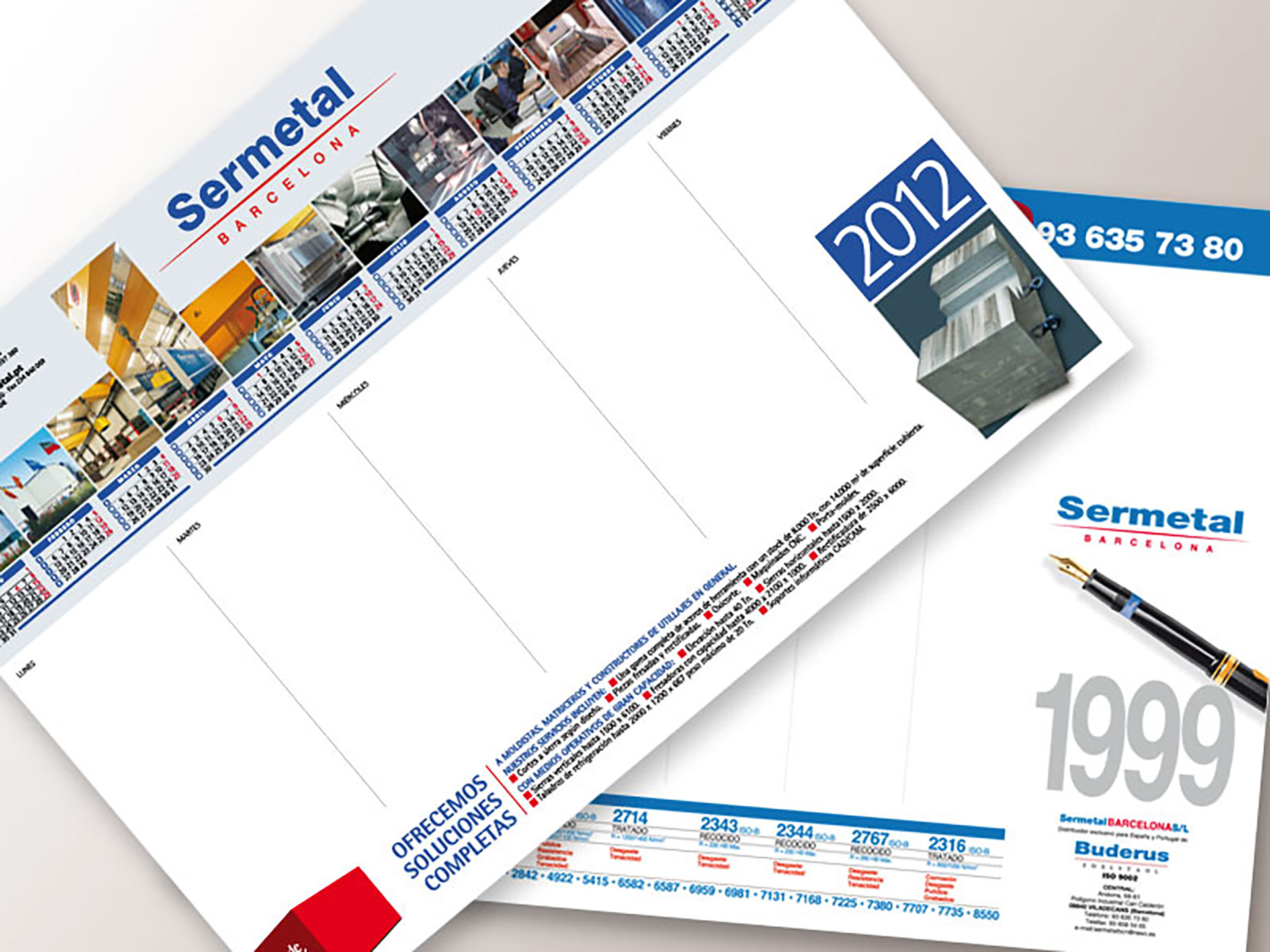 Calendaris de sobretaula que es van realitzar cada any desde 1986 fins a 2012, arribant a ser una peça clàssica a sol·licitar cada any per tots els clients de Sermetal Barcelona • Format del calendari: 485 x 340 mm, en blocs de 53 fulls setmanals.